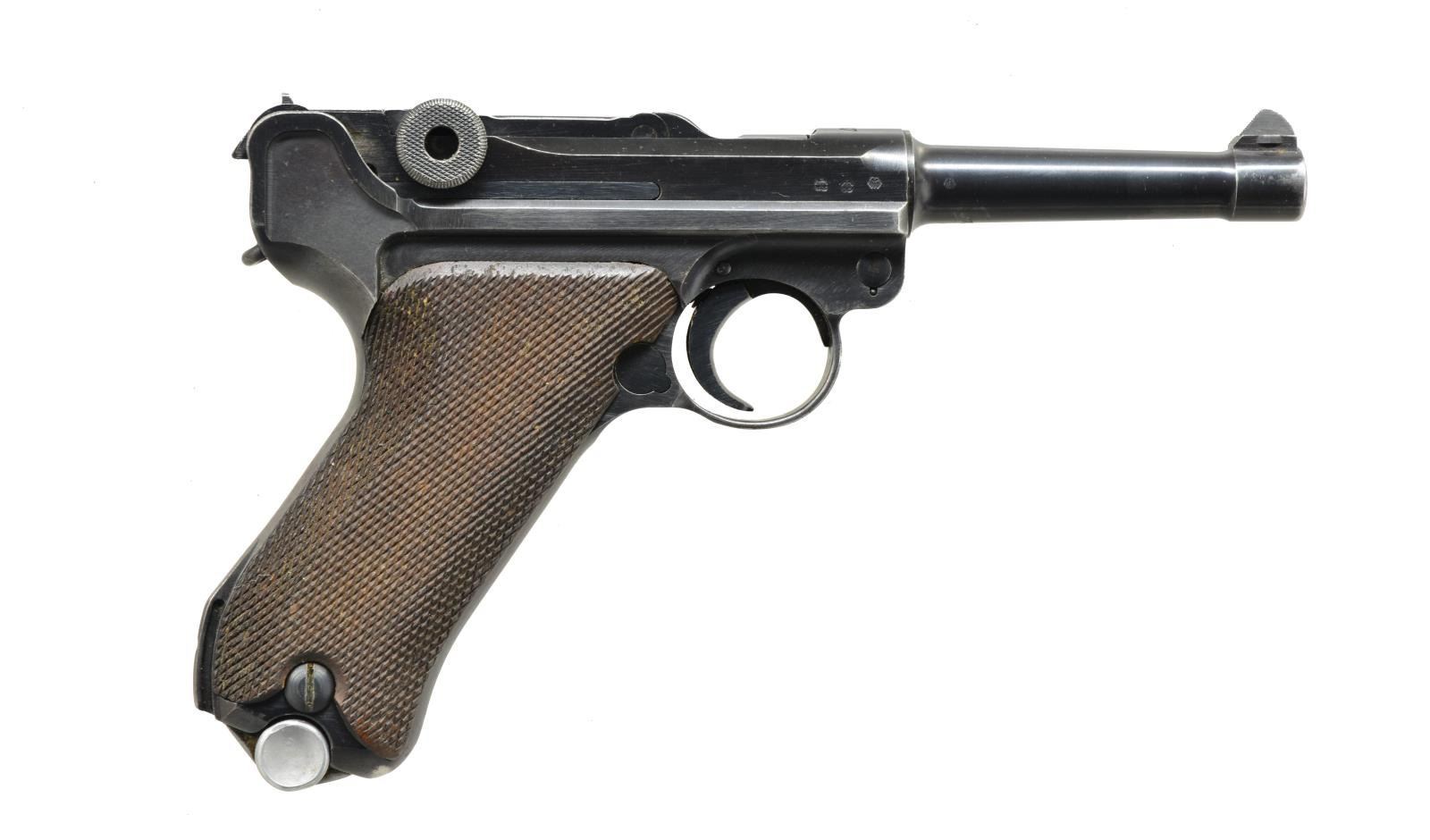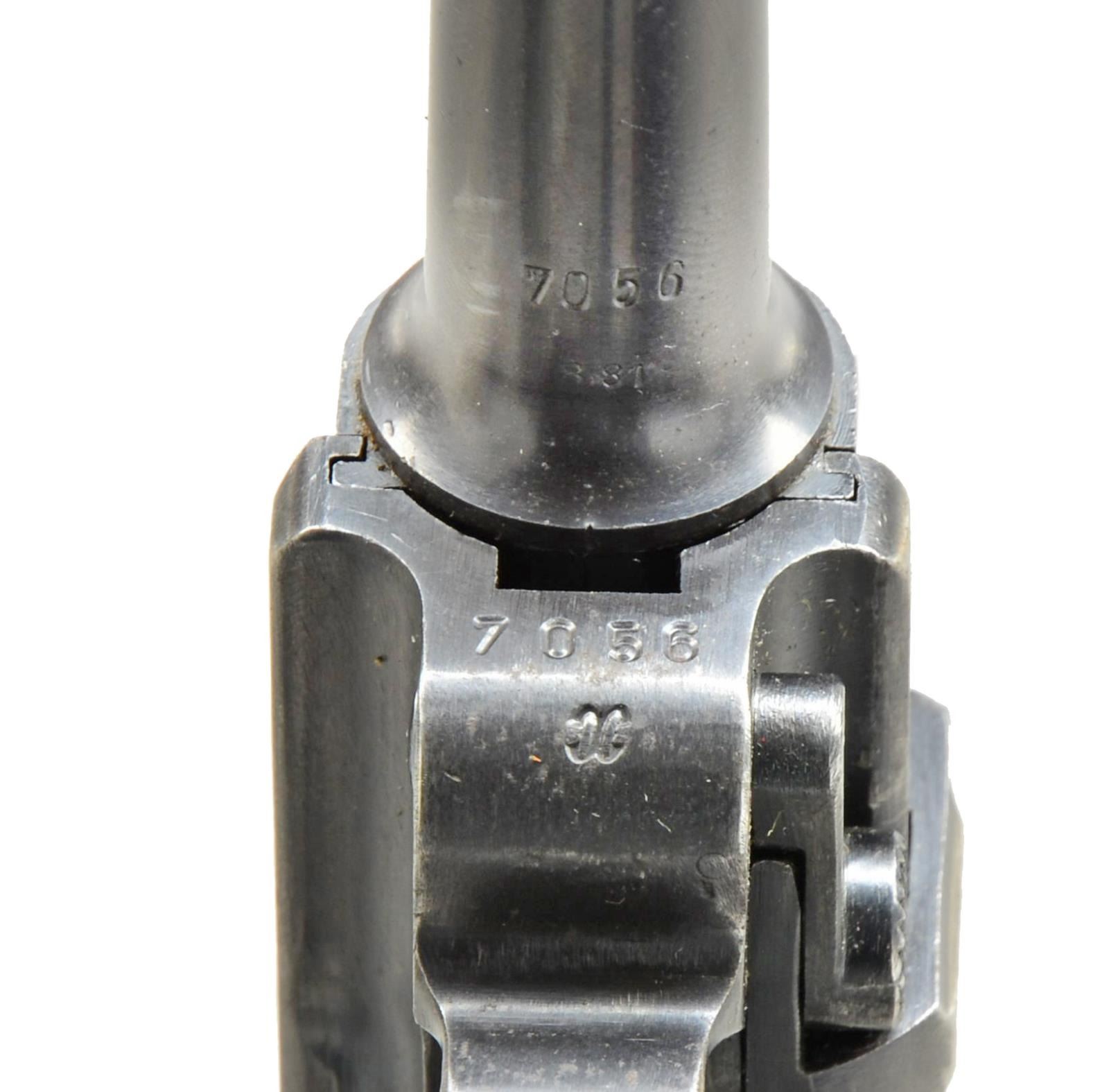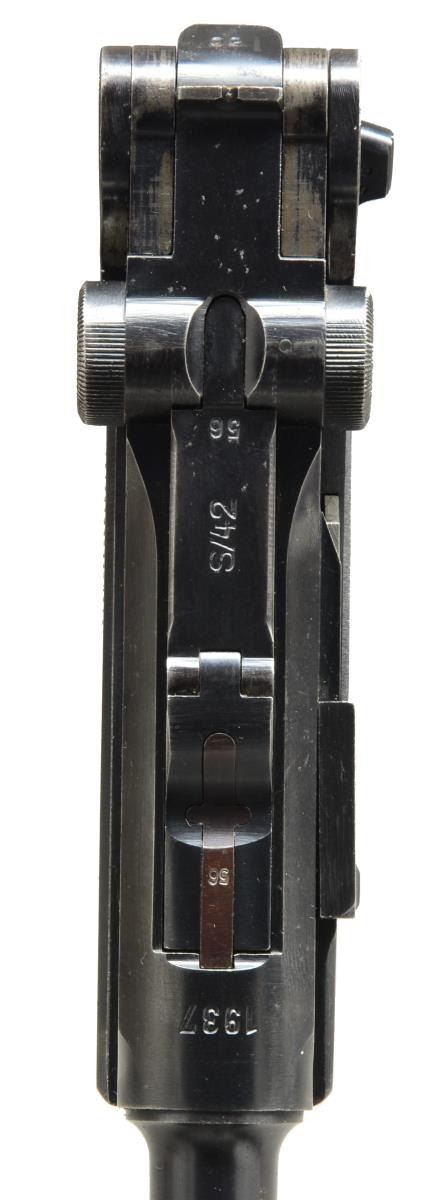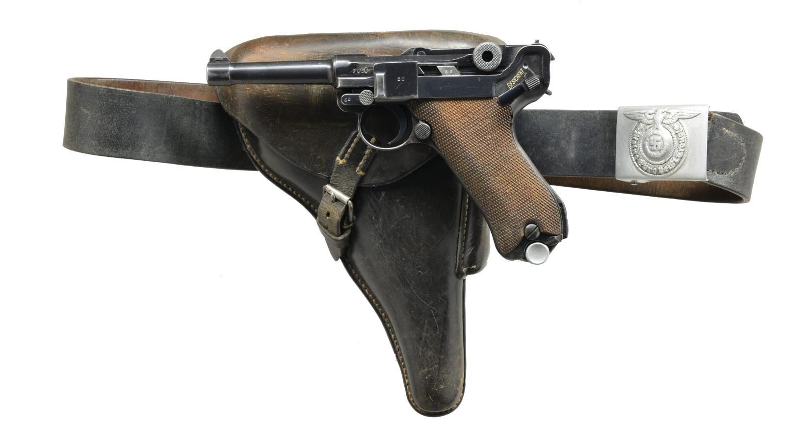 Cal. 9mm Luger. S# 7056x. Bbl. 4". Mfg. 1937 w/ late finish for German military sales. Approx. 89,000 mfg. w/ proper all blue finish from S# 1501t to 400b. Toggle marked S/42. All matching #s to include rear toggle pivot & grips. Frame w/ stock lug. MAGS: 2 very good blued 8 rd. w/ matching aluminum bases # 2272q & eagle "63" proofs & addition of "+" on one. UNATTACHED ACCESSORIES: very good black flap holster w/ buckle & strap retention; no loading tool. Back marked "RYFFEL&ABORNS/HANOVER/1936" over drop wing eagle proof. Waist belt w/ barely visible ink marks on back but SS lightening bolts visible. Set for approx. 36" (range appears to be 33-38; back sides of ends marked 95 outer & 18 inner) waist; back side of matte silver buckle has RZM emblem, "822/37" & circled SS lighting bolts. Light fading on upper portion of holster flap w/ balance of rig definitely appearing very good. CONDITION: very good appearance w/ typical holster high point wear. Grip straps have pinprick oxidation approaching patina appearance. Occasional spots of pinprick oxidation around lower front of frame & trigger guard. Other minor spots of pinprick oxidation throughout. Very good grips w/ slight diamond top wear on left from holster & occasional faint mark. Good to very good bore w/ occasional spots of frosting & very light pitting. Finish appears original including all markings such as eagle "63". (21-1652/NW). CURIO. $1,500-2,250.