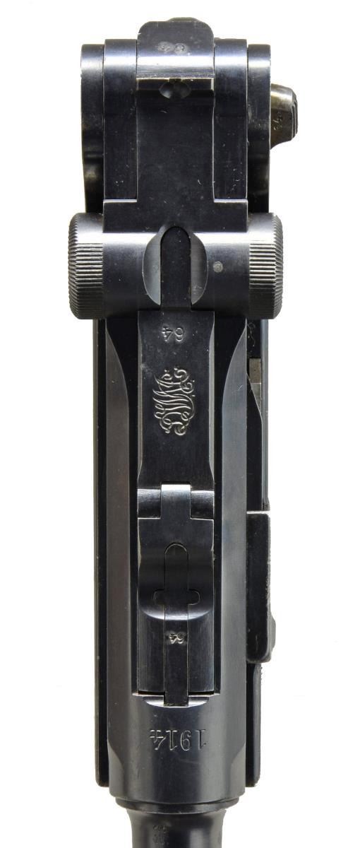 Cal. 9 mm Luger. S# 8464. Bbl. 4" w/ fin shaped front sight. Chamber dated 1914; approx. 35,000 units. Trigger numbered 03, all other components matching numbered including grips. Blued w/ stock lug, strawed sm. parts & multiple receiver proofs plus appropriate internal areas in the white. MAGS: good tin plated 8 rd. w/ light gray tone having unmarked wood base; no proofs on body. CONDITION: very good appearance w/ light typical high point wear most noticeable on sideplate. Very nice straw colors. Occasional sm. spots of very light pitting. Faint scratch on left flat area. Very good to excellent grips; especially well fitted. Fair bore w/ wear & dark, light to moderate pitting in grooves. (21-1386/NW). CURIO. $1,000-1,500.