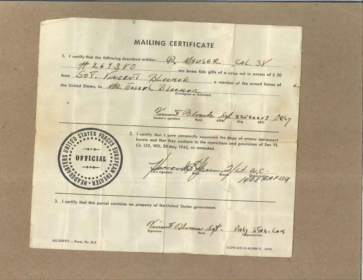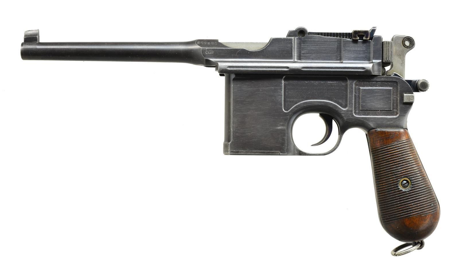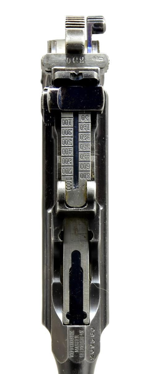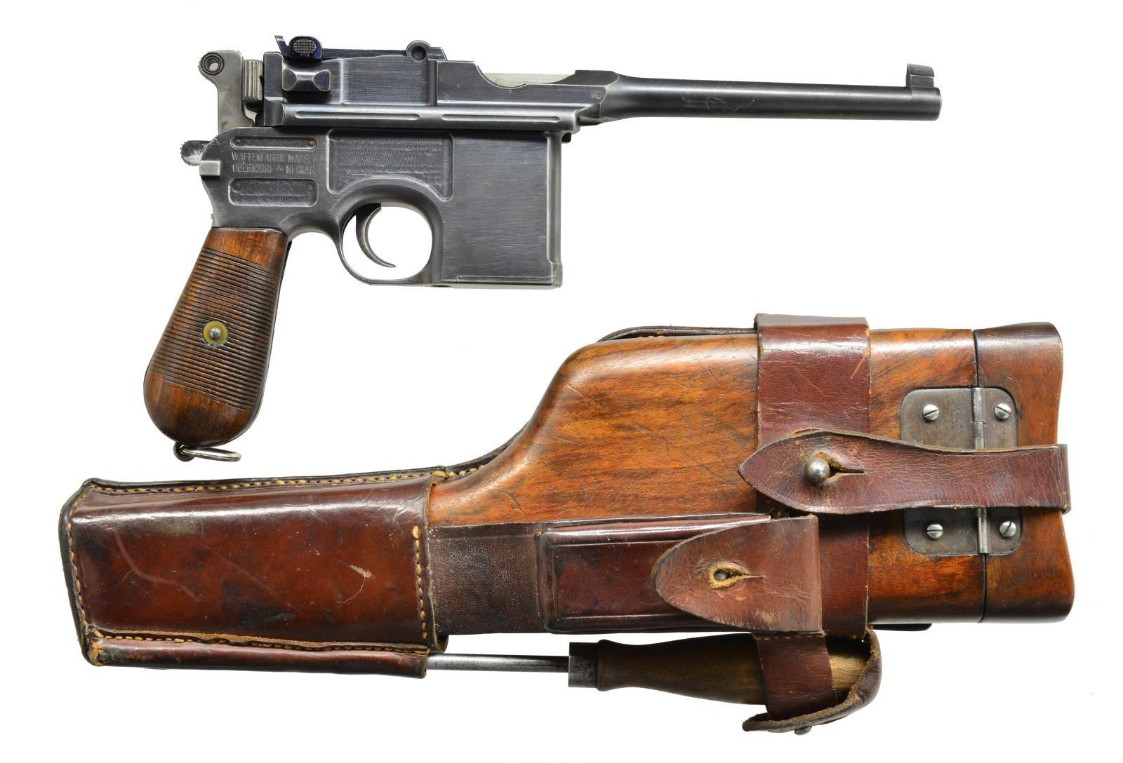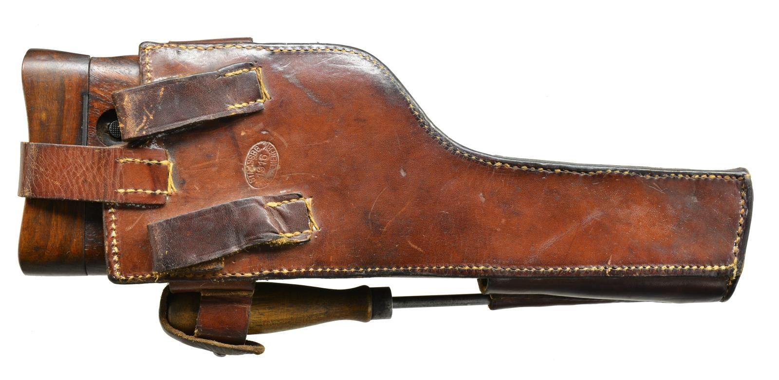 Cal. 7.63mm (30 Mauser). S# 269380. Bbl. 5 1/2" w/ Mauser legend over chamber. Mfg. near end (274,000) of prewar period w/ 6 groove rifling. Mauser legend on frame flat above right grip. Matching numbered parts including floorplate & 33 groove grips. Appropriate fire blued parts & 50-1000 rear sight. No visible import marks. Lightening grooves on receiver rails & crown U proofs. Proper New Safety ring hammer. UNATTACHED ACCESSORIES: exceptional matching # shoulder stock w/ traces of fire blue on components; light finish loss on stock iron & beginning patina tone to hinge. Especially good latching butt w/ nice fit. Matching leather holster w/ very good correct cleaning rod. Multi folded bring back paper listing from Sargent Vincent Bloomer to Mr. Joseph Bloomer. Approved by 2nd Lieutenant (appears to be) Howard E. Speen. Undated form has 12-45 preprinted along w/ No. 33A. Cal. listed as 38. Multi-folds conform to fit in front pouch of holster that usually carries stripper clips. Back of holster in oval has makers name of "STROSSBG/1916/TR??BRNE MENFRK". Holster assembly has some shine to lower portion & worn through leather corresponding to cleaning rod tip yet overall condition borders on astounding as does the matching stock. CONDITION: wonderful collector example in superb condition w/ minimal areas of high edge wear. Bright vivid fire blued components. Near excellent grips w/ only mild hand wear. Near excellent bore. Bright polished top of follower plus bolt face & firing pin end exhibiting minimal use. Marvelous collector example. Seldom seen matching # Rig from prewar period w/ bonus of capture paper. (21-1573/NW). CURIO. $2,000-3,000.