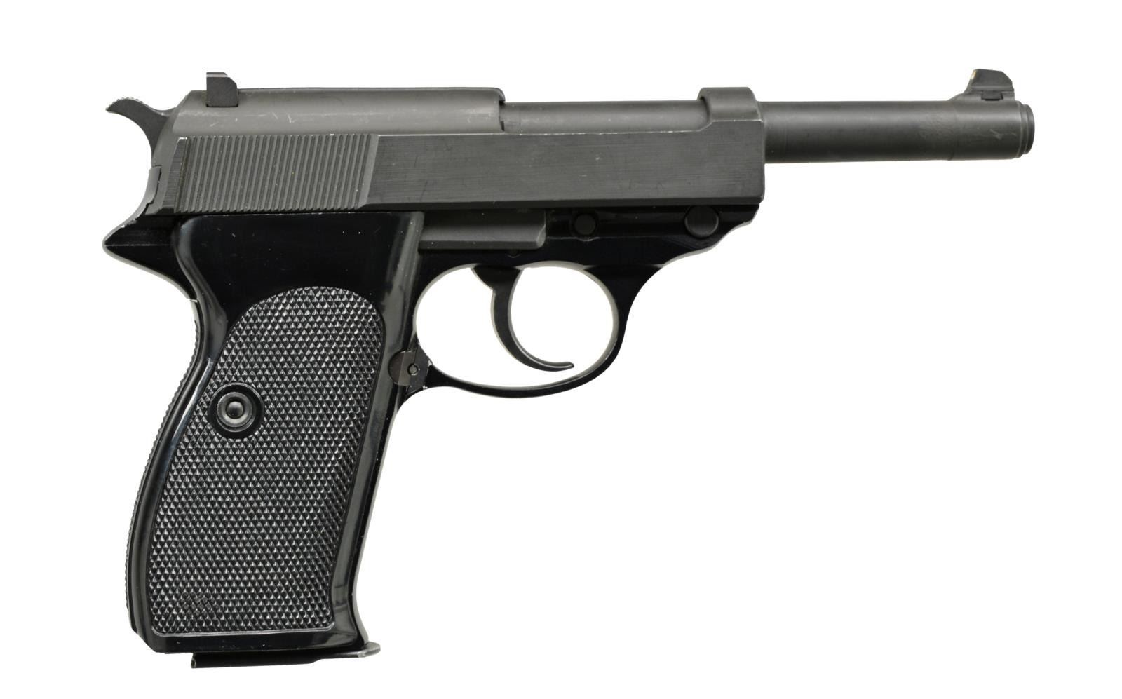 PISTOL. Cal. 9mm Luger. S# 5. Bbl. 5". Pistol has most standard P1 features & markings except S# 5 is stamped inside frame just forward of frame recoil reinforcement bar plus push button mag. release at rear of trigger guard. Left side of slide has circle dot proof at front followed by Walther banner & ends w/ "P1 Kal. 9mm" over "5/76" & 4 pointed star. Safety markings are white "S" & red "F". Pistol void of any other numbers or proofs. Square faced front sight has recessed white dot & "4" on left side; rear sight has inset white bar below wide squared notch. Standard checkered black plastic P1 grips w/ cut out for its lanyard loop, thumb position for RH use & relieved for push button mag. release. Bottom left side of frame between grip & mag.-well opening has Simpson Ltd. import mark. MAGS: 1 commercial Walther 8 rd. w/ bottom left having Walther banner plus "P38 9mm". Modern follower w/ dbl. reinforcing grooves. Notch for latching mag. formed w/ end mill of 11/64" diameter to depth of 7/64" from side of body. Upper 3/4 of mag. polished to in the white; remainder of body polished blue w/ push button floorplate matte finished (no witness marks from regular P38 latch). CONDITION: all aspects near excellent including bore & grips. PROVENANCE: Ex Hen Visser Collection; Ex Dr. Geoffrey Sturgess Collection. (20-340/NW). MODERN. $2,500-4,500.