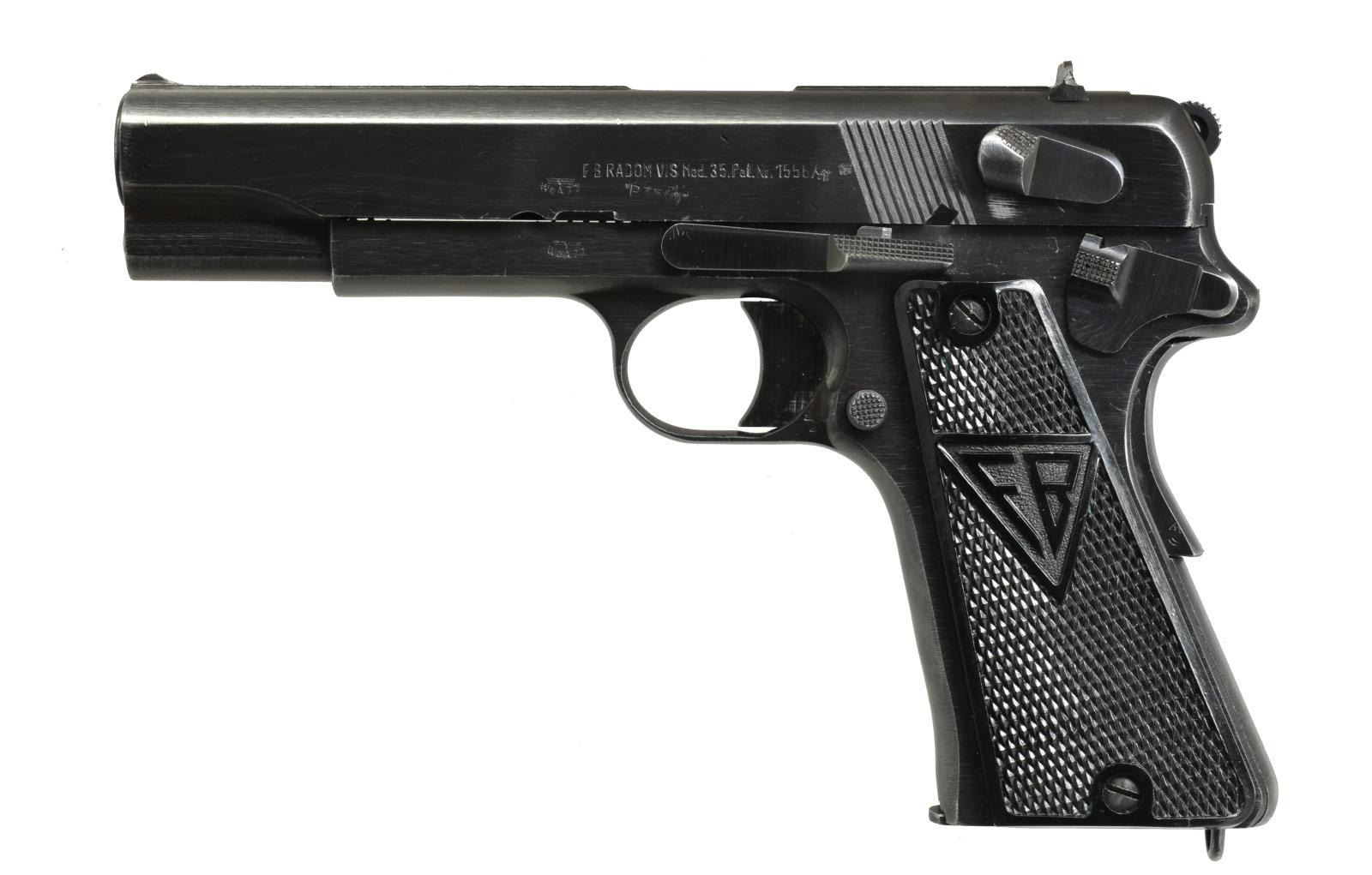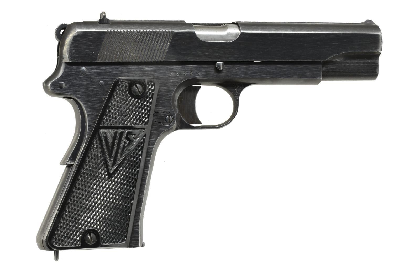 Cal. 9mm Luger. S# H5969. Bbl. 4 3/4". Type II w/ 3 levers & no stock slot having salt blued finish w/ traces of milling marks. Slide originally marked "Mod.35" w/ "P35(p)" added. Matching numbers on frame, slide & bbl. German proofs of "WaA77" on slide & frame; bbl. w/ eagle "623". Checkered black plastic grip w/ "FB" on left & "VIS" on right. MAGS: 1 very good 8 rd. w/ rub mark caused by mag. latch plus "RWS" scratched on base. CONDITION: very good plus appearance w/ minimal high point wear. Near excellent grips. Very good bore w/ very faint hint of frosting. (21-1380/NW). CURIO. $800-1,200.