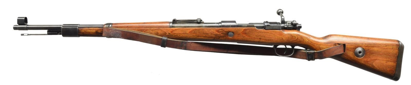 Cal. 8mm Mauser. S# 6739a. Bbl. 23 3/4". All visible numbers match. Receiver marked on left side "Mod98". Receiver marked on top "ar" "43" "Waffenamt 38". Tangent rear sight graduated to 2000m. Inverted "V" front sight w/ protective hood. Cleaning rod & bayonet lug are present. Bbl. bands & trigger guard are milled. Upper band is solid type. Cup type buttplate. Steel takedown hole. Laminated stock set. Israeli leather sling. CONDITION: rifle has been professionally cleaned rendering stock markings obscure. Metal finish has been enhanced but remains thin w/ light wear & handling marks. Very good shiny bore. (21-999/RW). CURIO. $900-1,200.