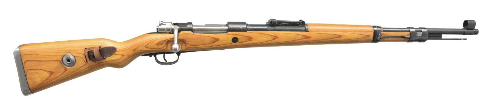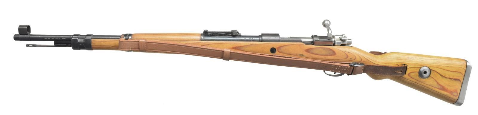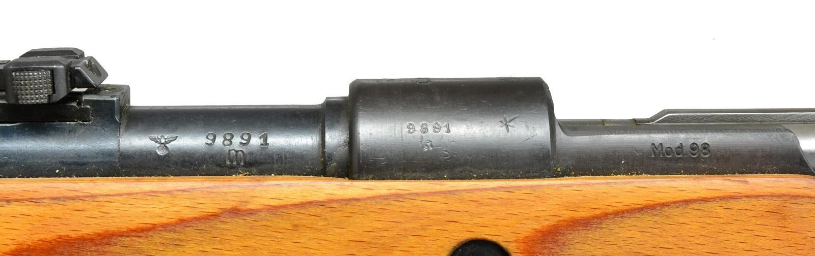 Cal. 8 mm Mauser. S# 9891m. Bbl. 23 5/8", import marked on left side. All visible numbers match. Rifle is restored "Russian capture" w/ "X" marked on left side of receiver ring & German markings partially obliterated. Receiver marked on left rail "Mod 98". Receiver ring marked on top w/ "Waffenamt WAA???" "dou" "44". Bbl. marked over chamber w/ "E" "K" "dou". Tangent rear sight graduated to 2000m. Inverted "V" front sight w/ protective hood. Cleaning rod is present. Furniture is milled except for cup type buttplate & takedown hole. Laminated stock set marked only w/ S#. Reproduction leather sling. CONDITION: entire rifle has been given arsenal rework finish, wood & metal are near good to excellent w/ scattered sm. handling marks. Bolt is polished bright. Near excellent shiny bore. (21-1475/RW). CURIO. $600-900.