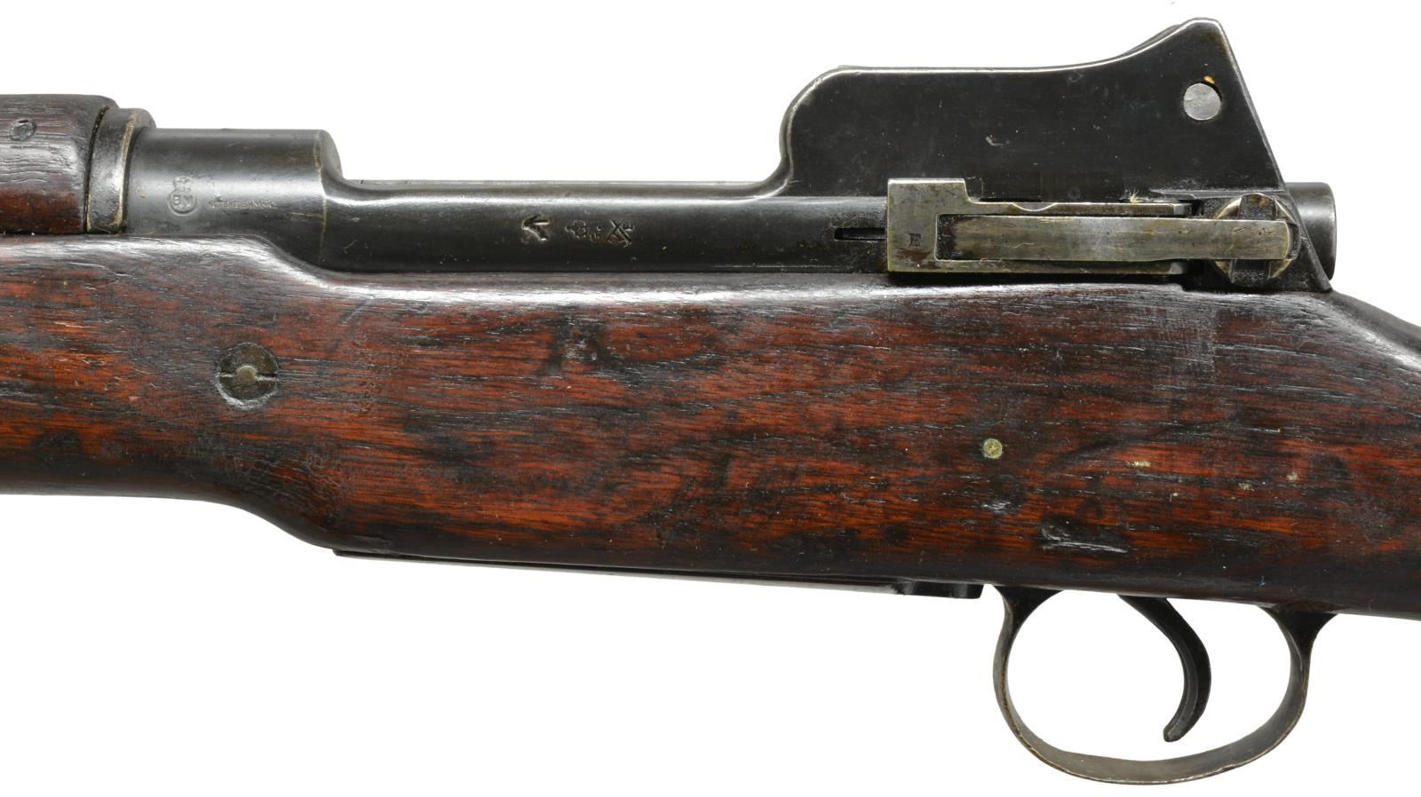 RIFLE. Cal. .303 British. S# 156128. S# matches on bolt & receiver. Bbl. 26". Receiver marked on left rail w/ broad arrow & "view" marks. Receiver ring marked on left side w/ "(crown) / BN" & "NOT ENGLISH MAKE". Receiver ring marked on right side "ERA. Ladder aperture rear sight marked to 1650yds. Blade front sight w/ protective ears. Cocking piece marked "W". Rear sight & bolt stock marked "E". Walnut stock set. Volley sight has been removed leaving mounting plate. Military type leather sling. Smooth trap buttplate. CONDITION: stock set has moderate wear, staining, dents & scratches commensurate w/ long service. Marking disk has been replaced by inletted wood. Metal has 50% original finish w/ light wear & scattered oxidation. Rear sight pivot screw has been replaced w/ pin. Good shiny bore w/ sharp lands. (21-652/RW). CURIO. $300-500.