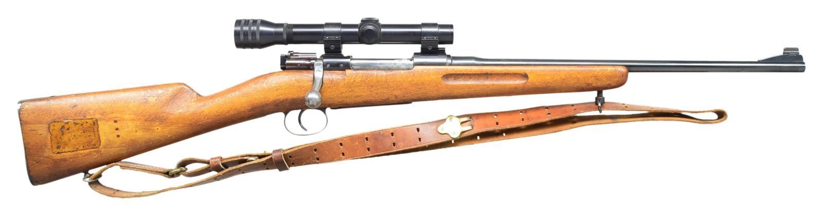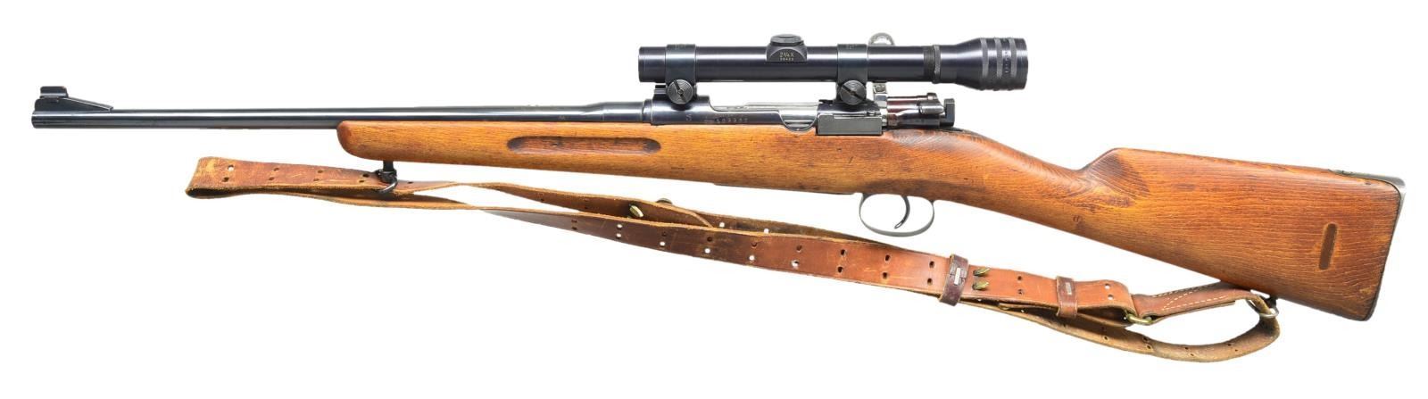 Cal. 6.5x55 (muzzle centerboard). S# HK109957. Bbl. 18 1/2", fitted w/ ramp front sight. 1896 type, small ring action has "Carl Gustaf" marked on receiver ring. Weaver scope bases have been fitted & bridge has been drilled & tapped for receiver sight. Matching numbered bolt has handle bent for scope use. Matching bottom metal is retained. Trigger guard bow is slimmed. Cut down original stock retains steel buttplate w/ matching number. Rifle is mounted w/ Koll Morgen "BEAR CUB" 2 3/4X scope w/ crosshair reticle in Weaver rings. A brown leather sling is attached. CONDITION: good. Metal parts retaining over 90% reblue w/ details slightly distorted from polishing. Stock w/ most of oil refinish after shaping has sling attachment area filled w/ plastic wood. Scope is fine, optically just a touch clouded. Good to fine bore, somewhat dark. Mechanically good. (21-1181/MGM). CURIO. $150-250.