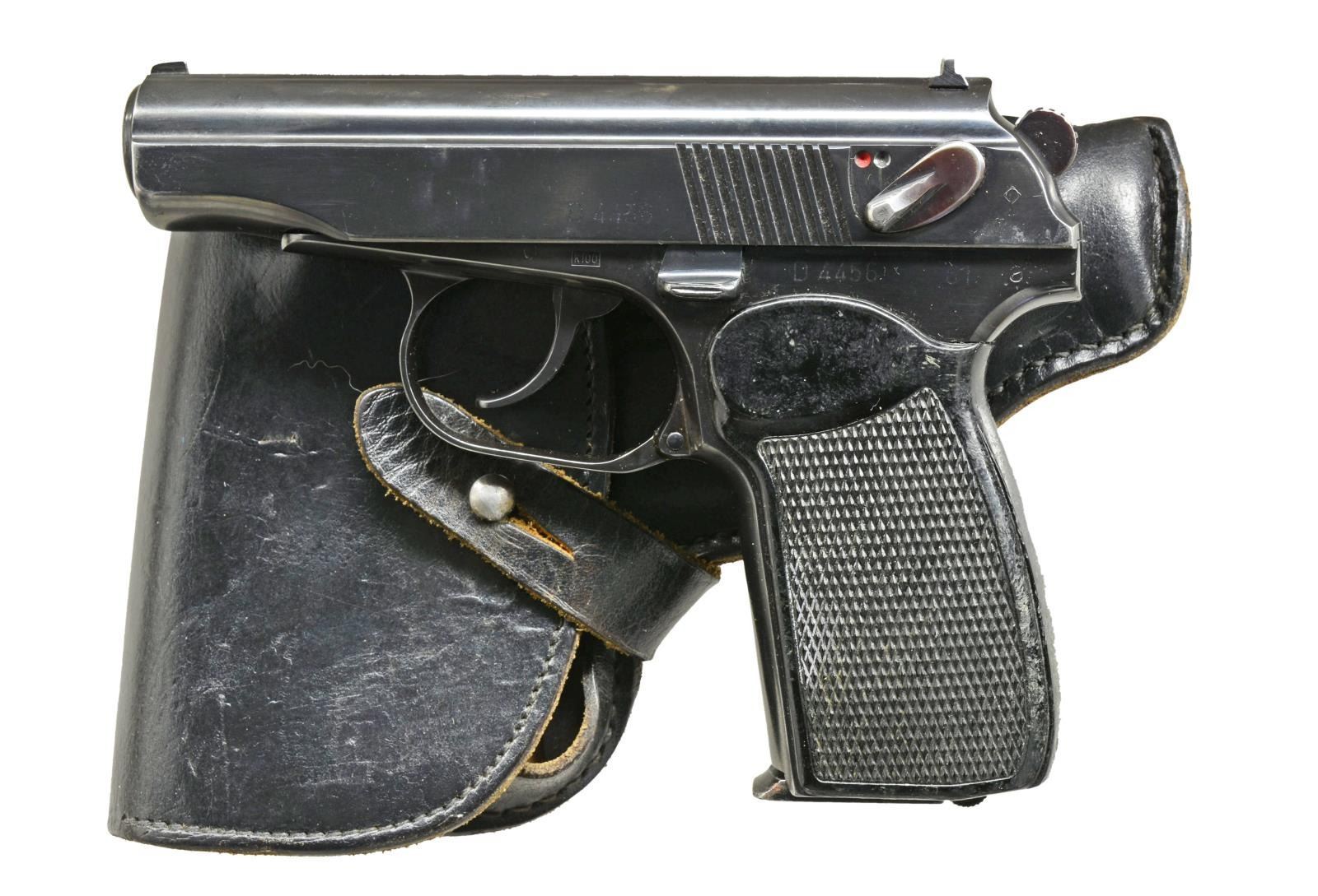 1) Cal. 9x18 MAK. S# C7186. Bbl. 3 3/4". S#'s match on frame & slide. Import marked on right side of frame. Fixed sights. SA/DA. Left side of frame marked w/ circle in diamond indicating East German mfg. Boxed "K100". "60" & letter "Y" w/ circle of dots. Brown composite grips w/ thumb rest, checkering & stars. MAGS: 2-8 rd. CONDITION: grips have very light wear & tiny handling marks. Metal has 75% thinning original blue w/ high point wear notable in muzzle area. Very good shiny bore. UNATTACHED ACCSESORIES: white leather holster marked inside in ink "MVA II/G." Holster has scuffing & light discoloration but in good serviceable condition. (21-794/RW). 2) Cal. 9x18 MAK. S# D4456. Bbl. 3 3/4". S# matches on frame & slide. No visible import markings. Frame is marked on left side w/ circle in diamond indicating East German mfg. Boxed "K100". "61" & letter "Y" w/ circle of dots. Slide is additionally marked w/ circle in diamond behind safety. Fixed sights. SA/DA. Checkered composite grips. Grips have additional sm. hole at rear between retaining screw & butt. MAGS: 2 non-matching 8 rd. UNATTACHED ACCESSORIES: black leather holster w/ mag. pouch. Holster marked "MADE IN GERMANY". Includes cardboard shipping box. CONDITION: grips have light wear, worn diamonds & notable wear in backstrap area. Added hole has sm. chipping around edge. Metal has 75% thinning blue w/ high point wear & tiny scratches. Shiny bore but w/ light wear to lands. Holster has light wear, scuffing & scratches, but appears in good serviceable condition. (21-795/RW). BOTH CURIO. $600-800.