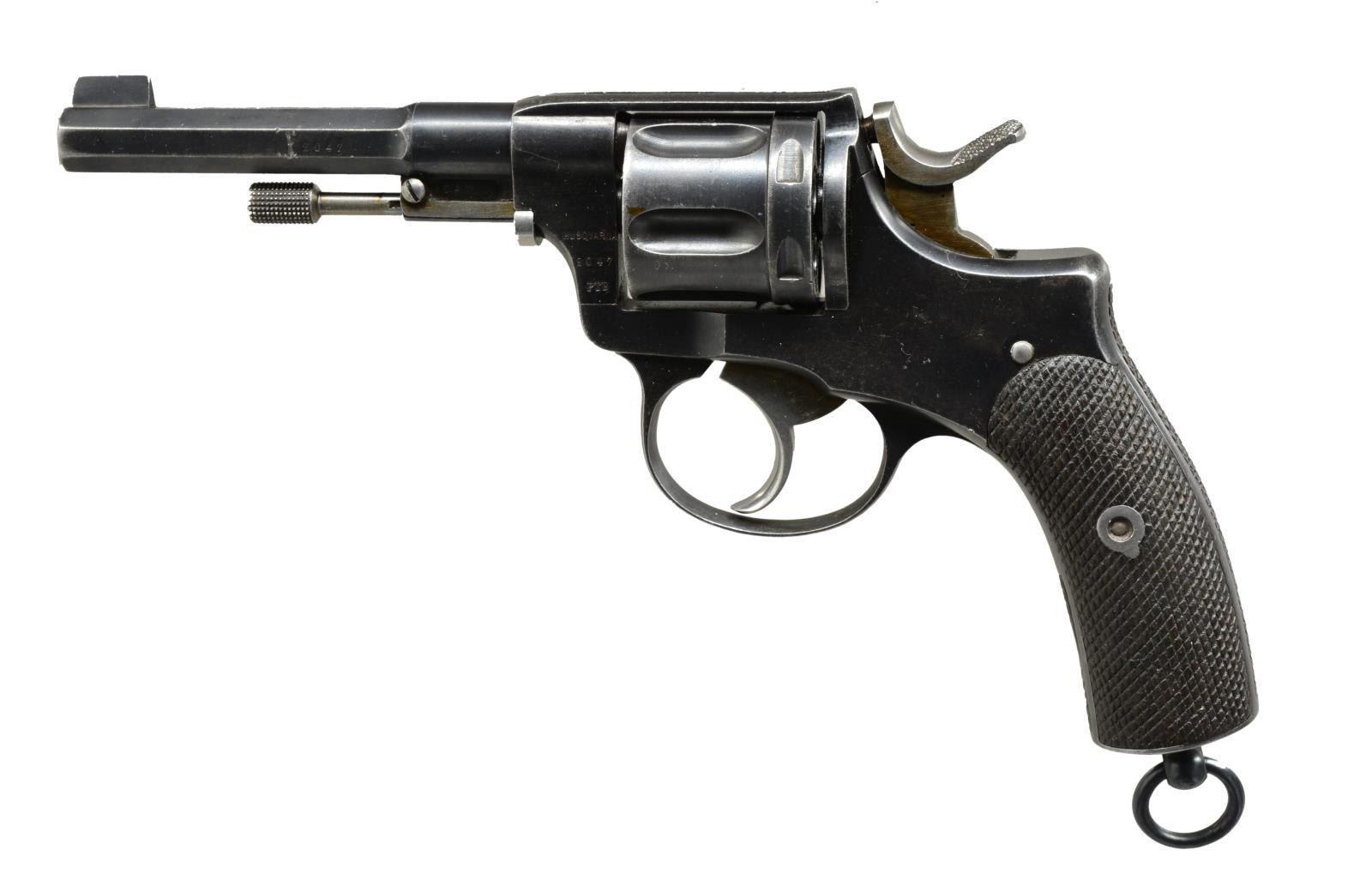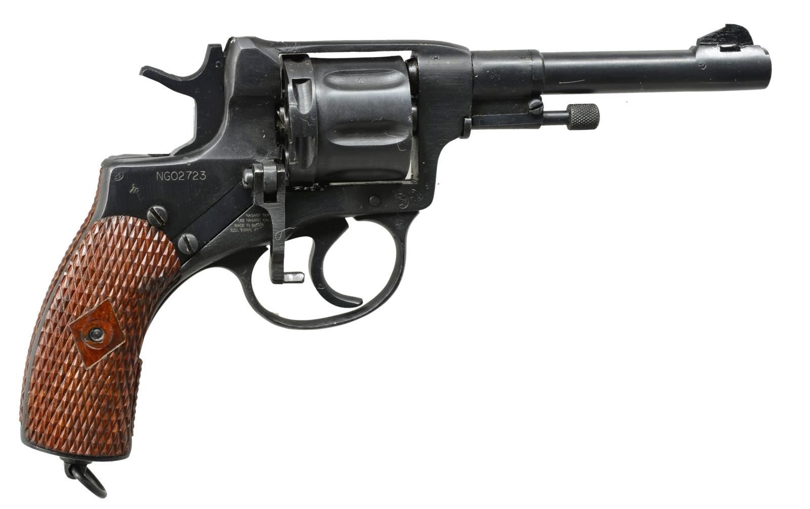 3) RUSSIAN 1895 NAGANT. Cal. 7.62 Nagant. S# NGO2723. Bbl. 4 1/2". Fixed sights. SA/DA. 7 Shot cyl. Revolver is so called "gas seal" design. Mfg. between 1895-1947. Original S# which appears "BN 315" matches on frame, cyl., & trigger guard. Import marked on right side of frame. Frame marked on left side below hammer w/ arrow in star, indicating mfg. at Tula Arsenal & dated 1941. Revolver has numerous scattered acceptance & overhaul marks. Brown checkered composite grips, inlcuding front & backstrap. Lanyard ring on butt. UNATTACHED ACCESSORIES: 7 shot accessory cyl. which accepts 32 ACP cartridges & instruction papers to change cyls. Also has cardboard storage box. CONDITION: grips in very good condition. Metal work retains 90% arsenal rework blue finish w/ very light wear & handling marks. Replacement cyl. in very good condition. Near excellent shiny bore. (21-936/RW). CURIO. $800-1,100.