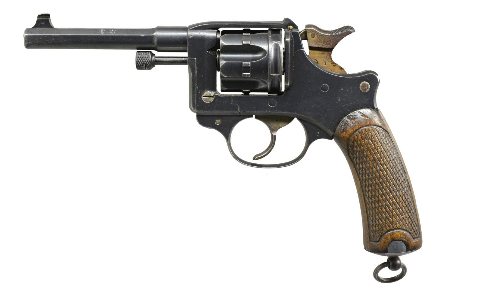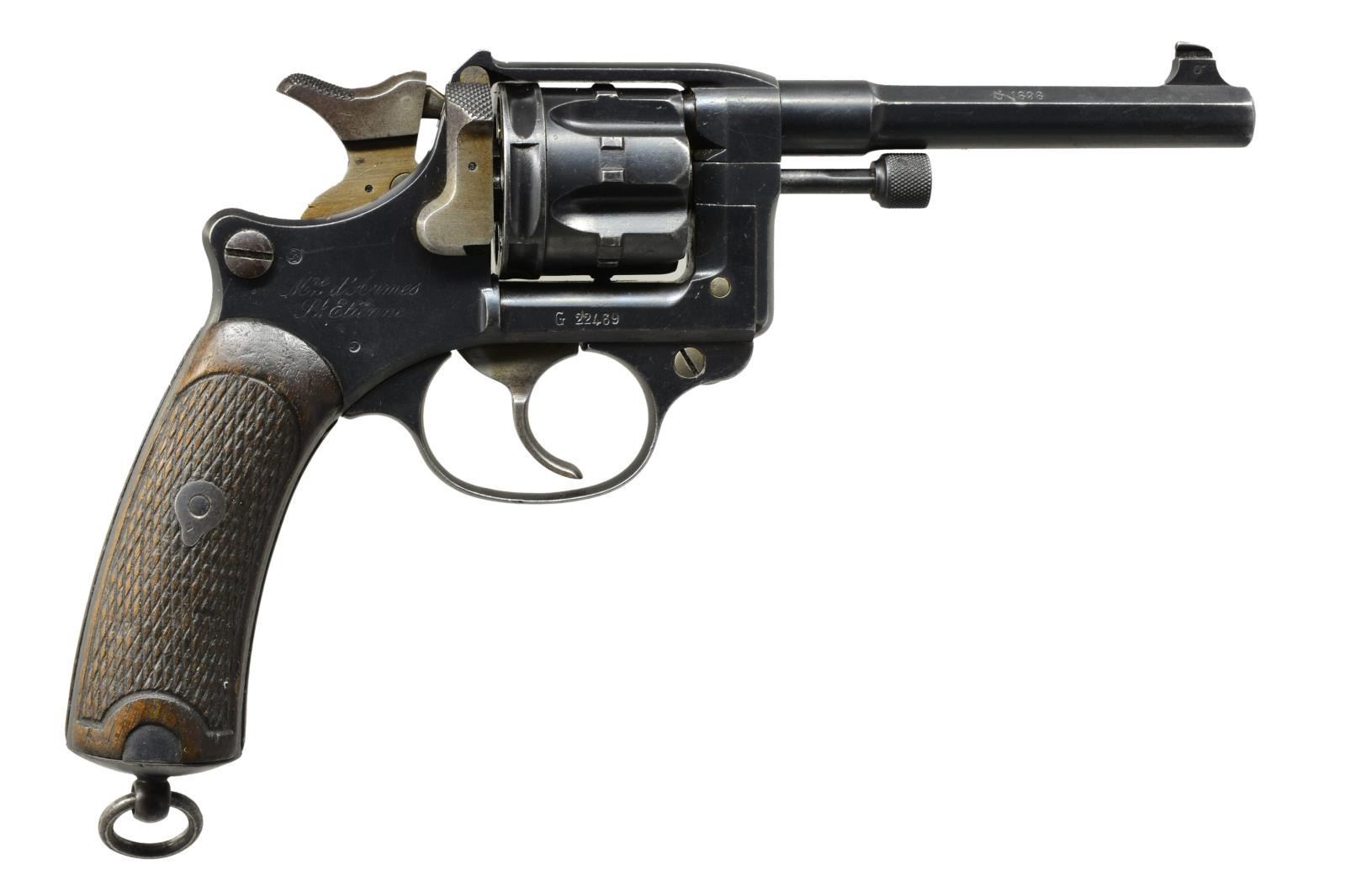 2) FRENCH MODEL 1892. Cal. 8mm Lebel revolver. S# G22469. Bbl. 4 5/8". Fixed sights. SA/DA. Frame marked on right side in script "Mfg d'Armes St Etienne". Bbl. marked on top flat "MLE 1892"; adjacent flat dated "S1898". 6 Shot cyl. Checkered wooden grips, lanyard ring on butt. UNATTACHED ACCESORIES: cardboard storage box. CONDITION: grips are worn w/ flattened diamonds w/ moderate handling marks. Metal has 80% arsenal rework blue finish. Over scattered fine pitting. Casehardened parts retain traces of color, but have peppery oxidation. Bore has darkened appearance w/ scattered fine pitting & lightly worn lands. (01-19404/RW). ANTIQUE.