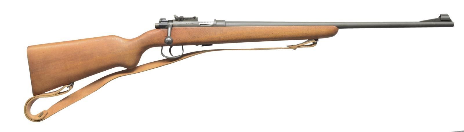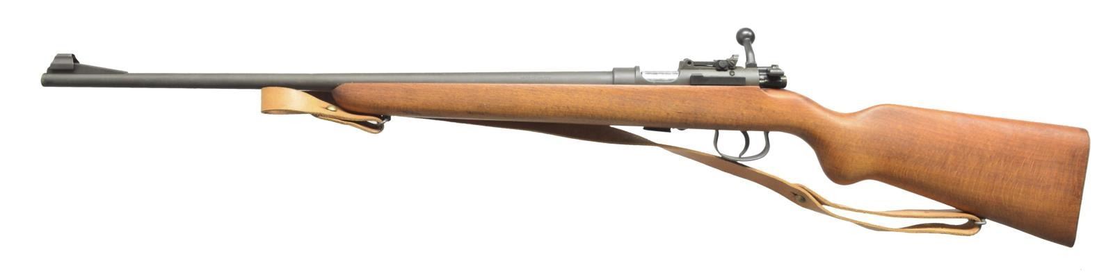 Cal. 5.5mm / 22 LR. S# F31380. Bbl. 24" tapered rnd. Hooded ramp blade front sight w/ 150m tangent rear sight. Gray parkerized type metal finish. Hardwood pistol grip stock w/ steel buttplate. Leather sling on original swivels. French mfg. MAGS: 1-5 rd. CONDITION: over 98% wood & metal finish. Bright near excellent bore. (21-295/DS). CURIO. $700-1,000.