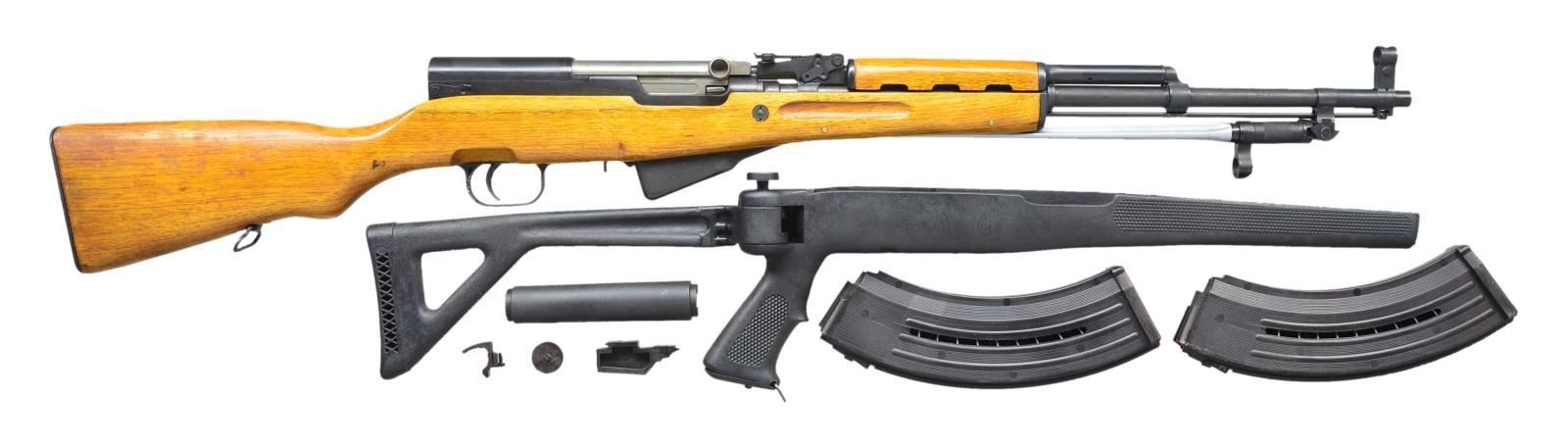STOCK & 30 RD. MAGAZINE CONVERSION KIT. Cal. 7.62 x 39. S# 8805785. Bbl. 20 1/2". All visible numbers match. Receiver marked only w/ S#. Import marked on right side of bbl. Tangent rear sight graduated to 1000m. Post front sight w/ protective hood. Cleaning rod is present. 12" Folding spike bayonet. Hardwood stock set cleaning kit in butt. UNATTACHED ACCESSORIES: black, synthetic folding stock w/ pistol grip & synthetic handguard. Magazine conversion kit included for detachable 30 rd. mags. MAGS: 2-30 rd. synthetic. CONDITION: rifle has attractive appearance w/ very light overall wear & scattered handling marks. Very good, shiny bore. Conversion stock & handguard in very good condition. Conversion magazines appear to be in serviceable condition. (21-1641/RW). MODERN. $350-500.