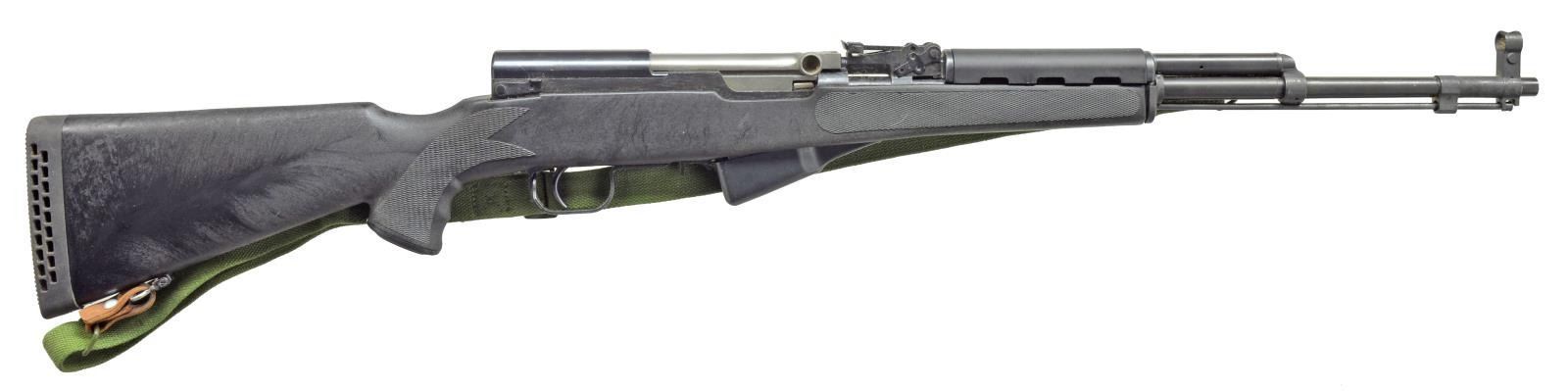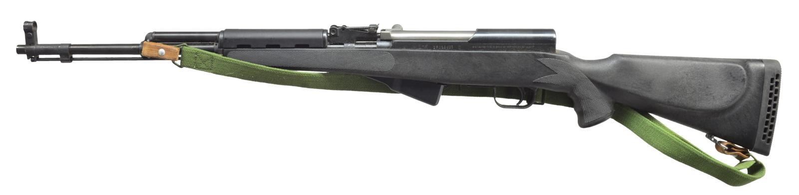Cal. 7.62x39. S# 26014835. Bbl. 20 1/2". Import marked on left side of receiver. All visible numbers match. Receiver has triangle "636" marking. Tangent rear sight graduated to 1000m. Post front sight w/ protective hood. Cleaning rod is present. Bayonet is not present, bayonet mt. has been removed. Stock replaced by unmarked synthetic checkered pistol grip type w/ Monte Carlo cheekpiece & ventilated recoil pad. Green web sling. CONDITION: stock has very good lightly worn condition. Metal retains lg. degree of blued finish w/ light wear & scratches. Very good shiny bore. (21-1669/RW). MODERN. $350-500.