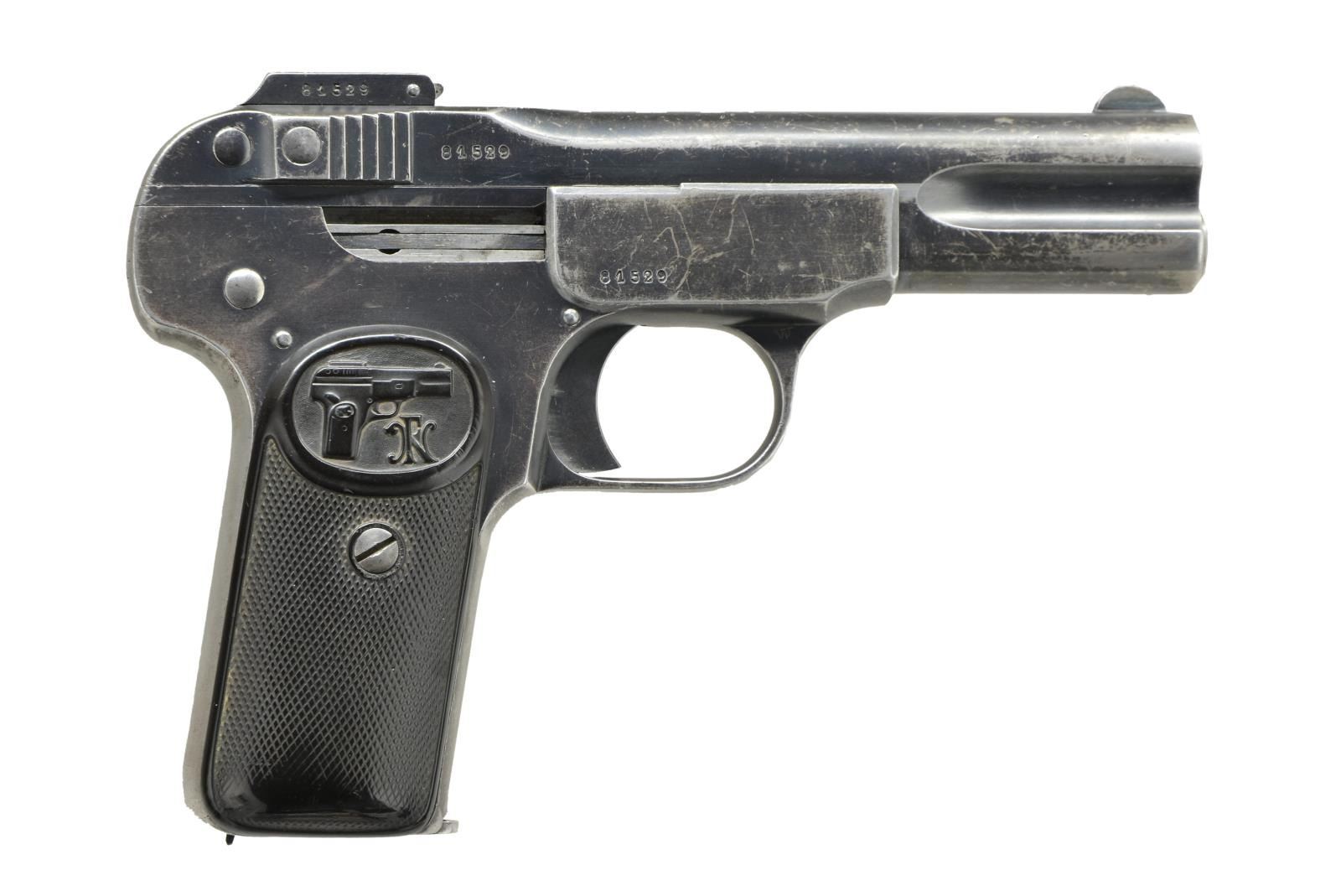 Cal. 7.65mm (32 ACP). S# 81529. Bbl. 4". Semi circular front sight w/ fixed V notch rear sight. Frame, slide & rear sight have matching numbers. Left side of frame has FN Herstal, Liege address w/ Browning patent marking. Frame is marked "BREVETE- S.G.D.G.". Left side lanyard loop & safety. 2 Piece checkered hard rubber grips. Mfg. 1900-1914. MAGS: 1 detachable 7 rd. CONDITION: 60% dull blue fading to spots of gray & showing scattered light scratches & marks. Grips have worn checkering w/ heaviest wear at bottom of right panel. Bore has lightly frosted appearance retaining sound rifling. (21-630/DS). CURIO. $700-1,000.