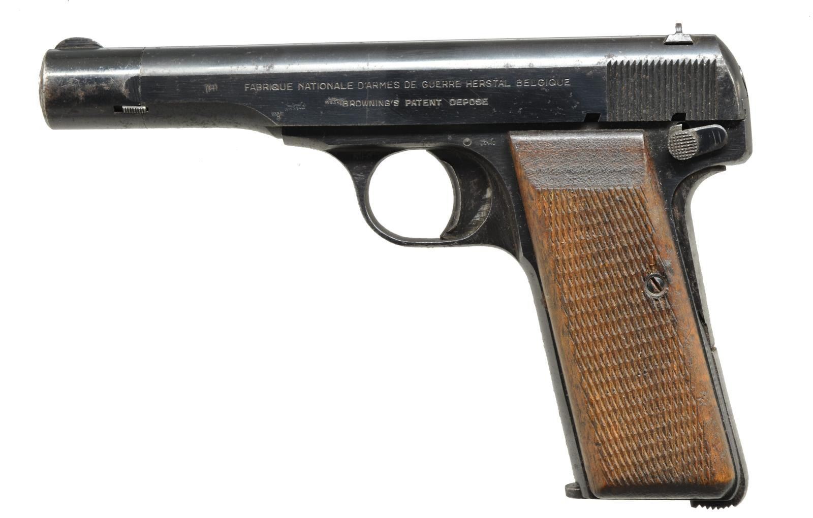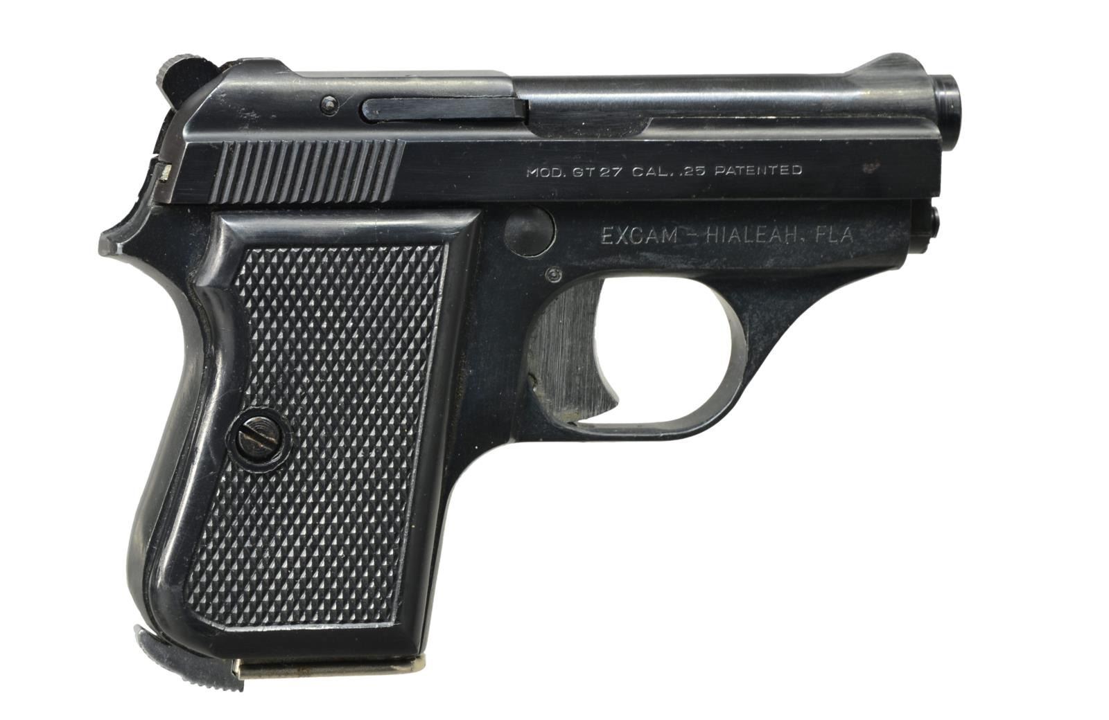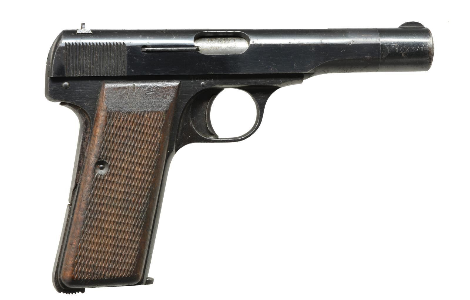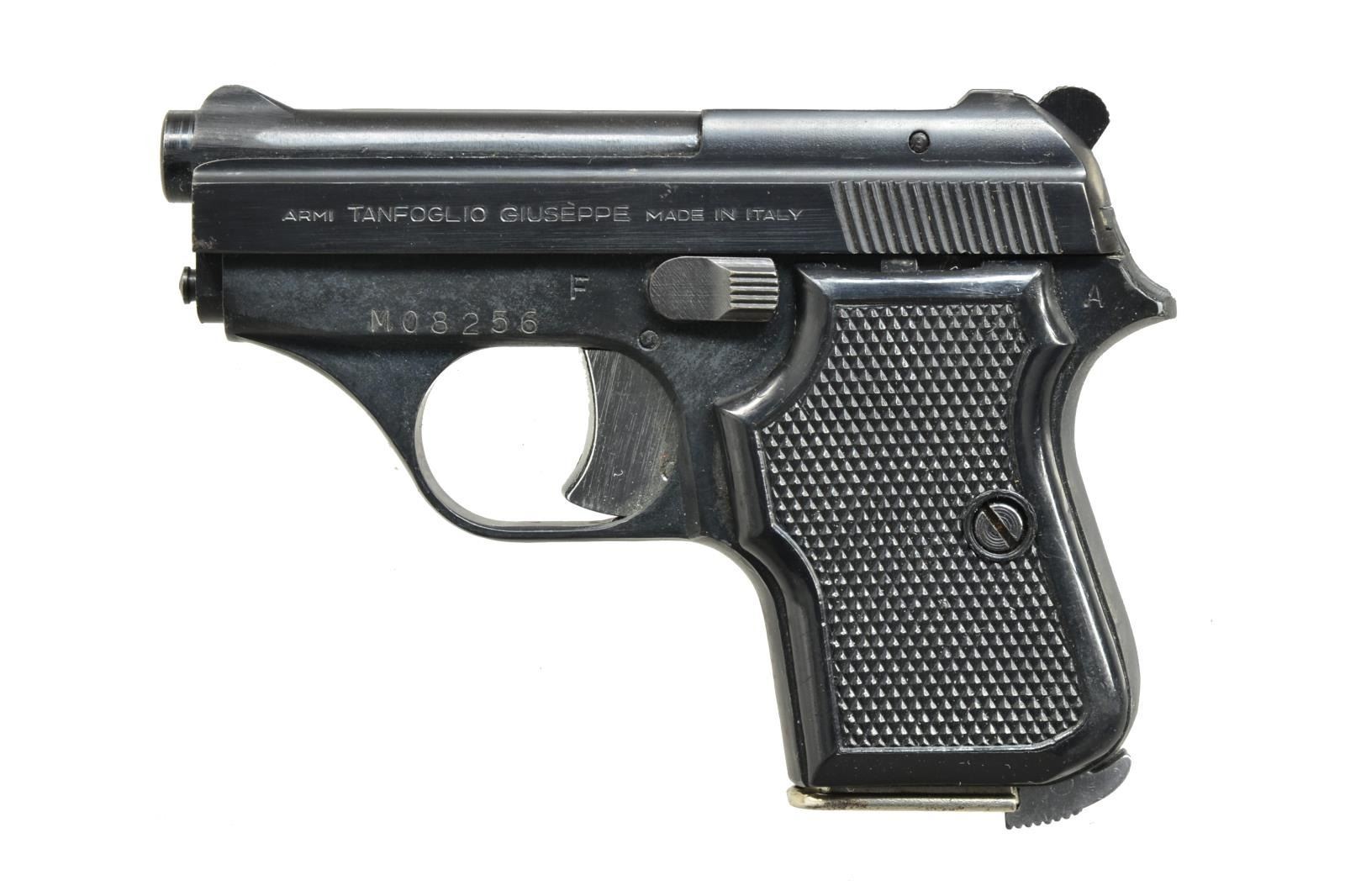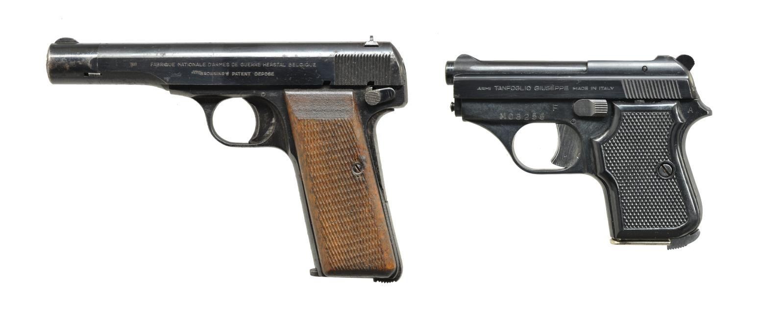 1) FN MODEL1910. Cal. 32 ACP. S# 162371. Bbl. 3 7/16". Mfg. 1912-1953 by FN. German proofs to include eagle party symbol & "WaA140". Matching number frame, slide, bbl. & slide end cap. Standard checkered walnut grips. MAGS: 1 minimal finished 9 rd. CONDITION: light scattered oxidation throughout w/ backstrap mostly in the white from cleaning. Good grips w/ hand wear. Near excellent bore. (21-1347/NW). CURIO. 2) TANFOGLIO MODEL GT27. Cal. 25 ACP. S# MO8256. Bbl. 2 1/2". Imported by Excam of FL whose business ceased 1990. Mfg. in Italy w/ alloy frame having checkered black plastic grips. Silver trigger & mag. latch at base of backstrap. MAGS: 1 good chrome plated 7 rd. w/ staining on base. CONDITION: very good overall appearance w/ occasional very faint peppery oxidation. Near excellent grips & bore. (21-1348/NW). MODERN. $350-500.