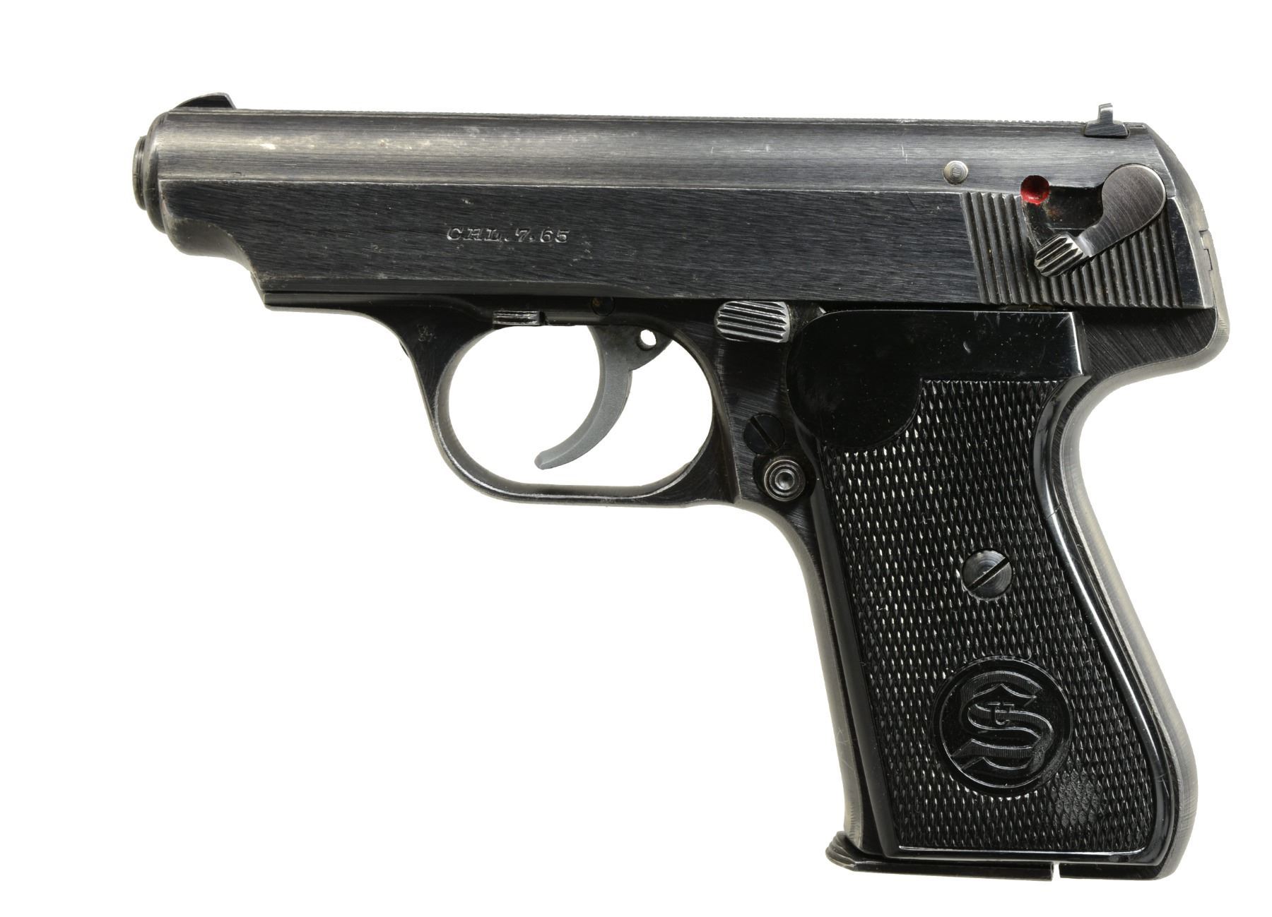 Cal. 7.65mm (32 ACP). S# 439463. Bbl. 3 1/4". Mfg. 1938-1945; type 4 variation made later in the war w/ expedient features of no slide legend, milled unpolished finish & zinc trigger. Left side of slide has cal. marking as does steel base of mag. Matching # slide w/ thumb safety; cocker / decocker on frame. Checkered black plastic grips w/ SS logo on left. Eagle 37 on left front of trigger guard plus eagle N on right rear of slide & frame. MAGS: 1 good late production factory 8 rd. w/ raised metal guide on right side. CONDITION: very good overall appearance w/ scattered high point wear & sm. rub spot on grips by SS logo. Very good plus bore. (21-1709/NW). CURIO. $600-900.