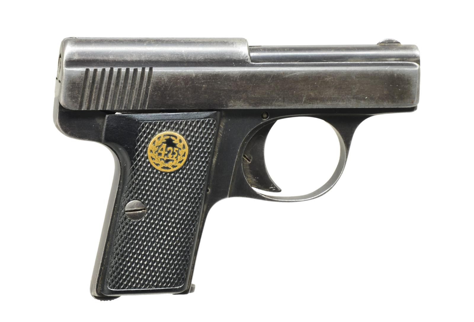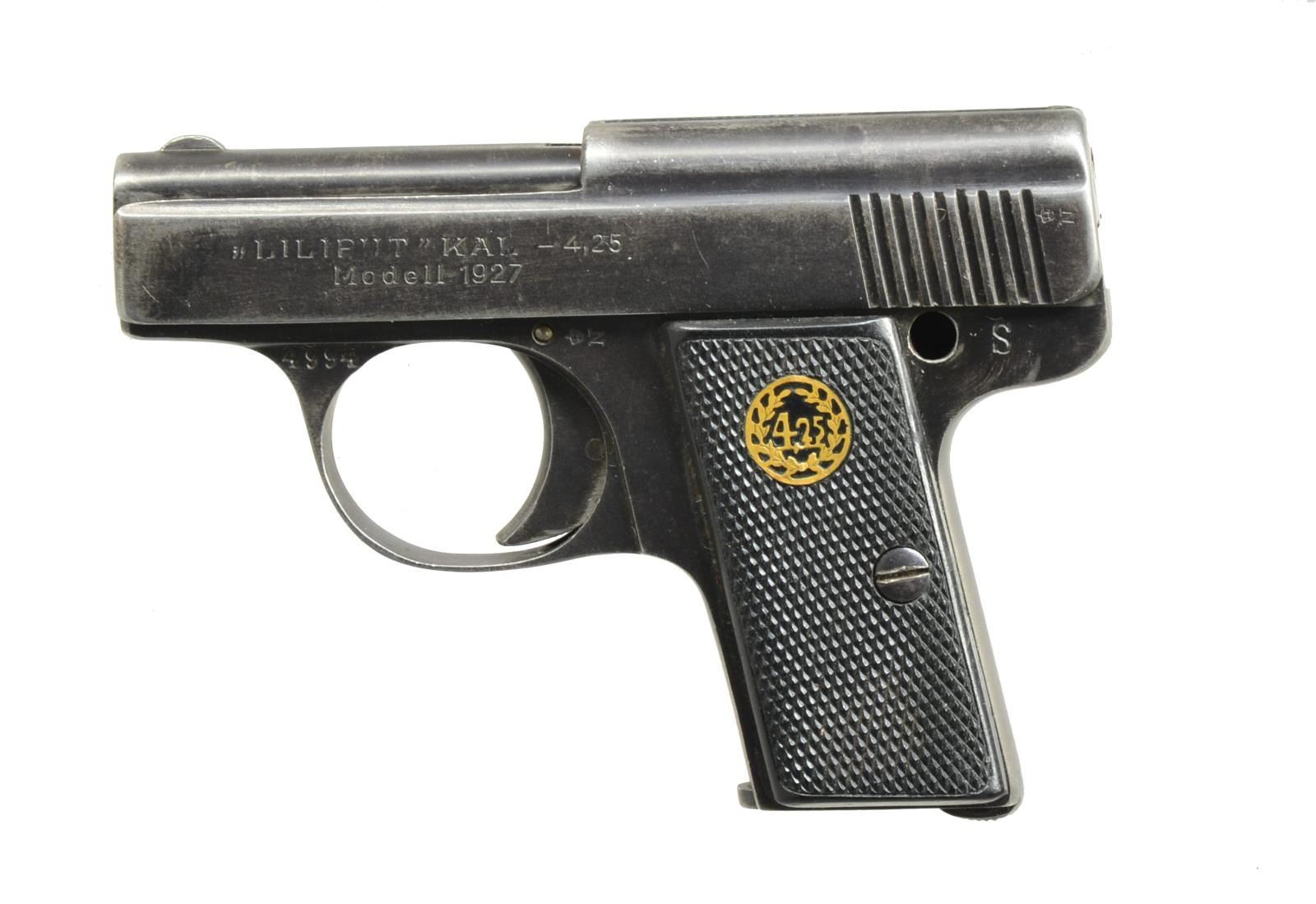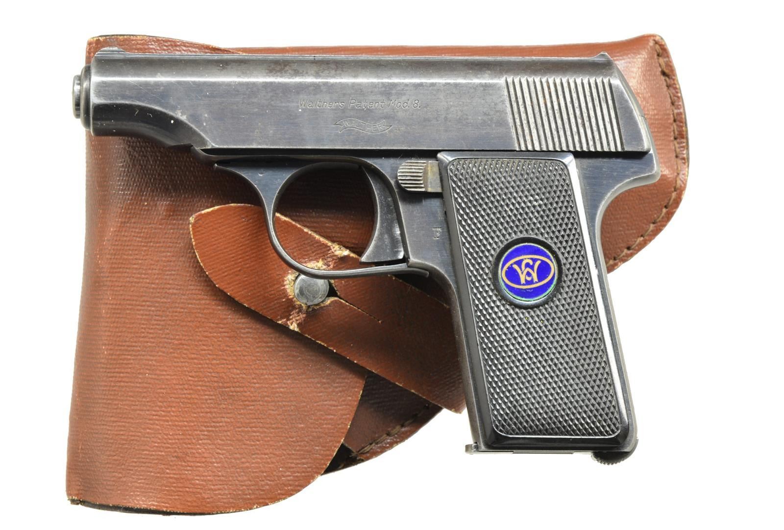 1) WALTHER MODEL 8 SEMI-AUTO PISTOL. Cal. 6.35 (25 ACP). S# 452457. Bbl. 3". Mfg. 1920-1943 w/ checkered hard rubber grips having rnd. blue background medallions appearing to be porcelain w/ gold trim. MAGS: 1 good factory 8 rd. UNATTACHED ACCESSORIES: simple unmarked brown flap holster made of resin impregnated canvas. Fair condition w/ delamination, cracks & strap repair. CONDITION: good overall appearance w/ thinning finish having beginning patina. Very good grips w/ light hand wear. Fair to good bore w/ even light pitting. (21-918/NW). 2) LILIPUT MODEL 1927 SEMI-AUTO PISTOL. Cal. 4.25. S# 4994. Bbl. 1 3/4". Mfg. 1920s in limited quantity as extremely sm. semi auto pocket pistol. Checkered hard rubber grips w/ golden medallions marked w/ wreath & "4.25". Crown "N" proofs. MAGS: 1 good factory 8 rd. CONDITION: good plus appearance w/ slightly better appearing grips; typical high point wear. Missing safety lever that also serves to retain slide to frame. Poor pitted bore. (21-919/NW). 3) J.C. HIGGINS MODEL 88 DA REVOLVER. Cal. 22 LR. S# 1146444. Bbl. 2 3/8". Mfg. 1957-1966 by High Standard w/ 9 rd. cyl. as based on their Sentinel Model having rounded butt & birds head shape. Marked for Sears w/ J.C. Higgins on checkered 1 piece brown plastic grip panels & right side of bbl. Grip panels also have "88" plus "MODEL 88" on left side of bbl. Right side of bbl. has typical Sears multi digit model # of "583.811". Matte black alloy frame w/ balance blued steel. CONDITION: good general appearance w/ frame faded to dark gray. Numerous marks & high point wear throughout along w/ peppery oxidation on bbl. Near excellent bore & grip. Mechanically functions fine in DA mode but 3 in a row of 9 positions in SA mode require extra effort to finish rearward hammer motion & abnormal force to release w/ trigger. (21-920/NW). ALL CURIO. $600-800.
