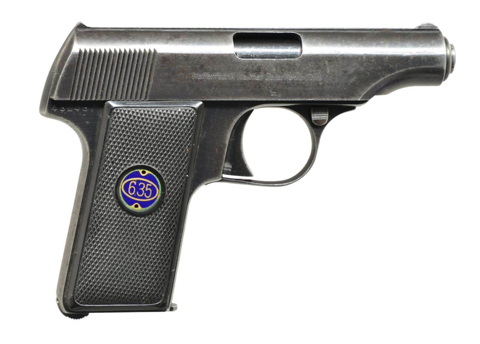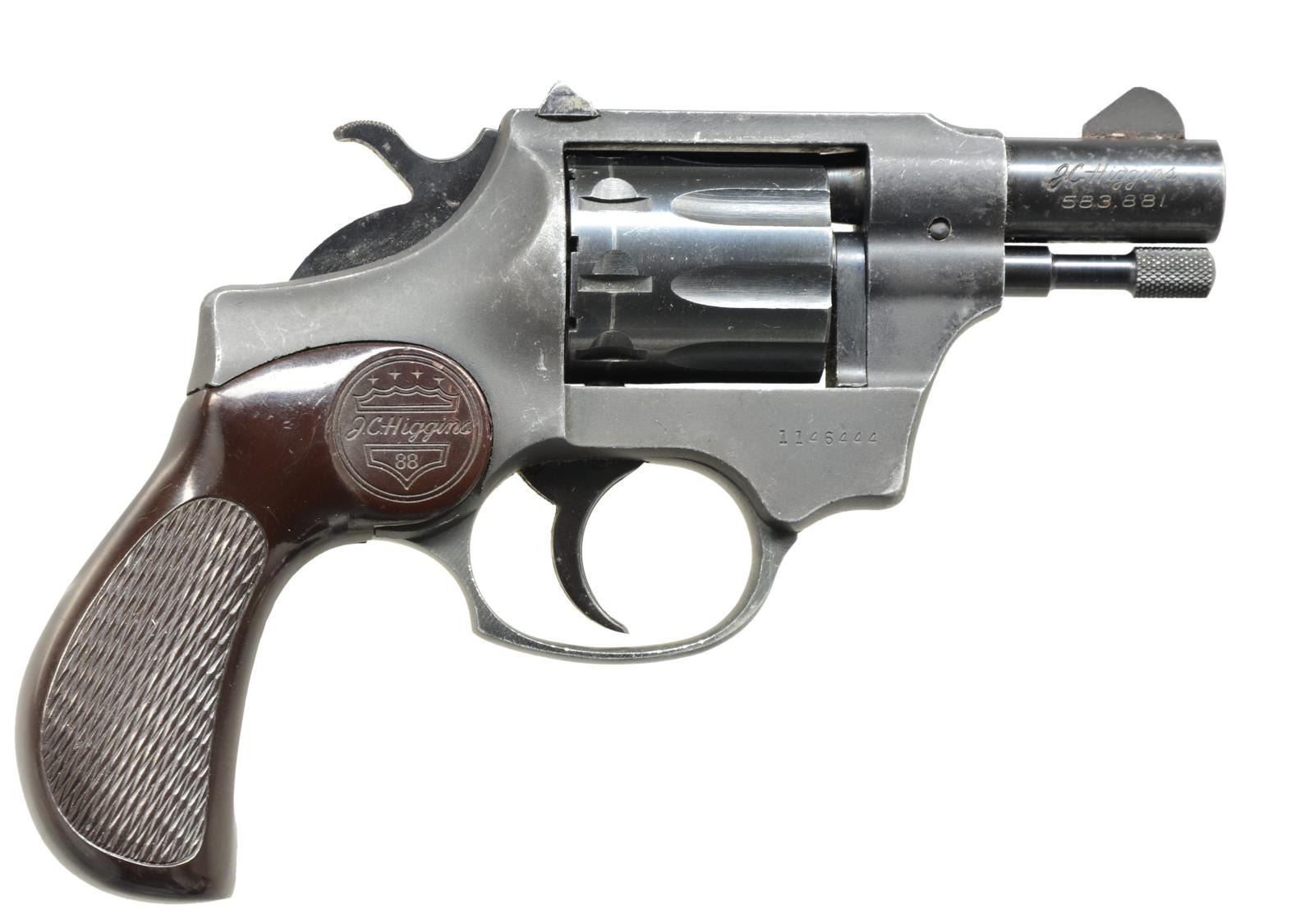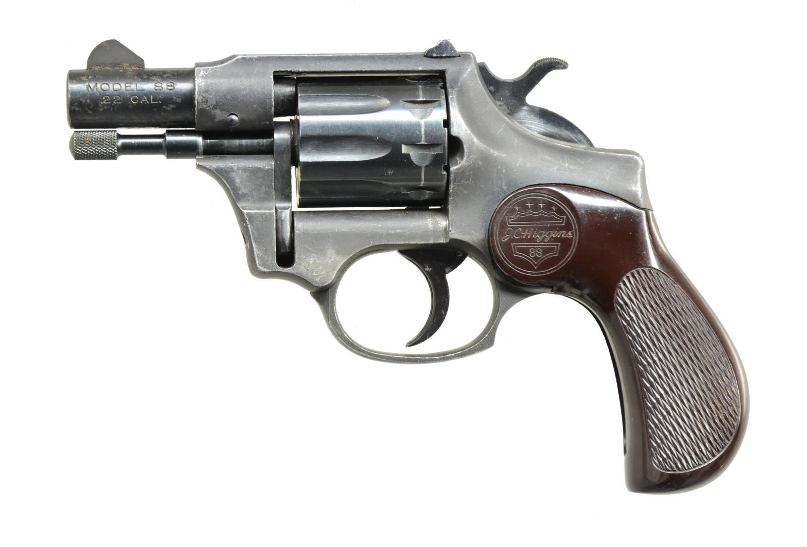 1) WALTHER MODEL 8 SEMI-AUTO PISTOL. Cal. 6.35 (25 ACP). S# 452457. Bbl. 3". Mfg. 1920-1943 w/ checkered hard rubber grips having rnd. blue background medallions appearing to be porcelain w/ gold trim. MAGS: 1 good factory 8 rd. UNATTACHED ACCESSORIES: simple unmarked brown flap holster made of resin impregnated canvas. Fair condition w/ delamination, cracks & strap repair. CONDITION: good overall appearance w/ thinning finish having beginning patina. Very good grips w/ light hand wear. Fair to good bore w/ even light pitting. (21-918/NW). 2) LILIPUT MODEL 1927 SEMI-AUTO PISTOL. Cal. 4.25. S# 4994. Bbl. 1 3/4". Mfg. 1920s in limited quantity as extremely sm. semi auto pocket pistol. Checkered hard rubber grips w/ golden medallions marked w/ wreath & "4.25". Crown "N" proofs. MAGS: 1 good factory 8 rd. CONDITION: good plus appearance w/ slightly better appearing grips; typical high point wear. Missing safety lever that also serves to retain slide to frame. Poor pitted bore. (21-919/NW). 3) J.C. HIGGINS MODEL 88 DA REVOLVER. Cal. 22 LR. S# 1146444. Bbl. 2 3/8". Mfg. 1957-1966 by High Standard w/ 9 rd. cyl. as based on their Sentinel Model having rounded butt & birds head shape. Marked for Sears w/ J.C. Higgins on checkered 1 piece brown plastic grip panels & right side of bbl. Grip panels also have "88" plus "MODEL 88" on left side of bbl. Right side of bbl. has typical Sears multi digit model # of "583.811". Matte black alloy frame w/ balance blued steel. CONDITION: good general appearance w/ frame faded to dark gray. Numerous marks & high point wear throughout along w/ peppery oxidation on bbl. Near excellent bore & grip. Mechanically functions fine in DA mode but 3 in a row of 9 positions in SA mode require extra effort to finish rearward hammer motion & abnormal force to release w/ trigger. (21-920/NW). ALL CURIO. $600-800.