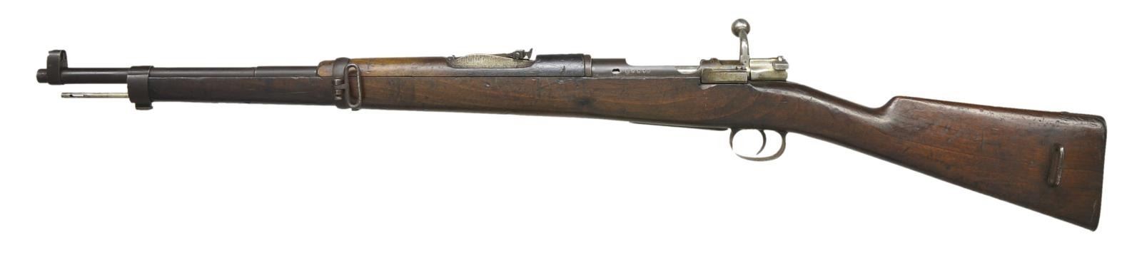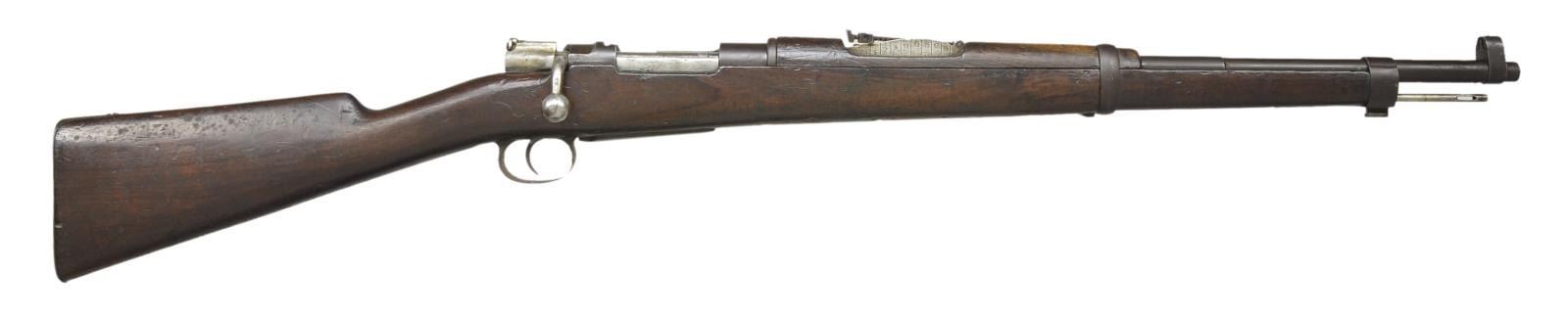 Cal. 7mm Mauser. S# C5579. Bbl. 21 3/4". Receiver unmarked except for S#. Turned down bolt handle. Tangent rear sight graduated to 2000m. Inverted V front sight w/ protective ears. Cleaning rod is present. Side swivels. Walnut stock set. CONDITION: original finish stock set has moderate wear, dents, scratches & staining throughout. Approx. 1" crack behind receiver tang. Metal turning overall gray & patina w/ light oxidation & scattered very fine pitting. Good shiny bore w/ lightly worn lands. (21-1367/RW). CURIO. $250-400.
