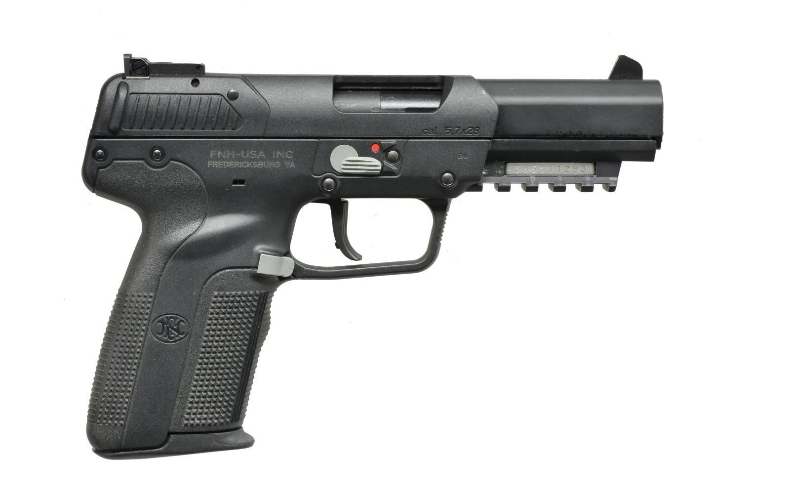 Cal. 5.7x28. S# 386111293. Bbl. 4.8". The FN Five-Seven IOM was a ground breaking design that boasted rifle ballistics in a still reasonably compact handgun w/ a minimum 20 rd. capacity. A perfect companion gun for the owner of a PS-90. Polymer frame w/ aggressive stippling all around pistol grip. Serrated slide w/ high profile 3 dot sights. 2" Accessory rail below bbl. Left side mag release & slide lock. Matte black finish on all exposed surfaces, aside from grey controls. MAGS: 2 factory 20 rd. UNATTACHED ACCESSORIES: black plastic factory transport box, cleaning kit, owners manual & factory provided tools. CONDITION: exterior finish coverage is complete w/ no noticeable wear. It appears to have been used very little, if any at all. Bore is shiny w/ factory rifling & fire control mechanism appears to function correctly when cycled by hand. (21-1199/JZ). MODERN. $500-700.