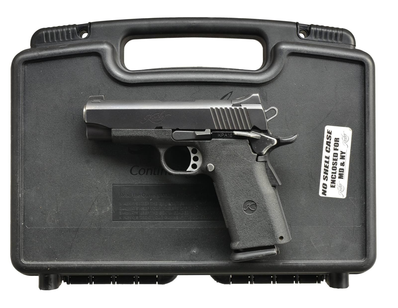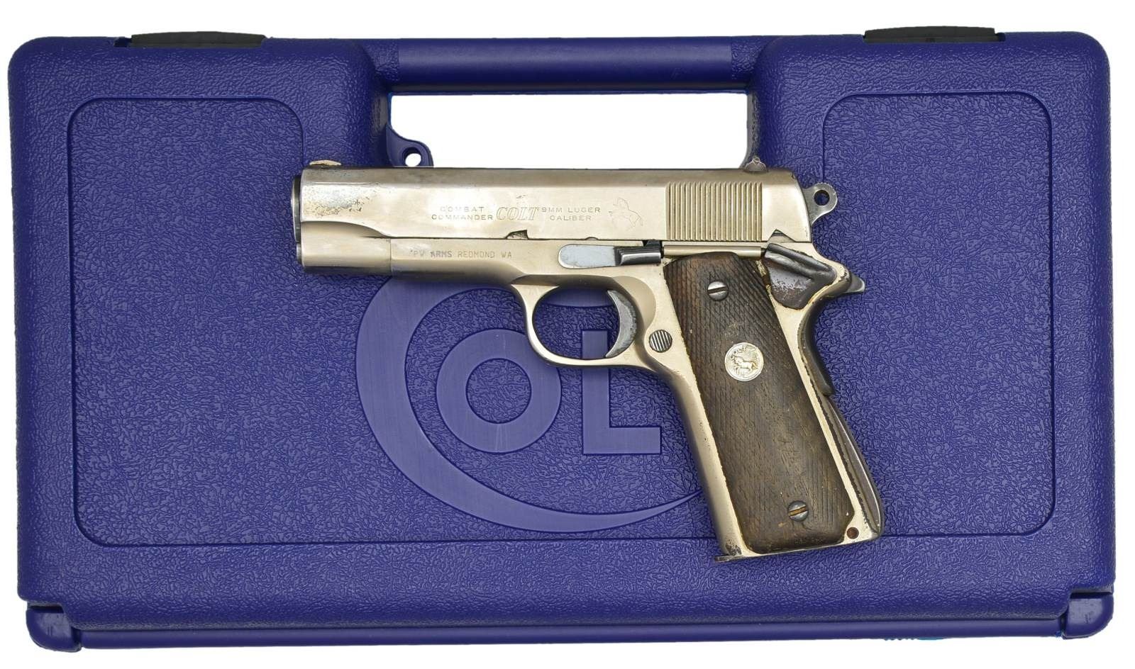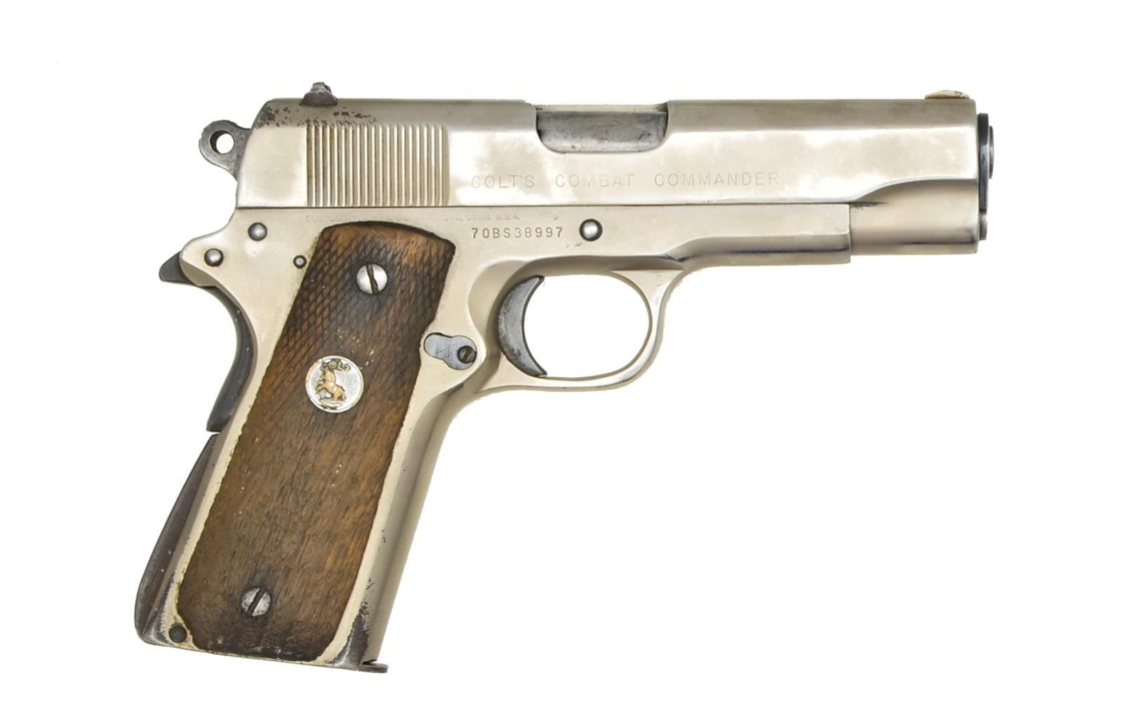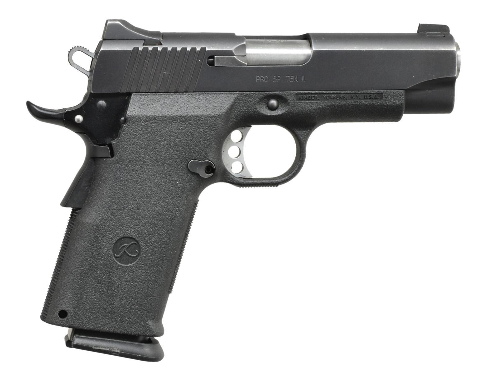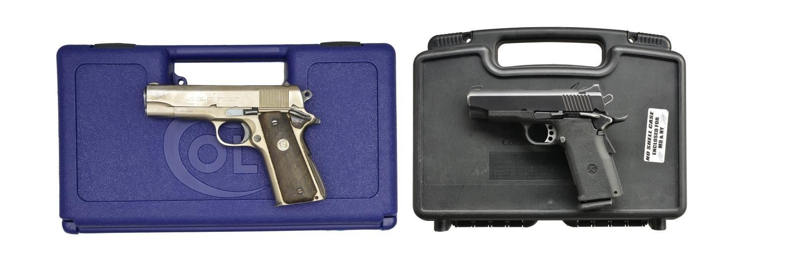 AUTO PISTOLS. 1) COLT COMBAT COMMANDER. Cal. 9mm Para. S# 70BS38997. Bbl. 4 1/4". Ramp front sight w/ fixed square notch rear sight. Satin nickel finish. Combat Commander hammer. 2 Piece checkered walnut Rampant Colt grips. Left side of frame has PW Arms Redmond, WA import mark. Mfg. 1976. MAGS: 2 detachable 8 rd., 1 Colt & 1 Mec-Gar. UNATTACHED ACCESSORIES: original style Colt blue molded box. CONDITION: shows heavy carry wear retaining 40% stainless finish. Slide & grip straps show scattered spots of light pitting. Grips have darkened appearance showing heavy wear & wood loss w/ checkering smooth or gone. Bore retains lightly worn rifling. (21-888/DS). 2) KIMBER PRO BP TEN II. Cal. 45 ACP. S# KPA16537. Bbl. 4". Black Oxide finished carbon slide w/ Patridge front sight & square notch rear sight. Alloy frame w/ composite grip & trigger guard. Beavertail grip safety. Combat style hammer w/ skeletonized trigger. Mfg. 2003-2007. MAGS: 1 original 10 rd. & 3 Mec-Gar 14 rd. UNATTACHED ACCESSORIES: black molded box w/ matching label containing owner's manual, custom shop, NRA & Sportslight brochures, lubrication pamphlet, Meprolight catalog & trigger lock. CONDITION: slide retains 80% finish showing edge & carry wear. Bore retains strong rifling. (21-890/DS). BOTH MODERN. $700-1,100.