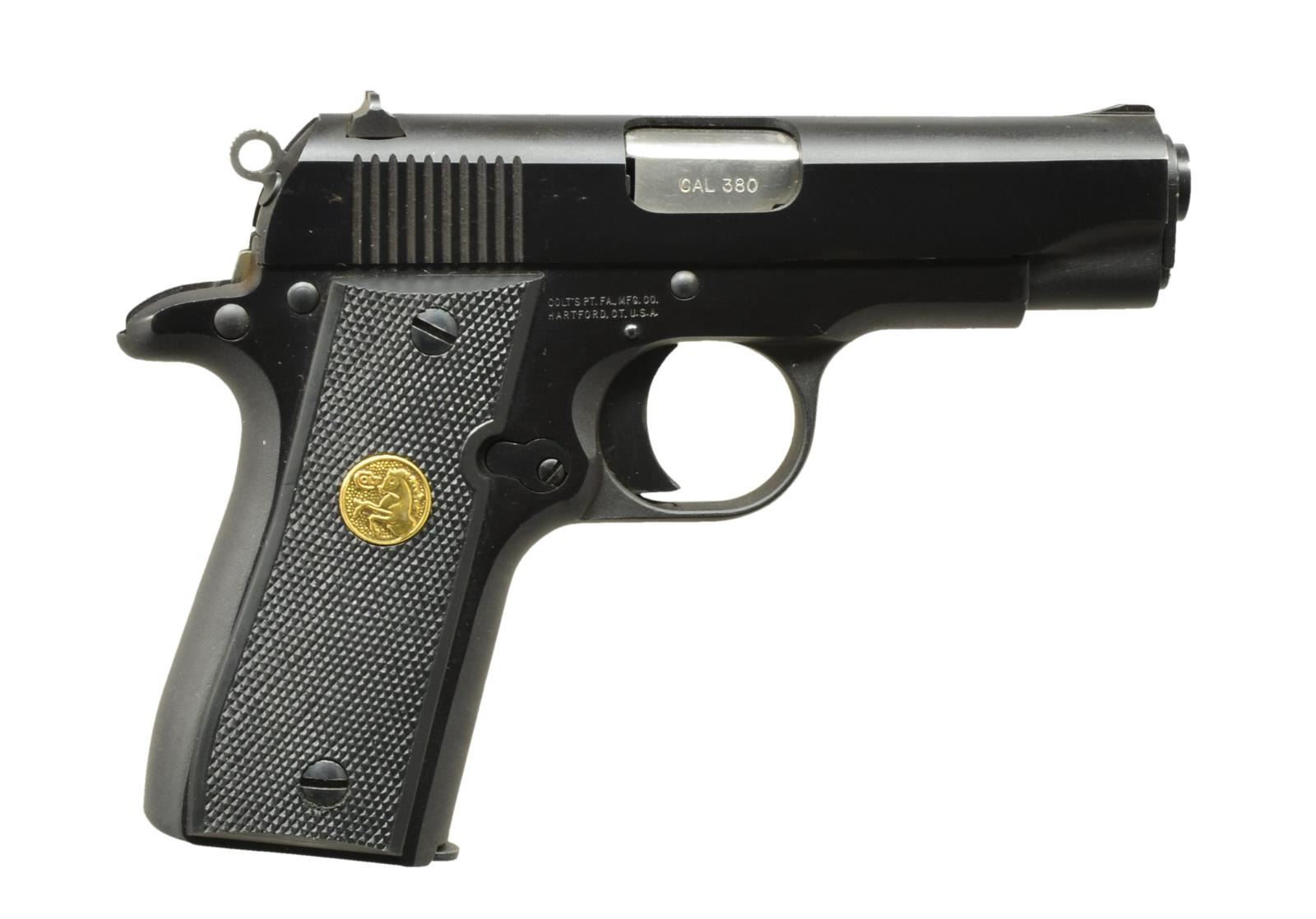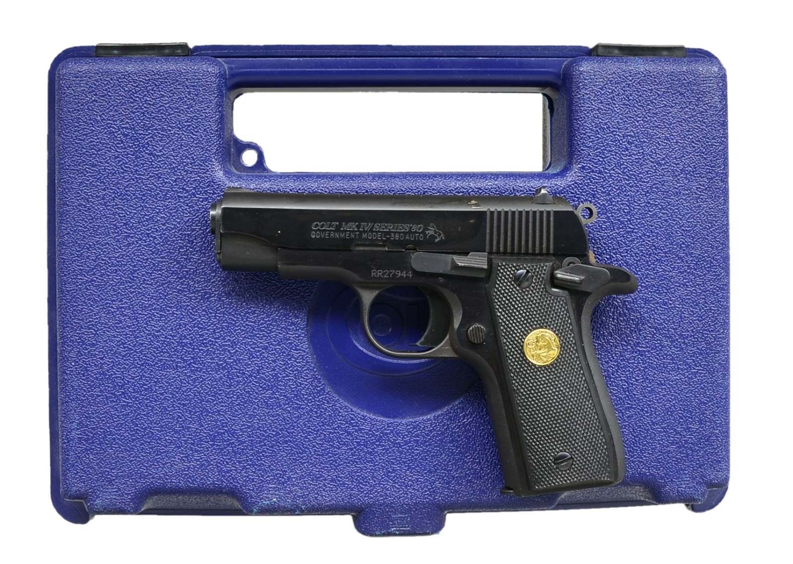 PISTOL. Cal. 380 ACP. S# RR27944. Bbl. 3 1/4". Ramp front sight w/ square notch rear sight. Steel frame & slide w/ blued finish. 2 Piece checkered plastic grips w/ gold Colt medallions. 1992 Mfg. MAGS: 2 detachable 7 rd. UNATTACHED ACCESSORIES: blue molded box contains instruction manual. CONDITION: over 98% blue w/ sm. scrape on top of slide. Bore has strong rifling showing some fouling. (21-1660/DS). MODERN. $600-900.