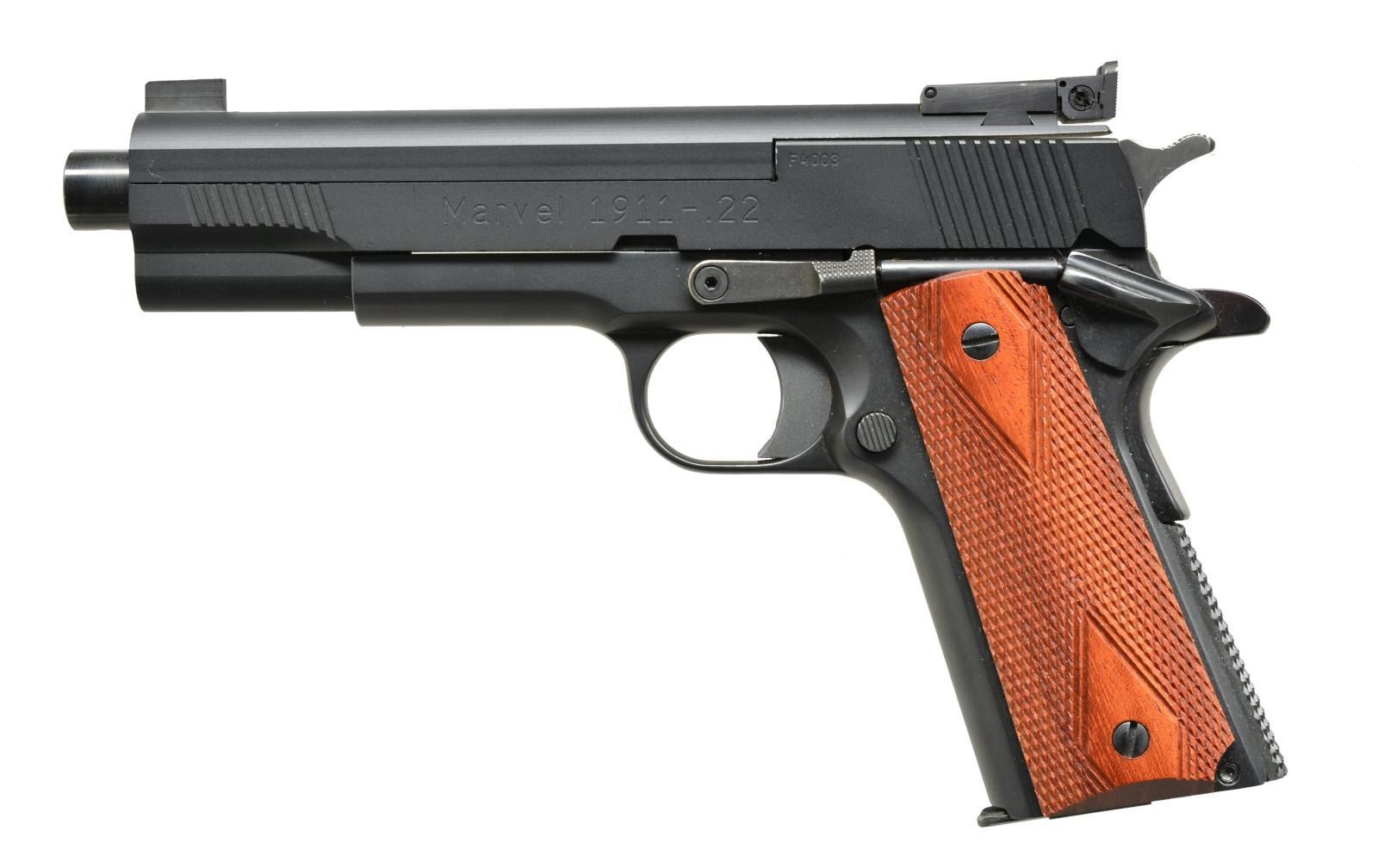 Cal. 22 LR. S# NM26018. Bbl. 5.1/4". Target Model 1911 chambered in 22 LR. Matte black finish matching on frame & slide. High profile front blade sight & windage & elevation adj. rear sight. Full length guide rod. Unlike a traditional 1911 the serrated slide is not the top most component & moves independently of the sights. Checkered rubberized back strap & checkered cut hardwood grips. MAGS: 1 factory 7 rd. CONDITION: finish coverage is complete on all exterior surfaces w/ thinning only in areas of mechanical intervention. Grips are free of any noticeable blemishes. Shiny bore w/ good rifling. Fire control mechanism appears to function correctly when cycled by hand. (21-1149/JZ). MODERN. $300-400.