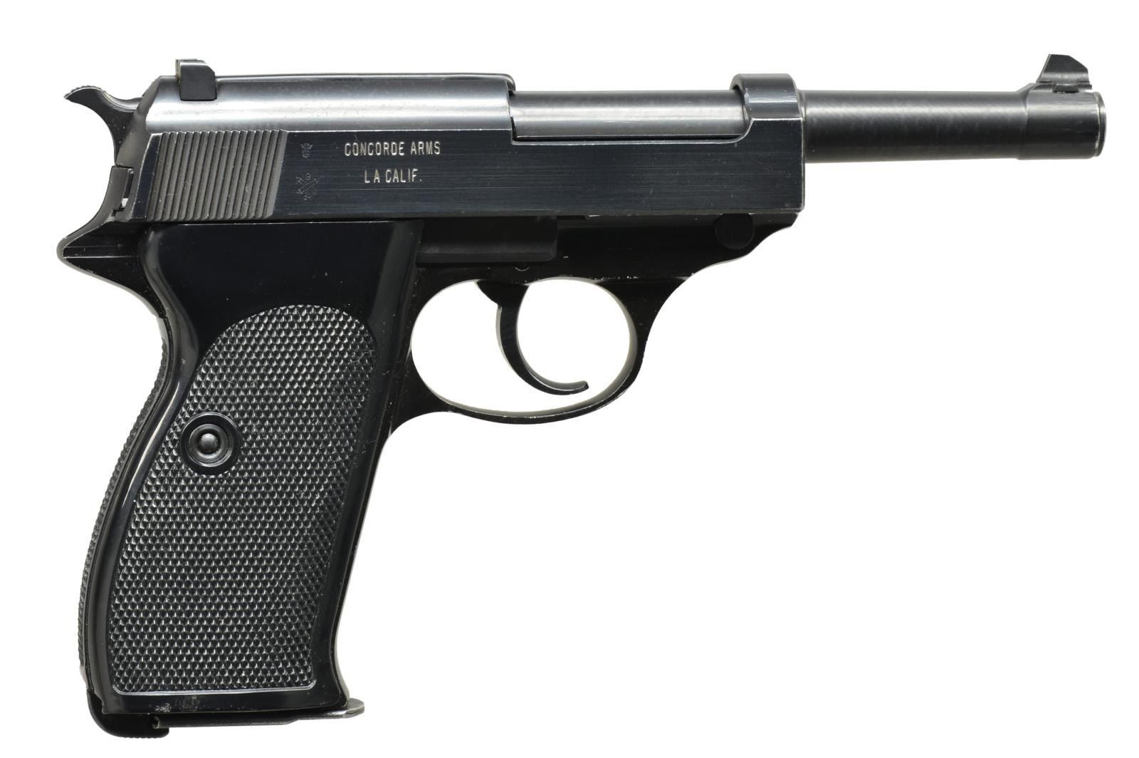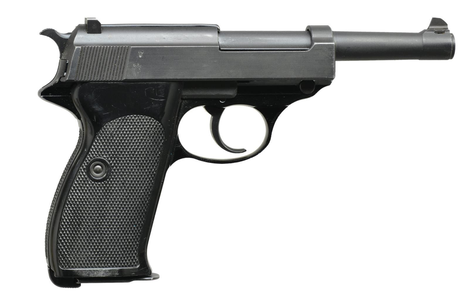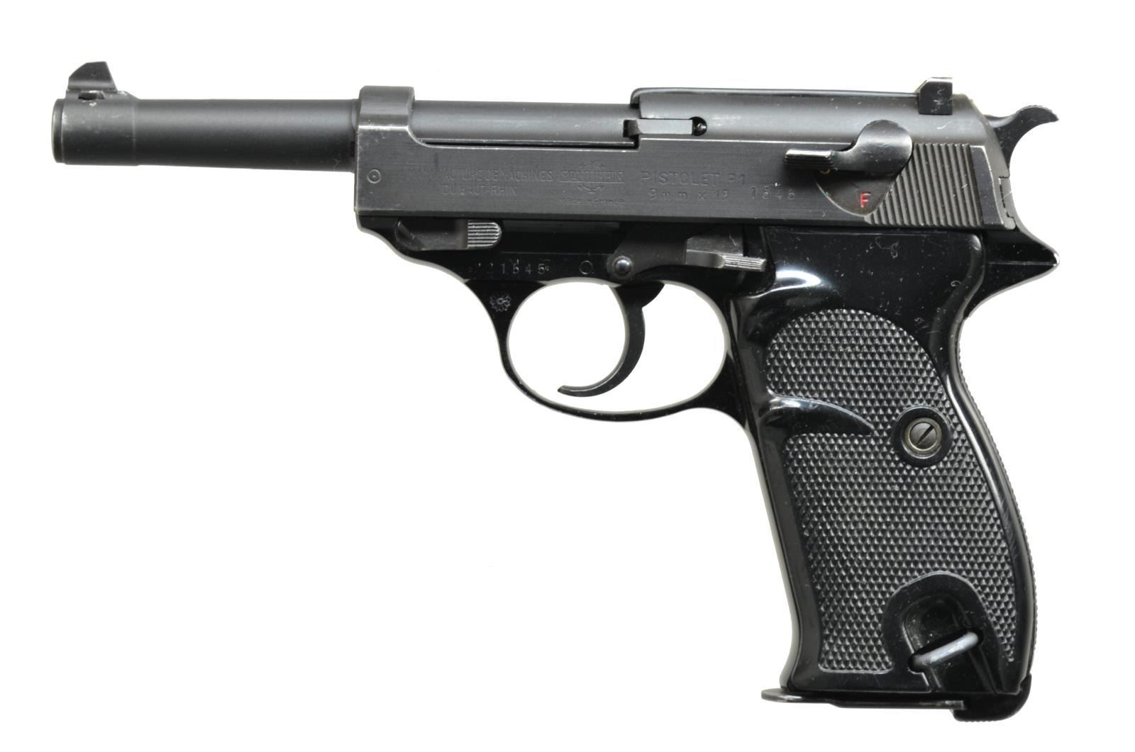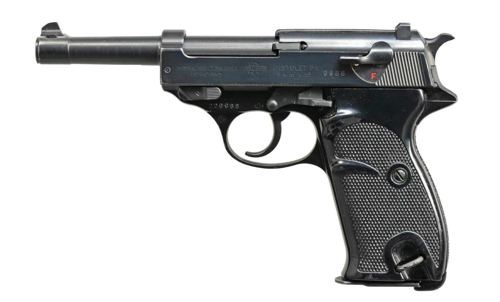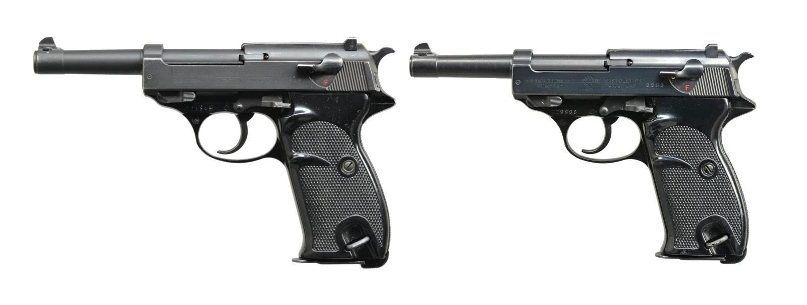 BOTH: cal. 9mm X 19 (9mm Luger). Bbls. 5". Mfg. in France w/ P1 designation plus right side of slides in front of cocking grooves are cross cannons. Circle dot proofs & flower petal image on left side of trigger guards. Checkered black plastic grips w/ slight thumb recess on left sides. Matching # slides, frames & bbls.; locking blocks not numbered. MAGS: 2 very good P1 marked 8rd. TOTAL. UNATTACHED ACCESSORIES: Geco / 62 marked police style holster w/ spare mag. pouch on edge. Stud & strap retention. Good overall appearance w/ light verdigree around assembly rivets. 1) S# 221545. Import mark discreetly applied to right side of bbl.; visible w/ slide retracted. Matte finished bbl. & slide. CONDITION: good to very good overall appearance w/ high point wear throughout slide & muzzle. Near excellent bore, grips & frame finish. (21-1142/NW). 2) S# 229988. Import mark clearly engraved on right side of slide. CONDITION: somewhat polished appearance definitely not matte yet less than polished appearance of frame. Filed top of front sight. Light high point wear to high edges including trigger guard. Near excellent bore & grips. (21-1145/NW). BOTH MODERN. $750-1,000.