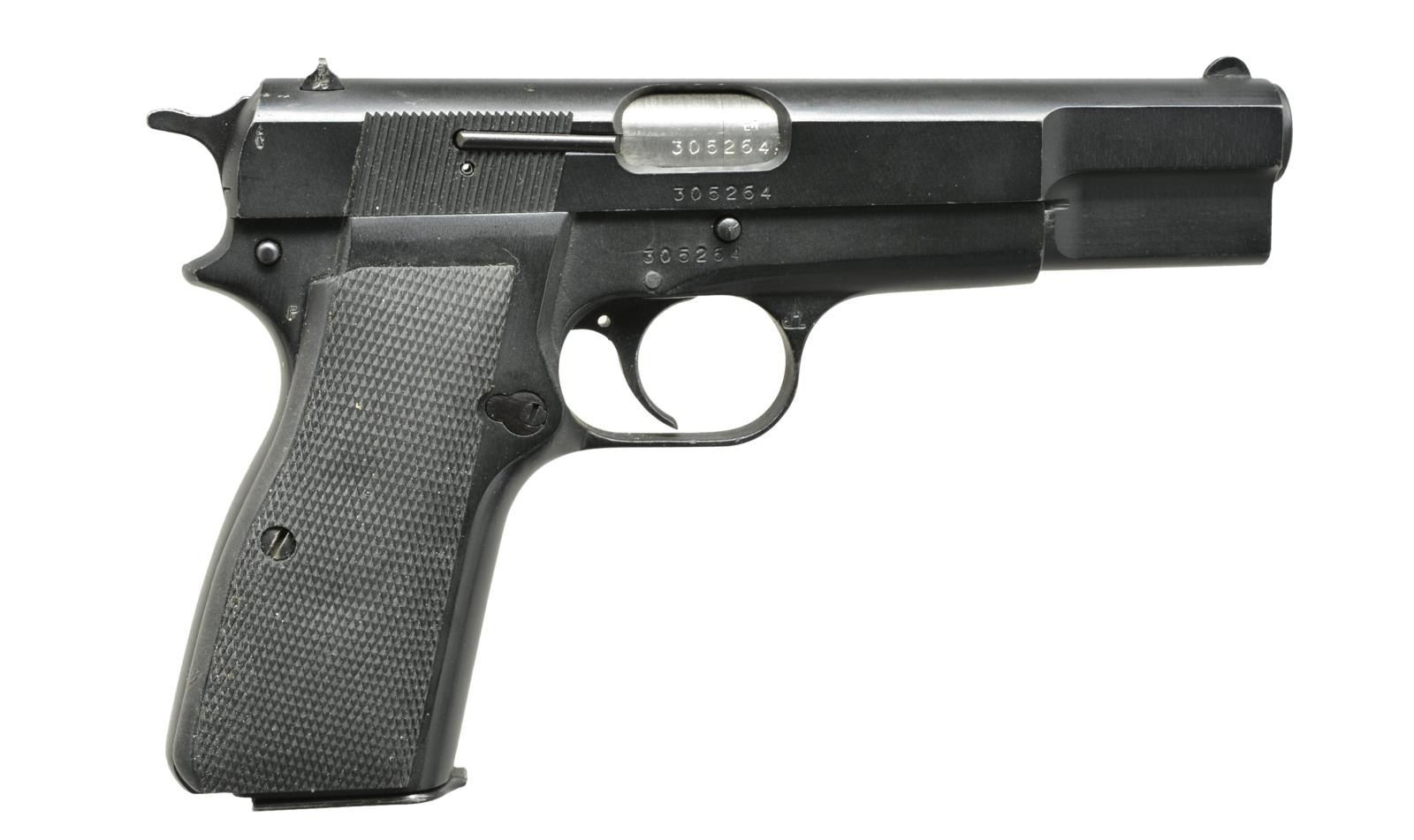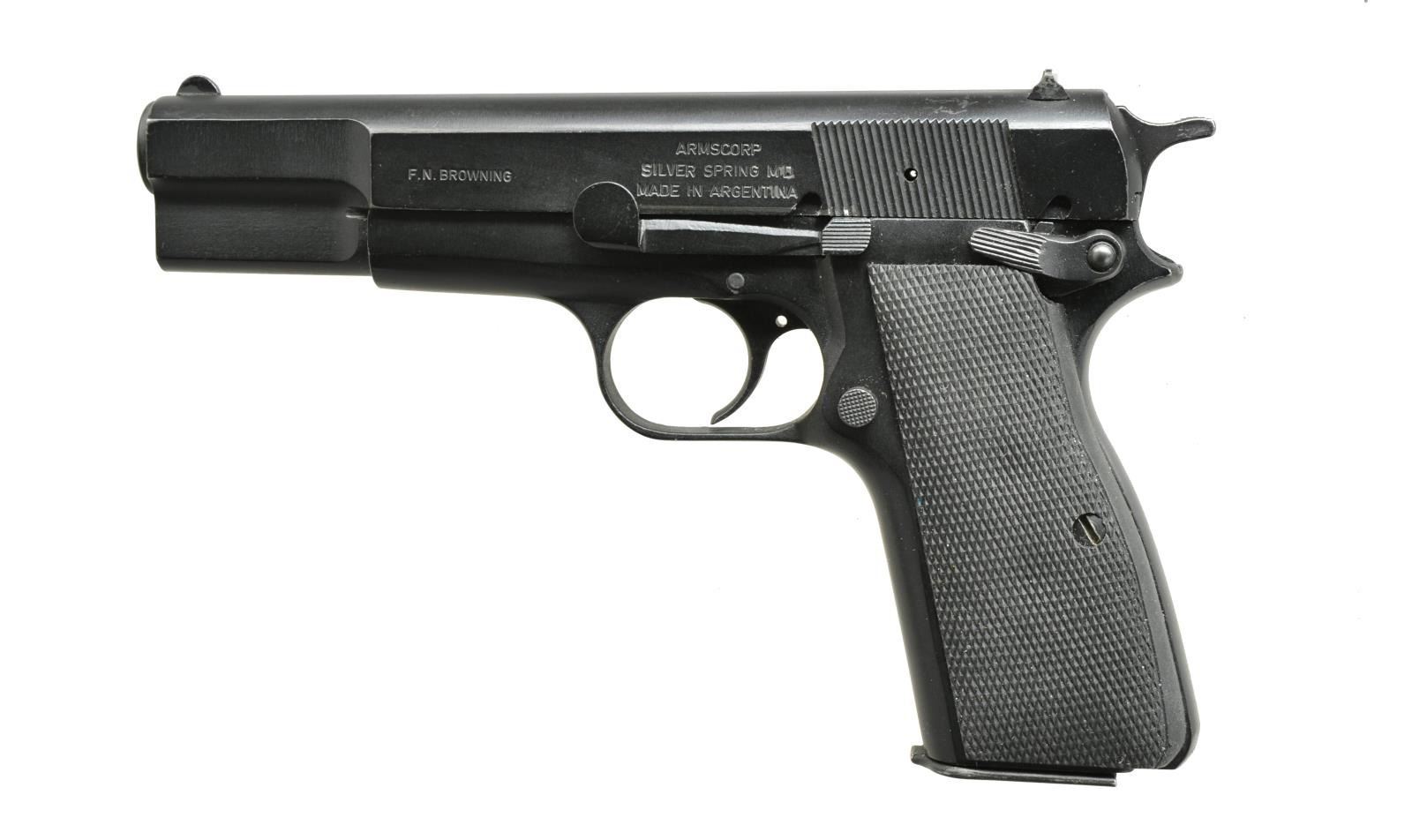 Cal. 9mm Luger. S# 305264. Bbl. 4 7/8". Mfg. 1989-1990 in Argentina w/ matching number frame, slide & bbl. Faithful copy of Browning model w/ latest style safety & spur hammer. Black enamel finish & checkered rubber grips. Simple fixed sights w/ drift adj. rear. MAGS: 1 phosphate finished body of 13 rds. w/ painted push button base. UNATTACHED ACCESSORIES: Hi-Power box w/ matching number to pistol. CONDITION: very good appearance w/ faint high point wear & occasional light mark. Mag. safety removed from trigger so fully functional w/out mag. (21-1093/NW). MODERN. $350-500.