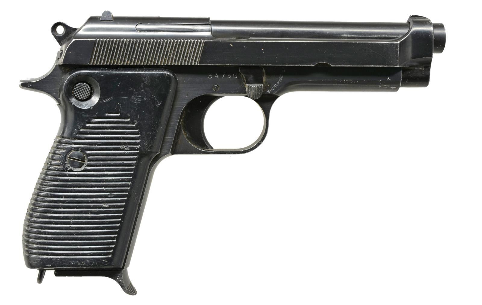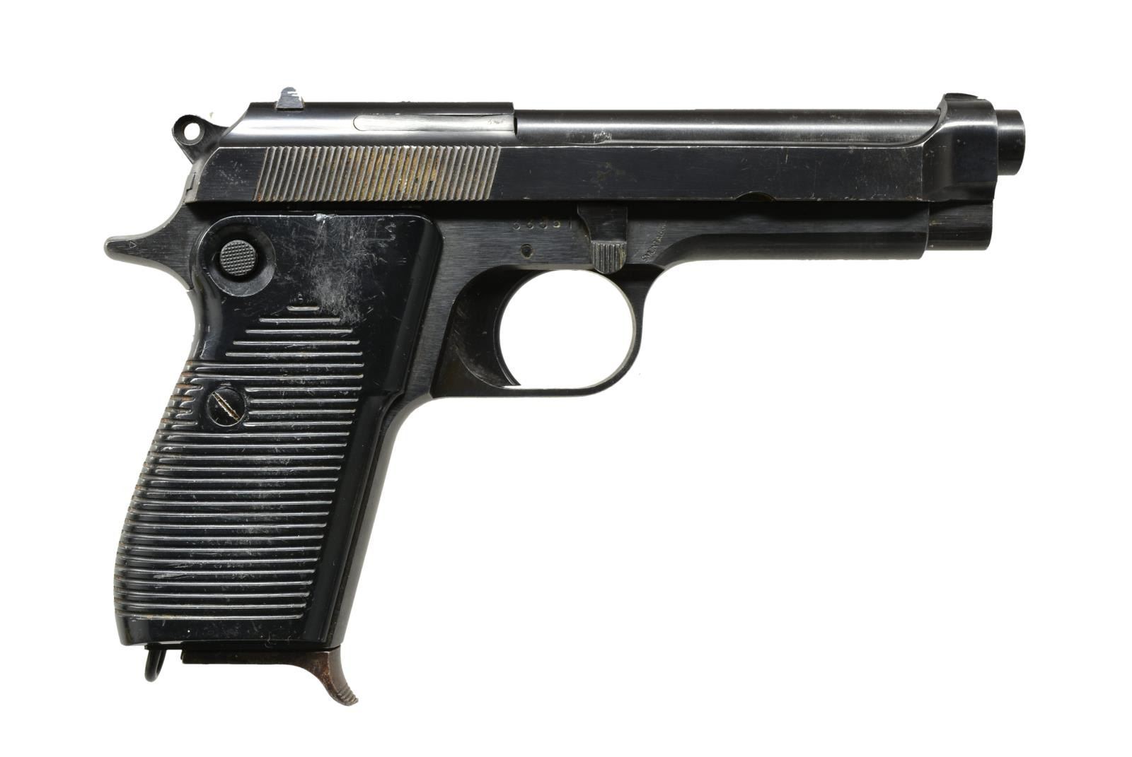 ALL: cal. 9mm Luger. Bbls. 4.5". Blade front w/ fixed notch rear sights. Blue finished slides & frames. 2 Piece grooved plastic grips. MAGS: 1 detachable 8 rd. for each pistol. 1) S# 33551. SARCO import marked. UNATTACHED ACCESSORIES: black molded Flambeau foam lined molded box. CONDITION: 80% blue showing carry & edge wear w/ spots of surface corrosion. Grips show wear & scratches. Bore retains strong rifling showing spots of very light pitting. (21-807/DS). 2) S# 34730. PW ARMS import marked. CONDITION: 80% lightly faded blue showing carry & edge wear w/ scratches, handling marks & spots of corrosion. Grips shows scratches, handling marks & wear. Bore retains strong rifling showing a spot of pitting. (21-808/DS). 3) S# 15675. PW ARMS import marked. UNATTACHED ACCESSORIES: black molded Flambeau foam lined molded box. CONDITION: 70% blue showing carry & edge wear w/ dents, scratches & spots of corrosion. Grips show scratches, marks & light wear. Bore retains sound rifling showing spots of light pitting. (21-809/DS). ALL MODERN. $750-1,000.