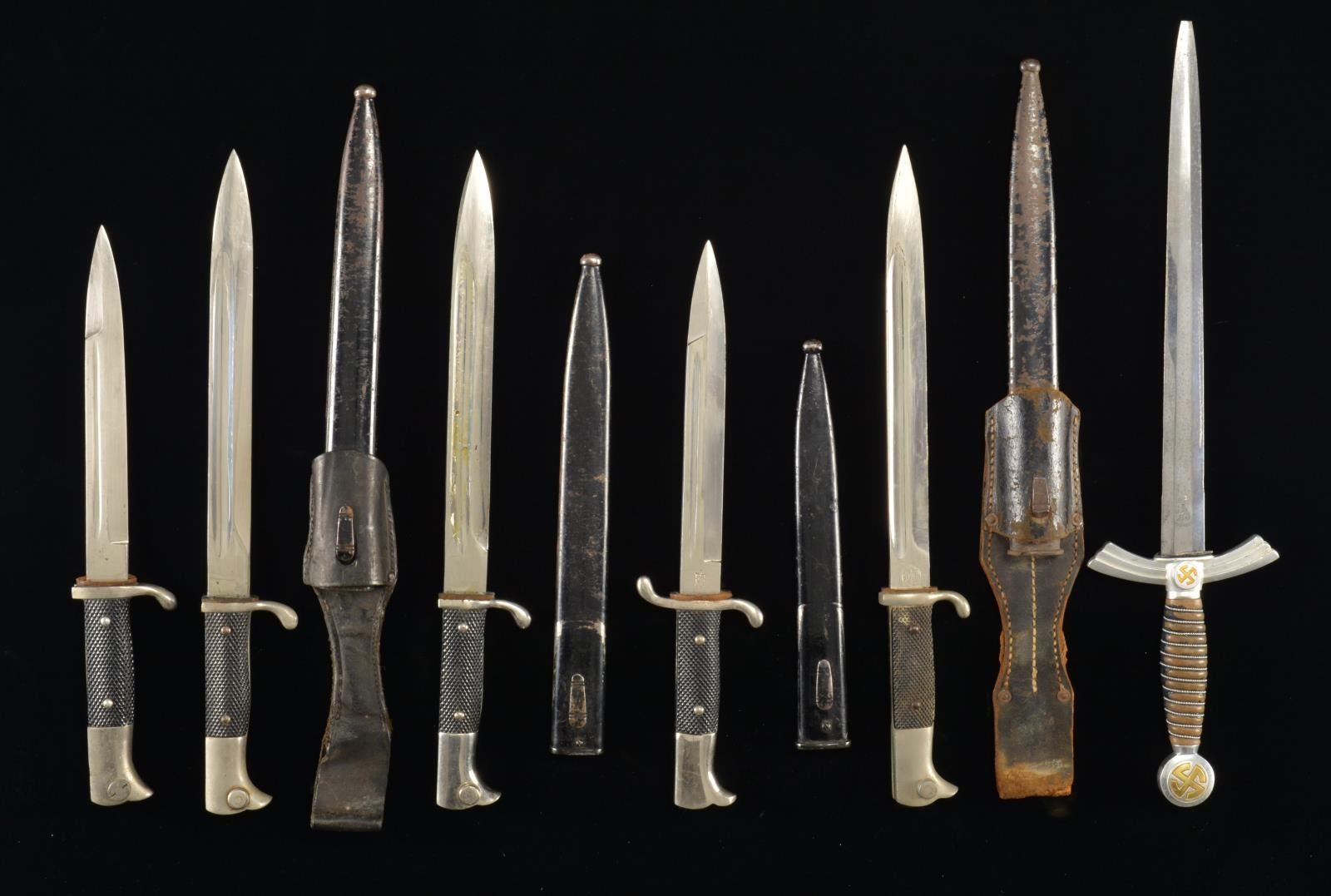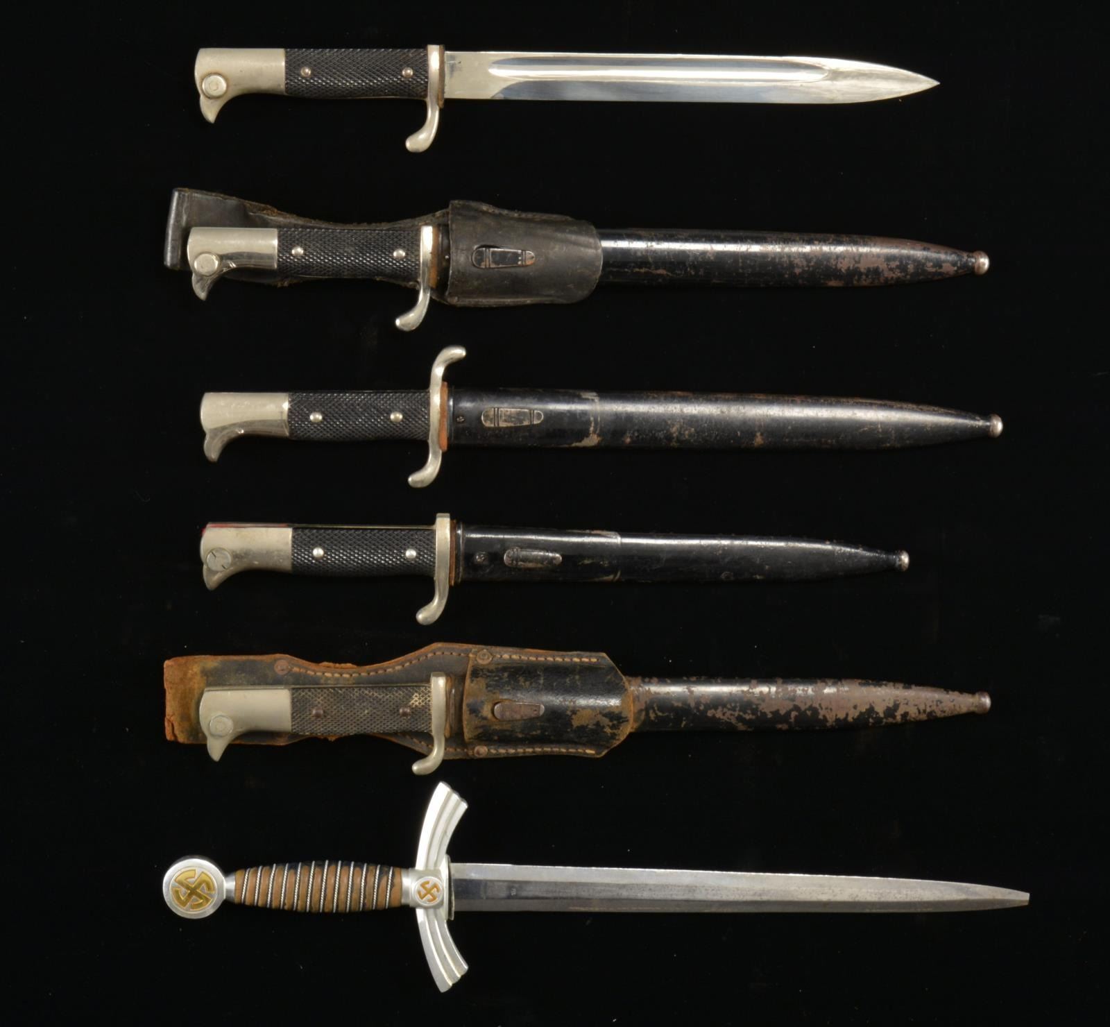 LUFTWAFFE DAGGER. 1) ARMY. Overall length: 16". Blade marked, “E.u.F HORSTER SOLINGEN”. 2 Piece composite grip. Black enameled scabbard. Leather frog. CONDITION: blade has original factory polish. Hilt & scabbard show minor wear. Frog shows moderate wear. 2) ARMY. Overall length: 16". Blade marked, “ORIGINAL (squirrel) EICKHORN SOLINGEN”. 2 Piece composite grip. Black enameled scabbard. Leather frog. CONDITION: blade has original factory polish. Hilt & scabbard show minor wear. Frog shows moderate wear. 3) FIREMAN. Overall length: 13 7/8". Blade marked, “H (sword) HS”. 2 Piece composite grip. Black enameled scabbard. CONDITION: blade has some original factory polish. Hilt & scabbard show minor wear. 4) ARMY. Overall length: 15 3/4". Blade marked, “ORIGINAL (squirrel) EICKHORN SOLINGEN”. 2 Piece composite grip. Black enameled scabbard. CONDITION: blade has original factory polish. Hilt & scabbard show minor wear. 5) ARMY. Overall length: 12 3/4". Blade marked “(lobster)”. 2 Piece composite grip. No scabbard. CONDITION: blade has some original factory polish. Hilt shows minor wear. 6) LUFTWAFFE. Overall length: 17 1/2". Blade marked, “(king) SMF SOLINGEN”. Aluminum crossguard & pommel w/ gilded Party symbol. Wire wrapped leather grip. No scabbard. CONDITION: blade has a light gray finish & the extreme tip of the blade is missing. Crossguard & pommel show light wear. Grip is missing most of the leather but wire is complete. (02-14487(6)/BF). $600-800.
