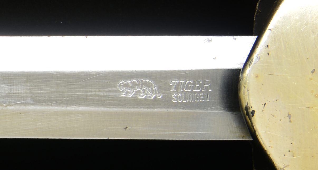 Overall length: 15 1/2". Blade is marked, “(tiger)TIGER SOLINGEN”. Plated crossguard, ferrule & pommel cap. Cream colored grip. Plated scabbard w/ a single scabbard loop & ring intact. CONDITION: blade has a pleasing finish free of dark spots. Crossguard has slight finish loss. Grip is undamaged. Scabbard has some shallow dents & wear concentrated near the tip. Top suspension ring is missing. (02-15188/BF). $300-500.