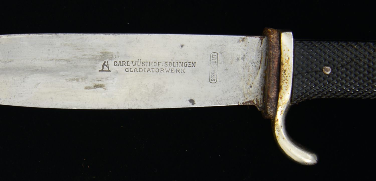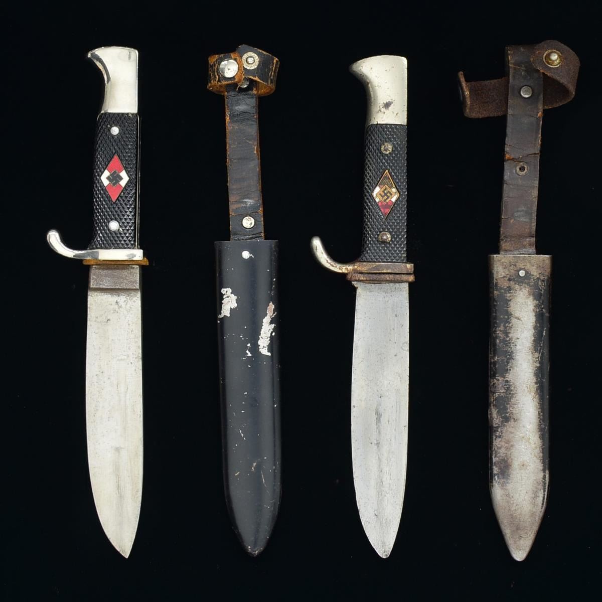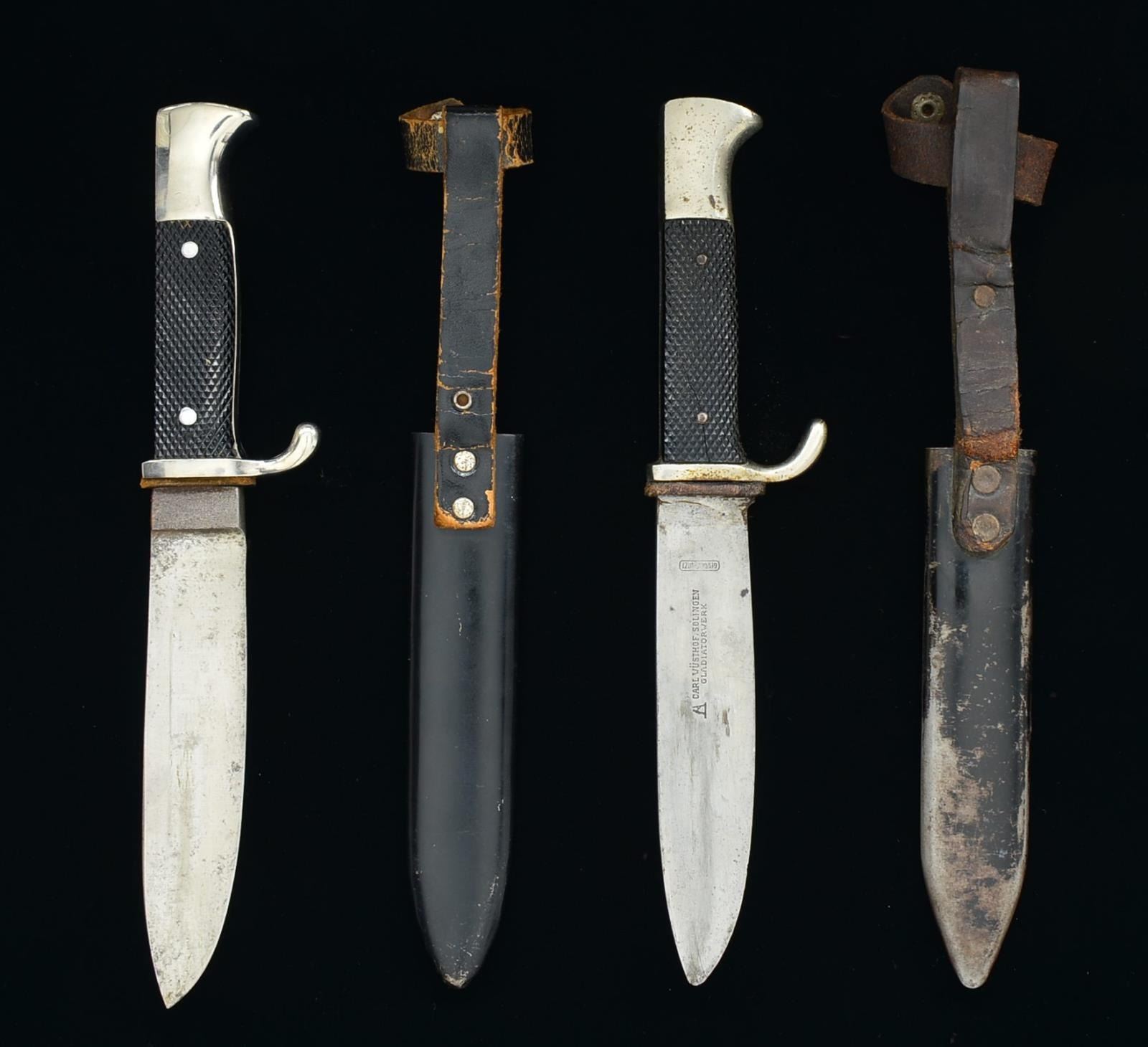 1) Overall length: 10". Blade length: 5 1/2". Unmarked blade. Nickel plated guard & pommel. 2 Piece checkered black composite grips. Red, white & black enameled Hitler Youth diamond in the front grip. Black enameled scabbard w/ black leather integral frog. CONDITION: blade has a pleasing gray finish. Hilt shows light wear. Scabbard shows 95% original finish. Frog is a bit flexed. 2) Overall length: 10 1/8". Blade length: 5 1/4". Blade is lightly etched, “Blut und Ehre” & is marked, “CARL WUSTHOFF, SOLINGEN GLADIATORWERK” & “GES GESCHUTZT”. Nickel plated guard & pommel. 2 Piece checkered black composite grips. Red, white & black enameled Hitler Youth diamond in the front grip. Black enameled scabbard w/ black leather integral frog. CONDITION: blade shows wear from honest use. Crossguard has finish loss to the front side. Grips are undamaged but diamond is missing significant enamel. Scabbard has about 35% original finish. Frog is worn & flexed but complete. (02-15184(2)/BF). $300-500.