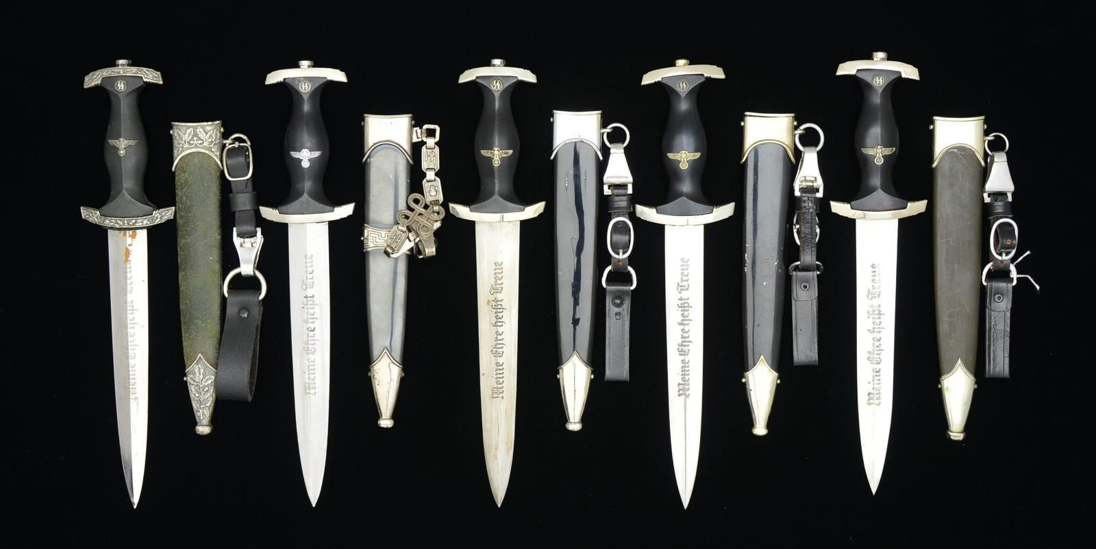 These 5 repro daggers include 3 M1933 types w/ repro hangers, 1 of which has a Himmler inscription on the blade. / 1 Chained SS dagger w/ Himmler inscription on the blade. / 1 Oak leaf embellished SS Honor dagger w/ Himmler inscription on the blade w/ repro hanger. CONDITION: daggers generally show light to moderate wear. (02-15264/BF). $400-700.