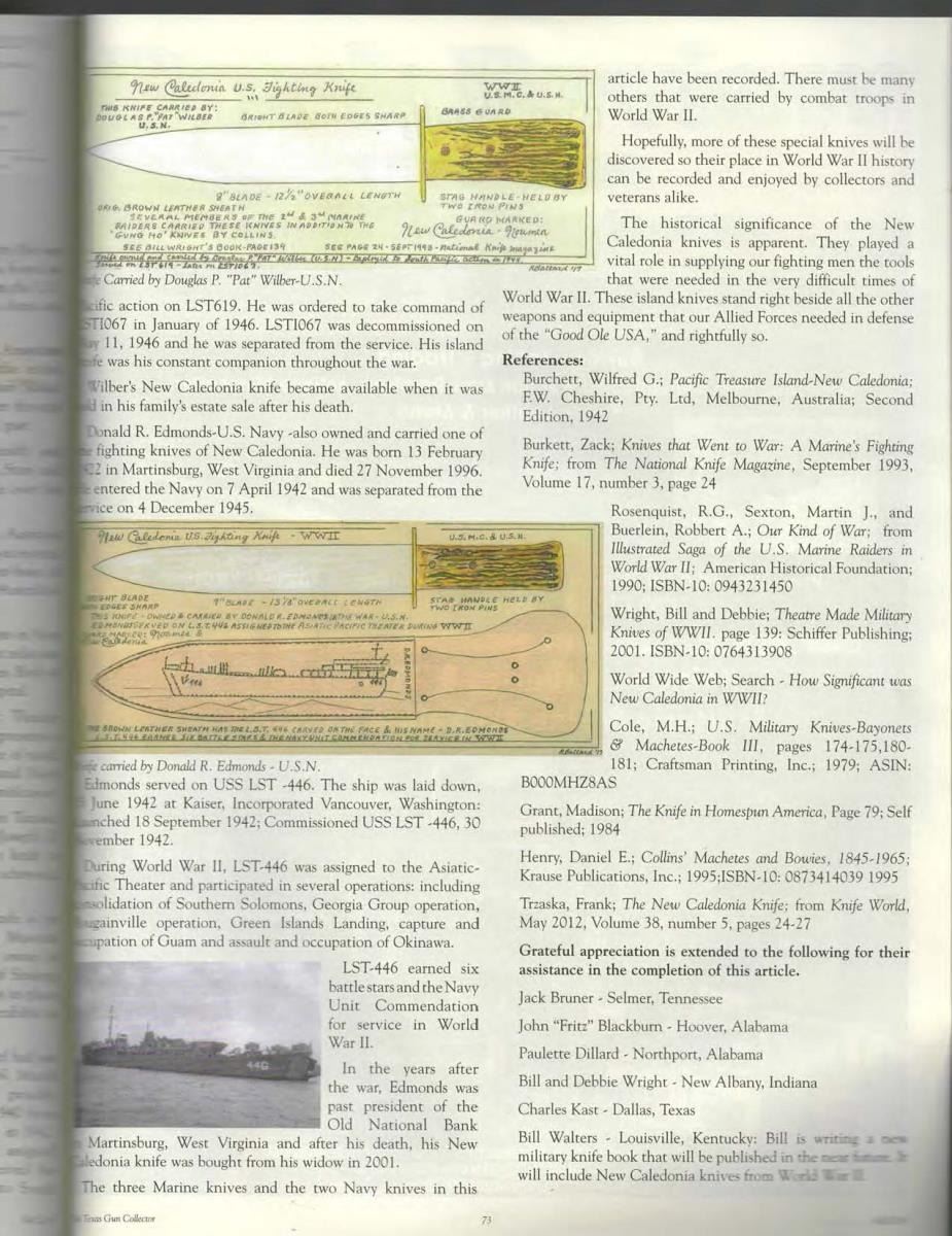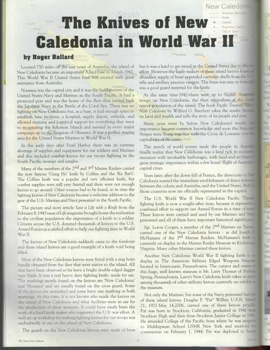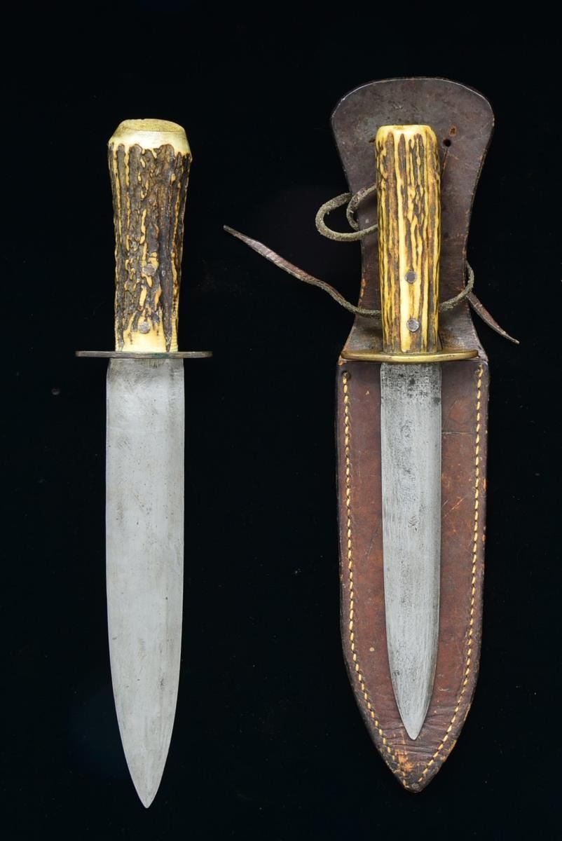 KNIVES. Among the mysteries of World War II fighting knives, the maker of “NOUMEA, NEW CALEDONIA” knives is unknown. There were up to 50,000 allied troops stationed on the island of New Caledonia which is 750 miles off the East Coast of Australia. Noumea is capital of this French colonial island. Of the examples known, at least 3 are identified to members of the 2nd & 3rd Marine Raiders & 2 others are identified to US naval personnel. These unique knives have a variety of blade sizes but all are double-edged dagger point blades which are very well made & quite sturdy for their intended use. All have similar heavy brass lozenge -shaped cross guards. All have stag grips in quite an interesting variety, but all are attached by 2 iron pins. 1) 11" overall, 6 7/8" blade, 1.1" wide. 2.5" guard hand-engraved “Noumea” & “New Caledonia”. Straight stag grip attached w/ 2 iron pins. Very good overall w/ accompanying Brown leather sheath. Unattached accessory: hand-drawn card by Roger Ballard. 2) 12.25" overall, 8.25" blade, 1.4" wide, unmarked 2.5" thick brass ovoid cross guard, Crown stag grip apparently once had pinned plaque on top as to small holes are present to retain it. Very good overall. Unattached accessory: hand-drawn card by Roger Ballard & copy of TGCA magazine w/ article by Roger concerning these knives. PROVENANCE: Roger Ballard collection. (02-15164/JS). $600-900.