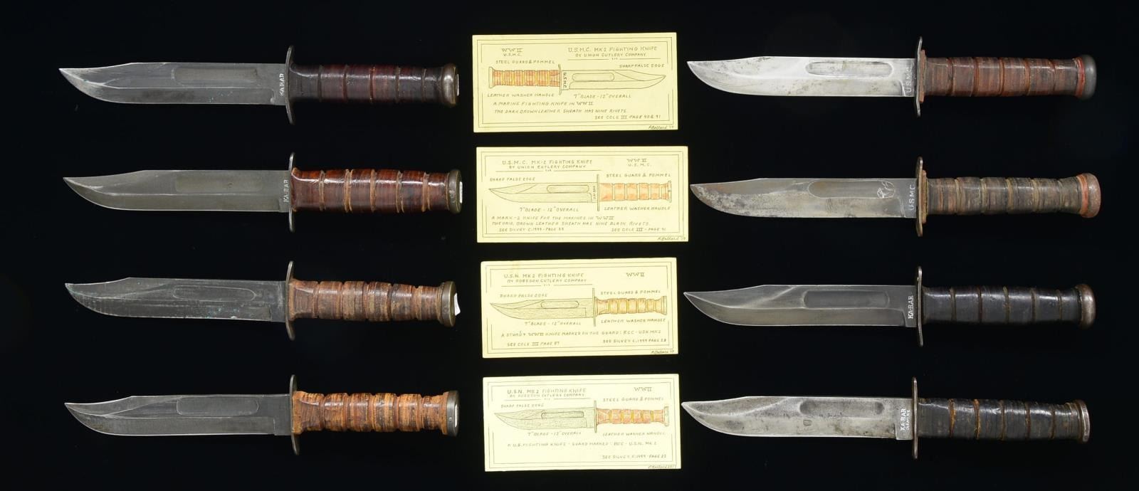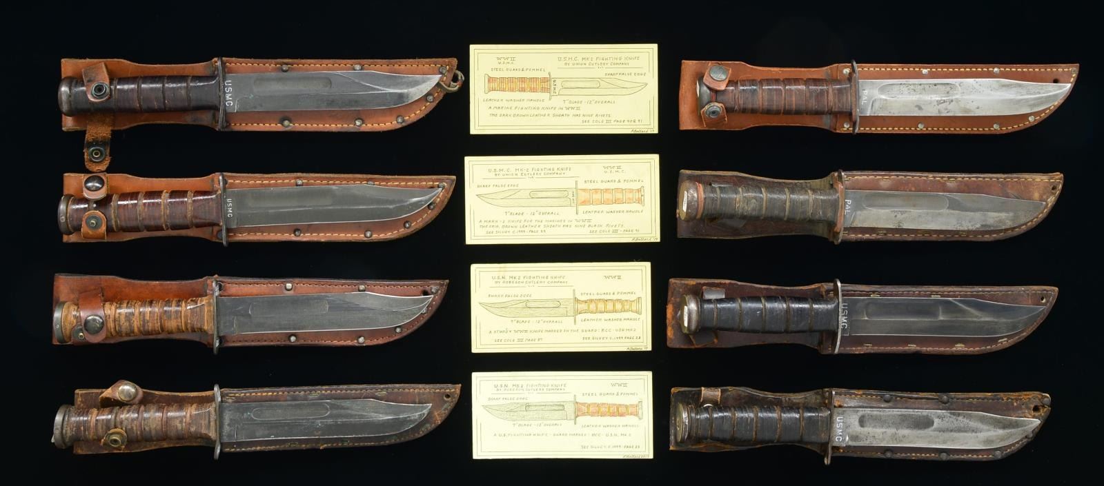 KNIVES. 1) USMC MK2 FIGHTING KNIFE. Overall length: 12". 7" Parkerized blade marked “U.S.M.C.” on 1 side & “KA-BAR” on the other. Steel crossguard & pommel. Stacked leather washer grip. Original leather sheath w/ 9 black rivets. CONDITION: very good to fine overall. 2) USMC MK2 FIGHTING KNIFE. Overall length: 12". 7" Parkerized blade marked “USMC” on 1 side & “KA-BAR OLEAN, N.Y.” on the other. Steel crossguard & pommel. Stacked leather washer grip. Leather sheath. CONDITION: knife shows moderate wear overall, sharp & sheath shows heavy wear, replaced snap closure. 3) USMC MK2 FIGHTING KNIFE. Overall length: 13". 7" Blade marked “USMC” on 1 side & “PAL” on the other. Steel crossguard & pommel. Stacked leather washer grip. Leather sheath. CONDITION: very good overall, gray blade w/ sharpening. 4) USMC MK2 FIGHTING KNIFE. Overall length: 12". 7" Parkerized blade unmarked. marked, Steel crossguard marked “USN / MK2” and “R.C.C.” for Robeson Cutlery Co. Stacked leather washer grip. Leather sheath. CONDITION: knife & sheath are fine overall. 5) USMC MK2 FIGHTING KNIFE. Overall length: 12". 7" Parkerized blade unmarked. Steel crossguard marked “USN / MK2” & “R.C.C.” for Robeson Cutlery Co. Stacked leather washer grip. Leather sheath marked “USN”. CONDITION: knife & sheath are very good to fine overall. 6) USN MK2 FIGHTING KNIFE. Overall length: 12". 7" Parkerized blade marked “USMC” on 1 side & “KA-BAR” on the other. Steel crossguard & pommel. Stacked leather washer grip. Leather sheath. CONDITION: good to very good overall. 7) USMC MK2 FIGHTING KNIFE. Overall length: 12". 7" Parkerized blade marked “U.S.M.C.” on 1 side & “KA-BAR” on the other. Steel crossguard & pommel. Stacked leather washer grip. Leather sheath marked “USN”. CONDITION: very good overall. 8) USMC MK2 FIGHTING KNIFE. Overall length: 13". 7" blade marked “USMC” on 1 side & “PAL” on the other. Steel crossguard & pommel. Stacked leather washer grip. Leather sheath. UNATTACHED ACCESSORIES: 4 of these knives have hand drawn descriptive cards. CONDITION: very good overall, gray blade w/ sharpening. PROVENANCE: Collection of Roger Ballard. (02-15157/JS). $1,000-1,500.