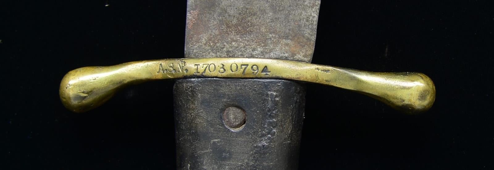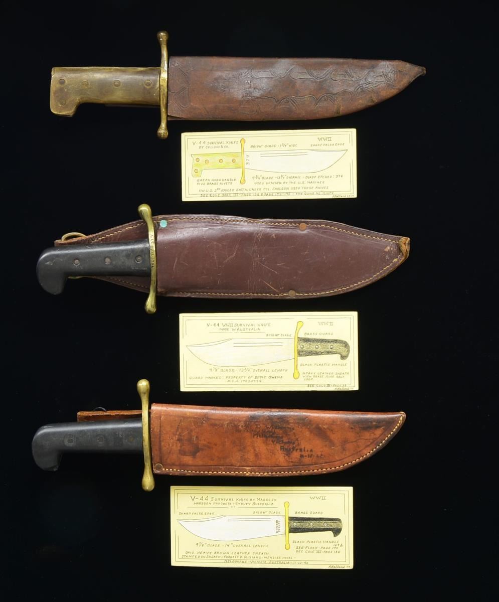 1) Rare early first batch “numbered” ricasso “374” Collins V-44. 13.75" overall, 9.2" blade, green horn handle. Blade & sheath both w/ Collins’s markings. WW2 favorite of Carlson’s Raiders. CONDITION: good overall, blade gray w/ sharpening, markings still sharp, sheath is solid but worn w/ Collin’s markings weak. 2) Identified Australian made V-44 w/ black hard rubber handle. 14" overall, 9 3/8" blade marked “MARSDEN / SYDNEY”. Leather sheath has “FORREST D. WILLIAMS … 11-10-42” nicely inked. CONDITION: good to very good overall. 3) Identified V-44 w/ no maker Mark, black hard rubber grip, brass crossguard stamped: “PROPERTY OF EDDIE OWENS, A.S.N. 17030794”. Riveted brown leather sheath w/ belt loop attached by brass ring. UNATTACHED ACCESSORIES: 3 hand drawn collection cards by Roger Ballard. CONDITION: good overall. PROVENANCE: Collection of Roger Ballard. (02-15160/JS). $900-1,400.