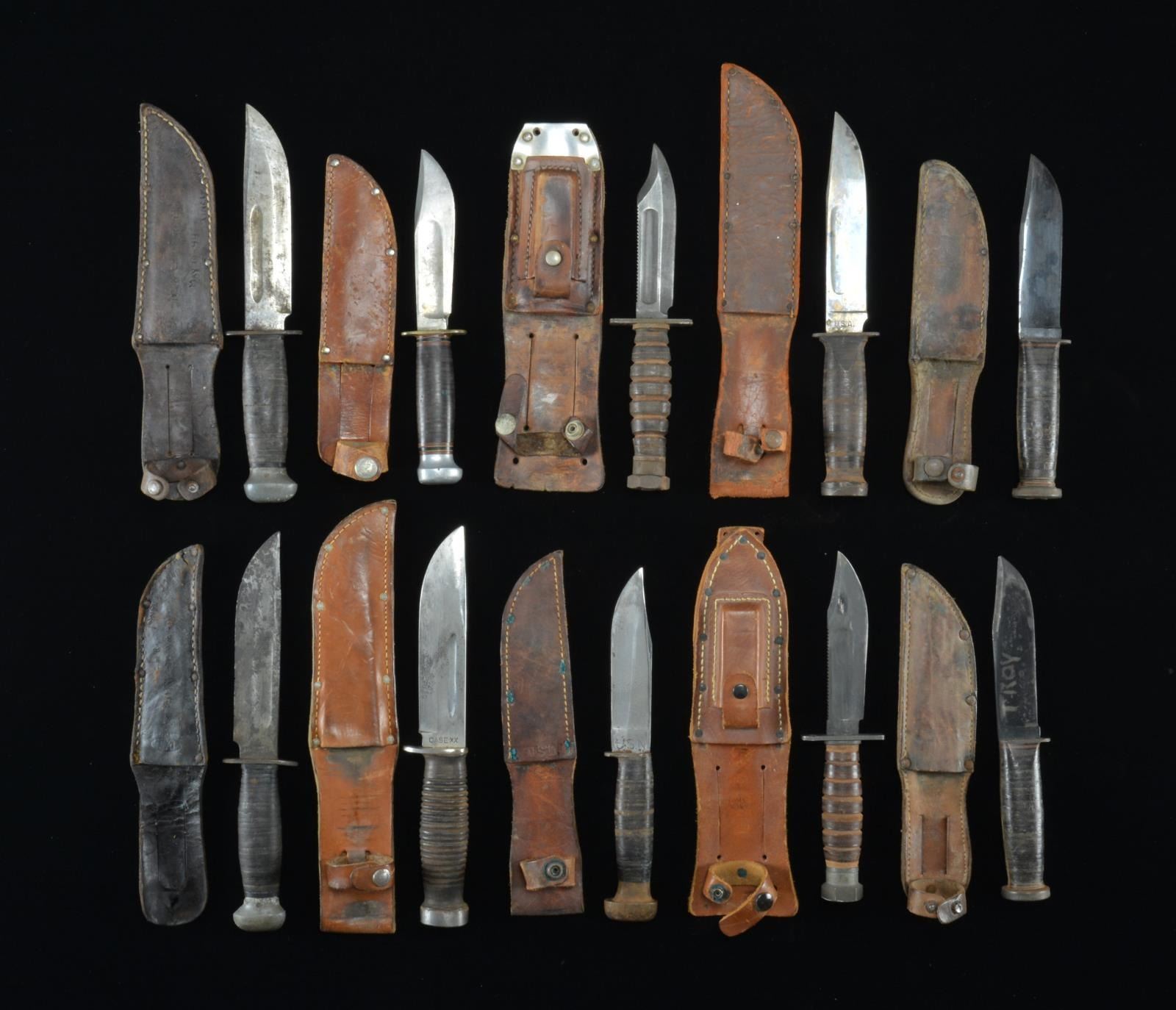 This interesting group of knives includes 4 USN MK1 & related knives, all having leather scabbards. / 1 US WWII fighting knife known as the 337-6Q design & leather scabbard. / 3 US WWII fighting knives & leather scabbards. / 2 Navy pilot survival knives & leather scabbards. A very nice group of authentic WWII fighting knives that saw ample service. CONDITION: most knives show light to moderate wear & are complete & functional. (02-14397-4(10)/BF). $700-1,000.