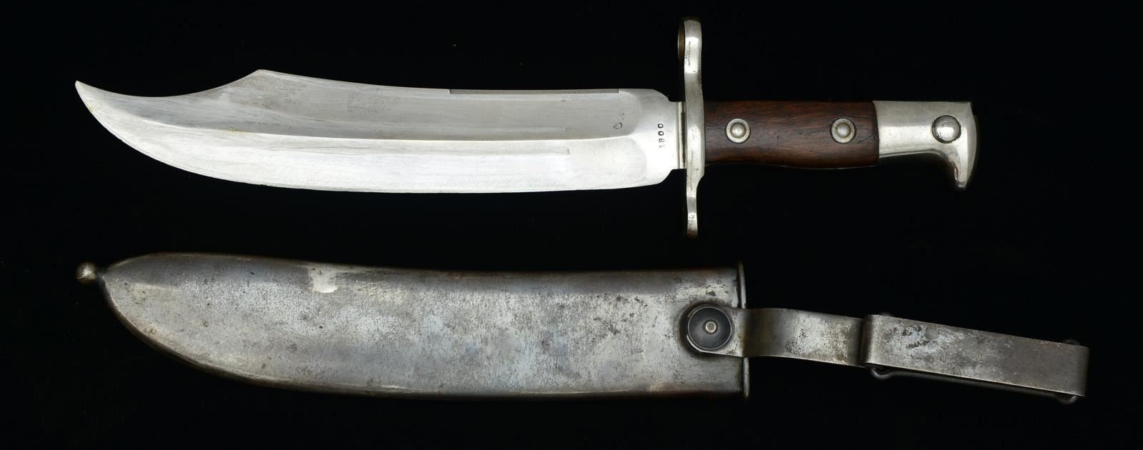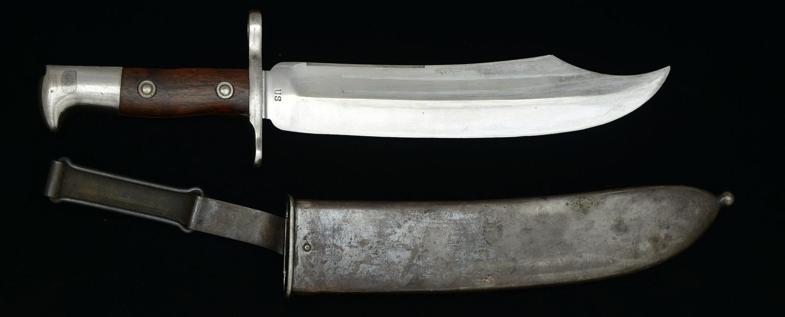 Overall length: 14 5/8". Blade length: 9". The clipped point bowie style blade is stamped at the ricasso, “US” & “1900”. Steel crossguard & pommel w/ 2 piece wooden grips held on by 2 steel rivets on each side. Blued steel scabbard w/ blued steel swivel belt clip. A difficult to find experimental bayonet made for the Krag rifle that did not pass trials & was not adopted for general issue. CONDITION: blade shows areas of original factory polish w/ some scabbard wear & light sharpening marks. Hilt shows very light wear w/ no oxidation. Scabbard shows minor loss of finish. (02-15020/BF). $1,500-2,000.