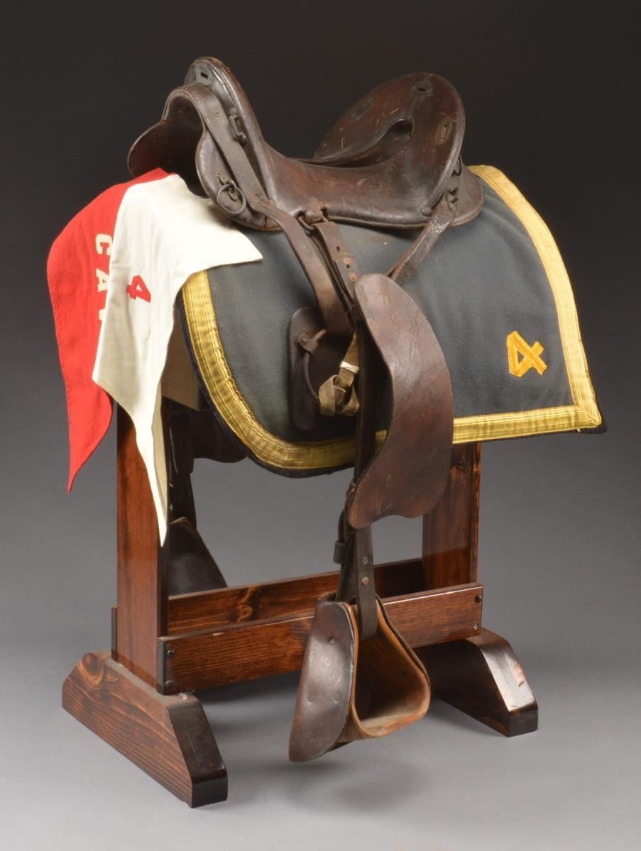 THE 4TH US CAVALRY. A fine example of a military issue brown leather McClellan type saddle dating sometime in the first quarter of the 20th century. The saddle has an unmarked front shield w/ screwed in loops & rings in front of the seat. The stirrups are single ply leather w/ embossed “US” in oval on the front covering the wooden foot holds. The back of the seat is marked on each side, “E/35”. The blanket measures approx. 28" x 36" at its widest points. The blanket has 1 1/2" gold trim & each rear corner has a 3 1/2" gold & yellow “4”. The blanket is blue w/ a central 3 1/2" black stripe. The blanket is edged w/ black & backed w/ brown wool. The red & white swallow tail guidon measures 15 1/2" in height & nearly 21" to each peak. The top white half has a red “4” centrally located & the lower red half has a white “C A V” centrally applied. The 4th US Cavalry has quite an illustrious history including significant service during the Philippine Insurrection. In 1907 they were reassigned to Ft. Meade, South Dakota w/ part of the regiment going to Ft. Snelling, MN. In 1911 the 4th Cavalry was sent to the Mexican border & in 1913 departed for Schofield Barracks, HI where they served throughout WWI. In 1919 the regiment returned to the Mexican border & subsequently back to Ft. Meade, SD. Judging by the construction of this saddle, it likely dates between 1900-1920. UNATTACHED ACCESSORIES: a binder containing research on the 4th Cavalry. CONDITION: the saddle shows light to moderate wear overall & displays very well. The blanket also shows light to moderate wear but colors remain vivid. The guidon shows light wear & a few very minor tiny stains. (02-15036/BF). $500-700.