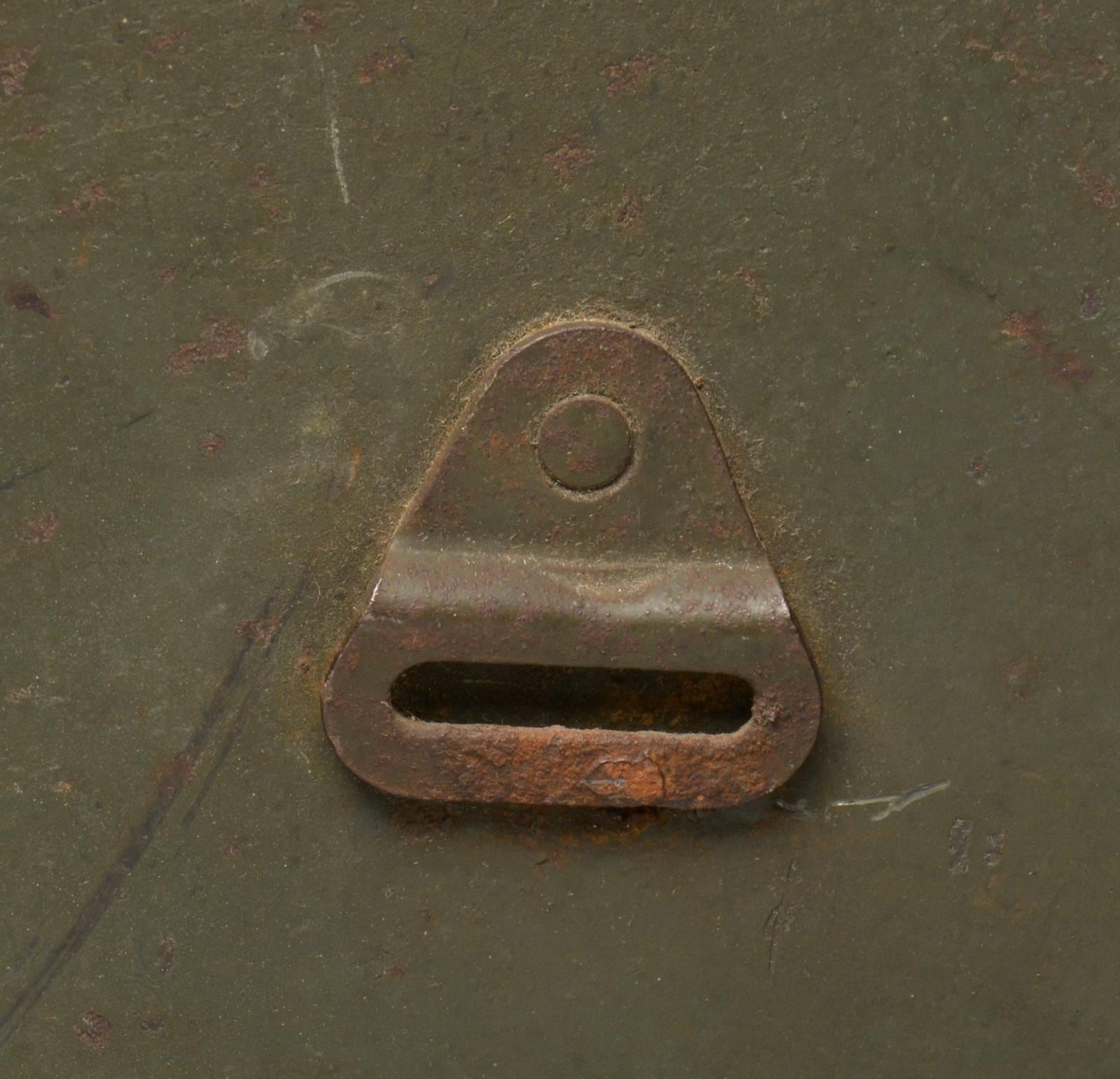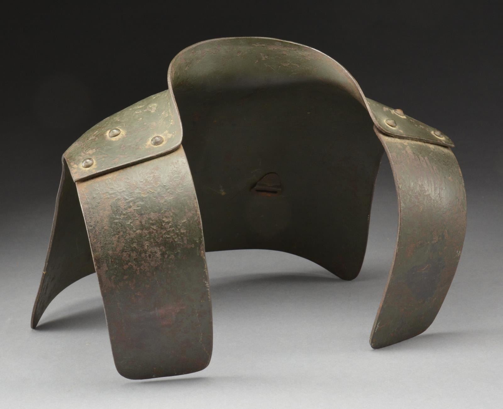 Issued in large quantities subsequent to 1916 know as "SAPPENPANZER" in German. Armor is marked in lower inside left corner w/ interlocking circles indicating Krupp mfg., "K" & "64". This armor originally had abdomen & groin plates suspended from the chest plate by web straps & padded w/ felt pads to deaden noise used also in conjunction w/ hinged armored visor which attached to the "Horns" on the helmet. This armor was too heavy for many uses & was used primarily by sentries & machine gun crews. The lower plates & suspension are not present, however the chest plate has the inside loops still in place. The armor has backstraps attached by rivets. CONDITION: armor has nice appearance w/ good amount of original dark grayish green paint w/ wear, light oxidation & patina. Has small areas of white paint. (02-15324/RW). $400-600.