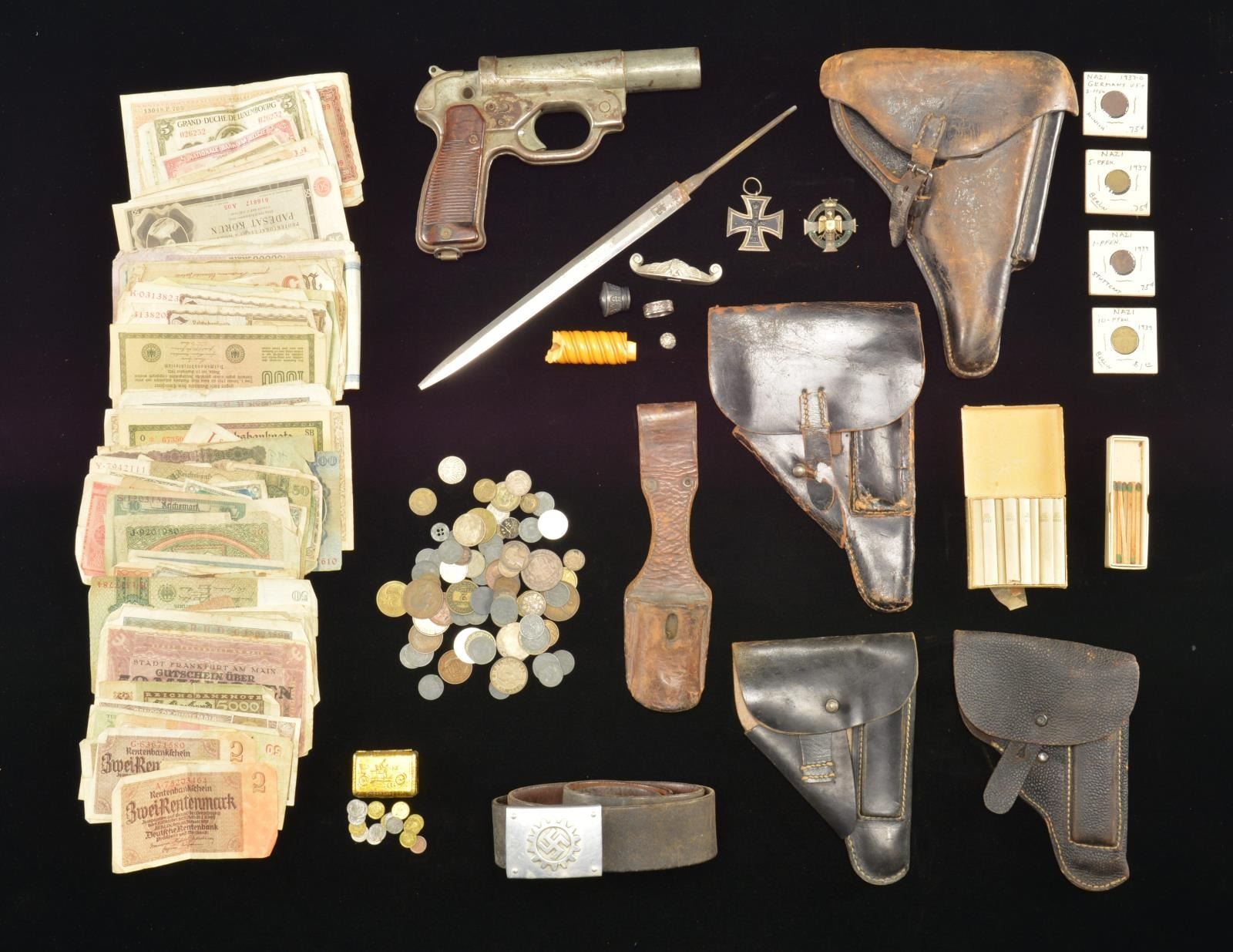 This group consists of 1 Luger holster. / 1 DAF belt & buckle. / 2 Luger holsters in damaged condition. / 2 PPK holsters. / 1 Box of chocolates. / 1 Box of cigarettes. / 1 Box of matches. / 1 Piece of German camouflage parachute. / 1 Piece of fabric taken from a downed barrage balloon. / 1 Lg. bag of paper money including a few occupation notes. / 1 Lg. bag of WWII German coins as well as coins of other nations. / 1 LP42 Flare gun. / 1 Frog for a police bayonet. / 1 WWI 2nd Class Iron Cross, no ribbon. / 1 1914 German Imperial badge. / 1 Blade, crossguard, pommel & ferrule for an Army dagger along w/ a portion of the grip. CONDITION: all items show light to moderate wear except as noted. (02-14388/BF). $800-1,200.