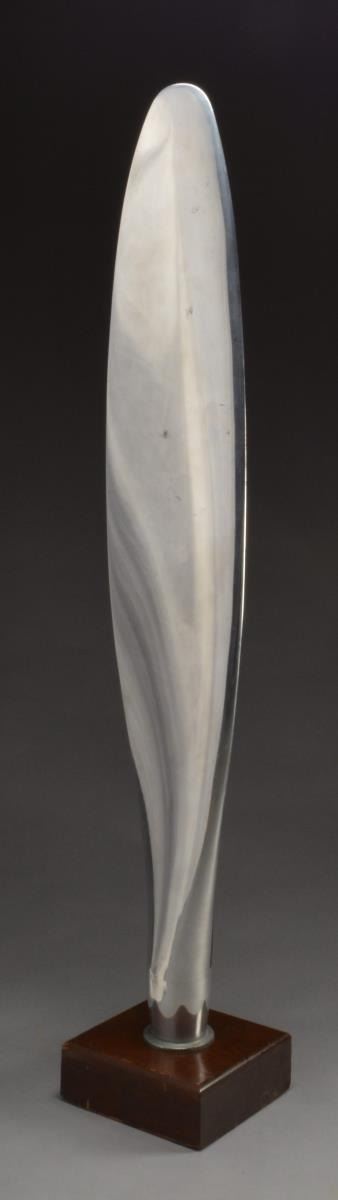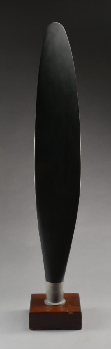 A very rare left engine propeller blade for the famous WWII fighter known as a P-38 Lightning. The Lockheed P-38 Lightning was a single seat United States Army Air Corps fighter developed during World War II. The P-38 had twin booms on either side & a central nacelle housing the cockpit as well as armament. The Germans called the P-38 “the fork tailed devil”. The propeller measures 66 1/2" in length & is solid aluminum. It was produced by Curtiss Electric for Lockheed. This propeller has been painstakingly sanded & polished to a mirror like finish on the front & a black matte finish on the back. The propeller features elegant curvature & presents an esthetically attractive form becoming a true objet d’art. This aeronautical sculpture is fitted w/ a custom made wooden base & would present a stunning display in a business, museum, gallery or private residence. CONDITION: propeller shows only light handling wear. (02-15034/BF). $3,000-5,000.