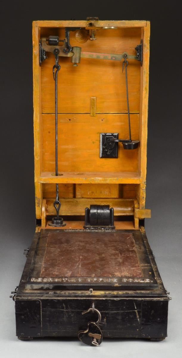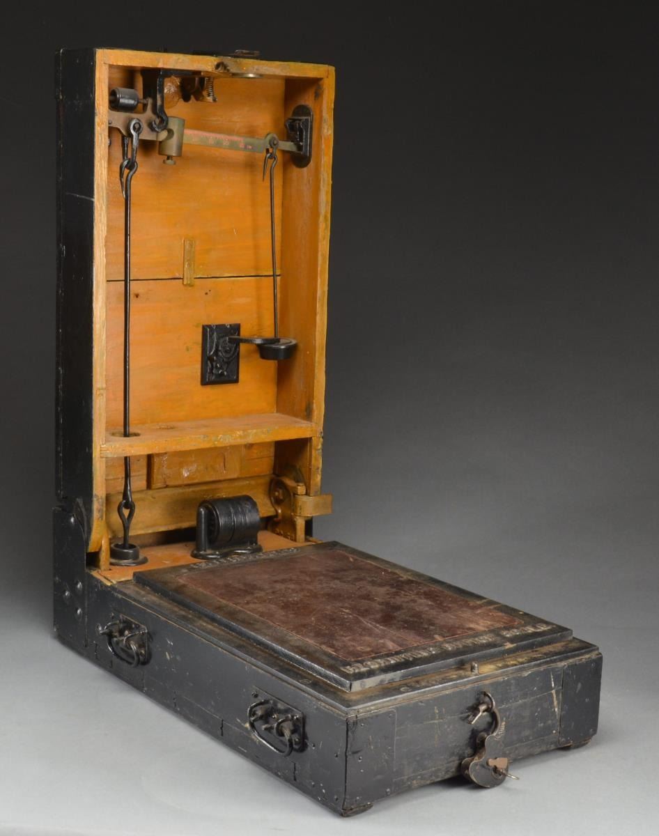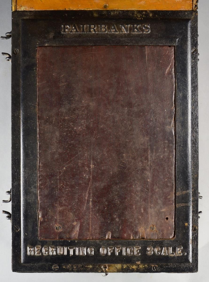 This lg. cast iron & wood folding, transportable recruiting scale measures approx. 28" x 15" x 9 1/2" when closed. The exterior is painted black. The interior houses a base & mechanism for weighing recruits for the military. The interior wood is painted a dull yellow & the metal is painted black. The platform that the recruit would stand on is embossed, “FARIBANKS RECRUITING OFFICE SCALE.”. CONDITION: scale appears to be complete & in functioning order. It shows light wear overall. (02-14467/BF). $300-500.
