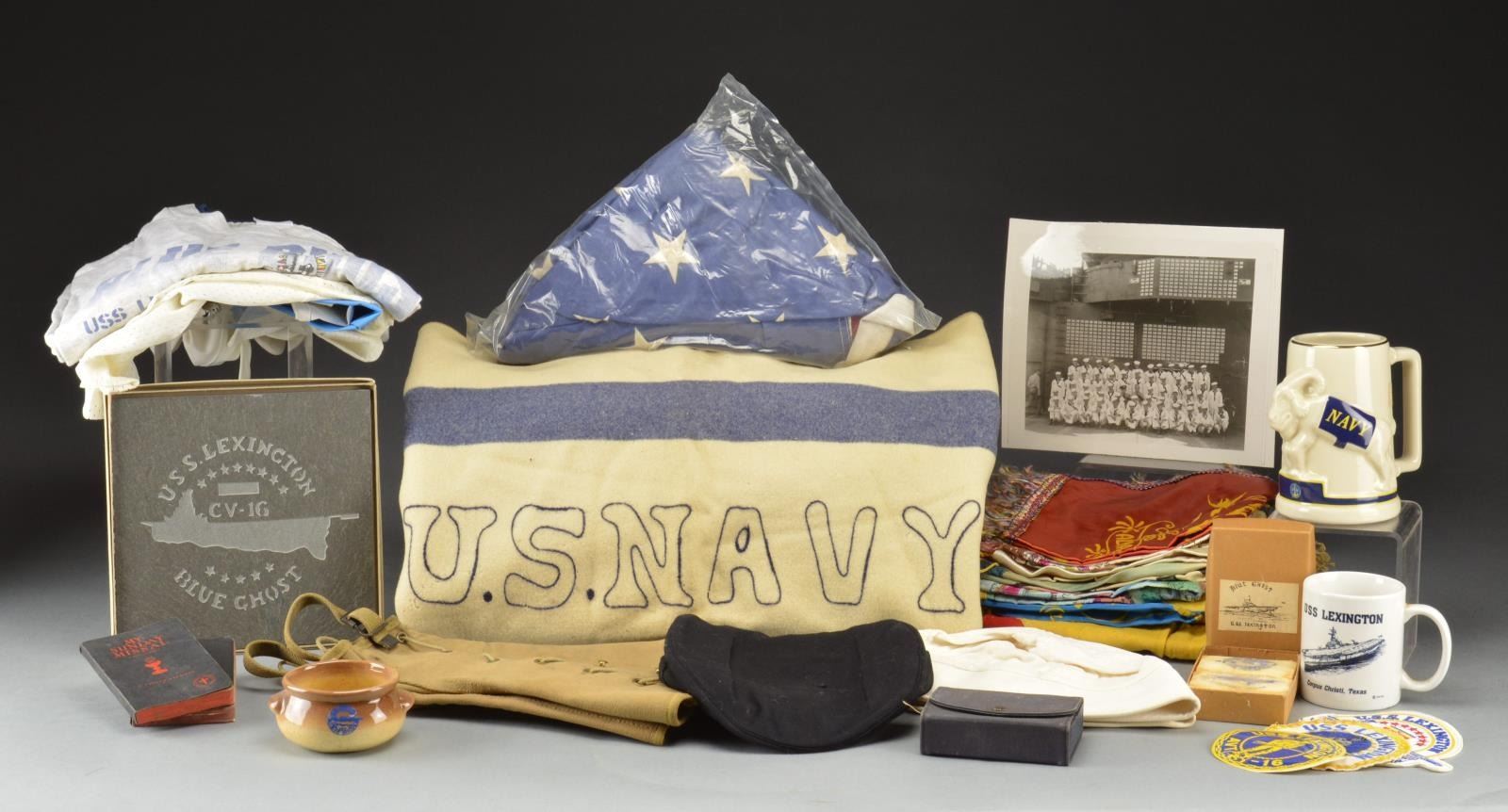 This group includes 1 Naval blue uniform. / 1 Naval white uniform. / Several Navy neckerchiefs. / 1 White blanket w/ blue stripe embroidered, “USN”. / 6 Silk souvenir pillow covers. / 1 Pair of canvas puttees. / 1 USN “Donald Duck” hat. / 2 USN white hats. / 1 Lg. yellow & red signal flag. / 6 Souvenir silk handkerchiefs. / 2 Bibles titled, “My Sunday Missal”. / 1 US flag that flew over the US Capitol & on the USS Lexington. / 2 USS Lexington patches. / 2 USS Lexington decals. / Crew photographs of the USS Lexington. / 1 Sewing kit. / 1 Photo of the starboard watch of the USS Lexington at Lakewood Country Club in Long Beach, CA on Jan. 8, 1946. / 2 Discharge copies for James Mahometa, a boilermaker 3rd class on the Lexington. / 2 Modern plastic mugs from the USS Lexington reunion. / 1 Sm. jar from the USS Lexington. / 2 Bars of soap from the USS Lexington. / 2 Pennants from the USS Lexington. / 4 shirts from the USS Lexington. / 1 Apron from the USS Lexington. / 1 Bag from the USS Lexington. / 1 Decorative slate tile from the USS Lexington. / 1 Coffee cup from the USS Lexington. / 1 Box of various assorted souvenirs from Lexington reunions, as well as publications & correspondence about the USS Lexington, its crew & reunions. CONDITION: all items show light to moderate wear. (02-14434/BF). $200-400.