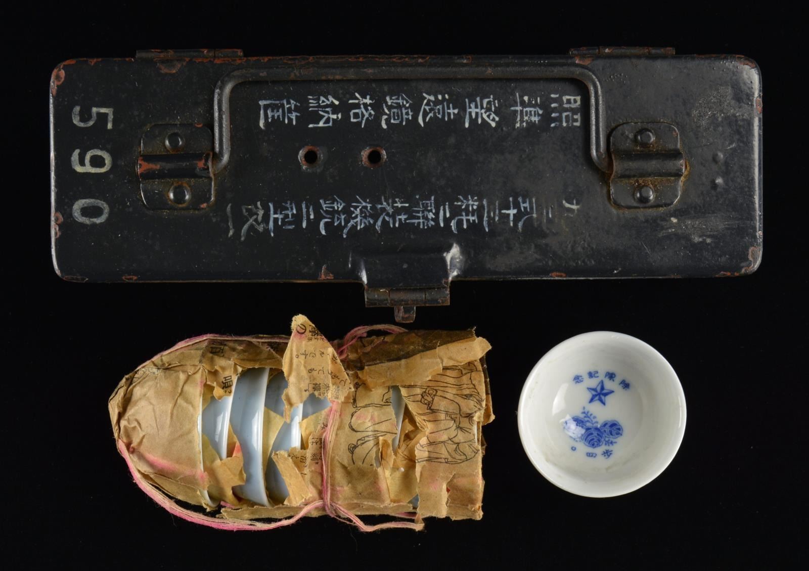 These extraordinary sake cups survived in the original wrapper & twine from the factory. They are embossed on the outside w/ Japanese fans & have a light blue outside color combined w/ darker blue interior decoration. The cups were produced for the 40th Japanese Infantry Division that was also known as the Whale Division. The Division was in existence from 1939-1945 & fought in Korea, Manchuria, as well as against the Soviet Army. They also served in various capacities in defense of the homeland. The cups are housed in a metal WWII period Japanese equipment box measuring approx. 8" x 2 3/4" x 3 1/2". The box is painted black w/ numerous Japanese characters on the top. CONDITION: cups show little or no wear. Box shows only handling wear. (02-14932/BF). $250-400.