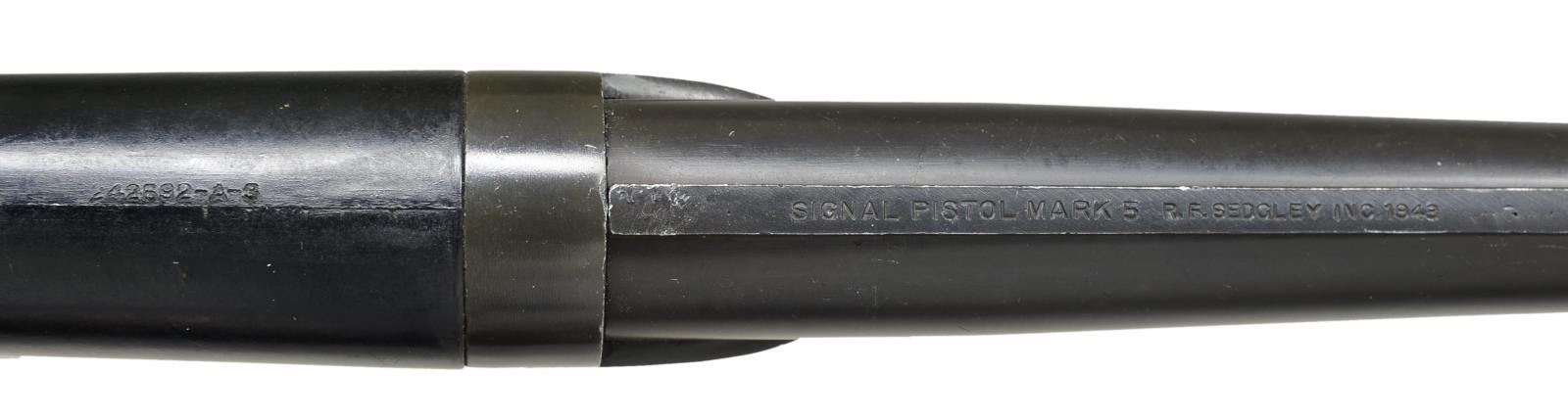 Cal. 10 Ga. S# 242692-A-2. Bbl. 6", marked on top "SIGNAL PISTOL MARK V" "R.F. SEDGLEY INC. 1943". Tip up action. Frame marked on the right side w/ encircled "S". Checkered composite grip marked on both sides "USN". Double action only trigger mfg. w/ out trigger guard. Lanyard ring on butt. CONDITION: pistol has high degree of original finish w/ very light high point wear. Bore has dark lightly oxidized appearance. (21-1355/RW). CURIO. $300-500.