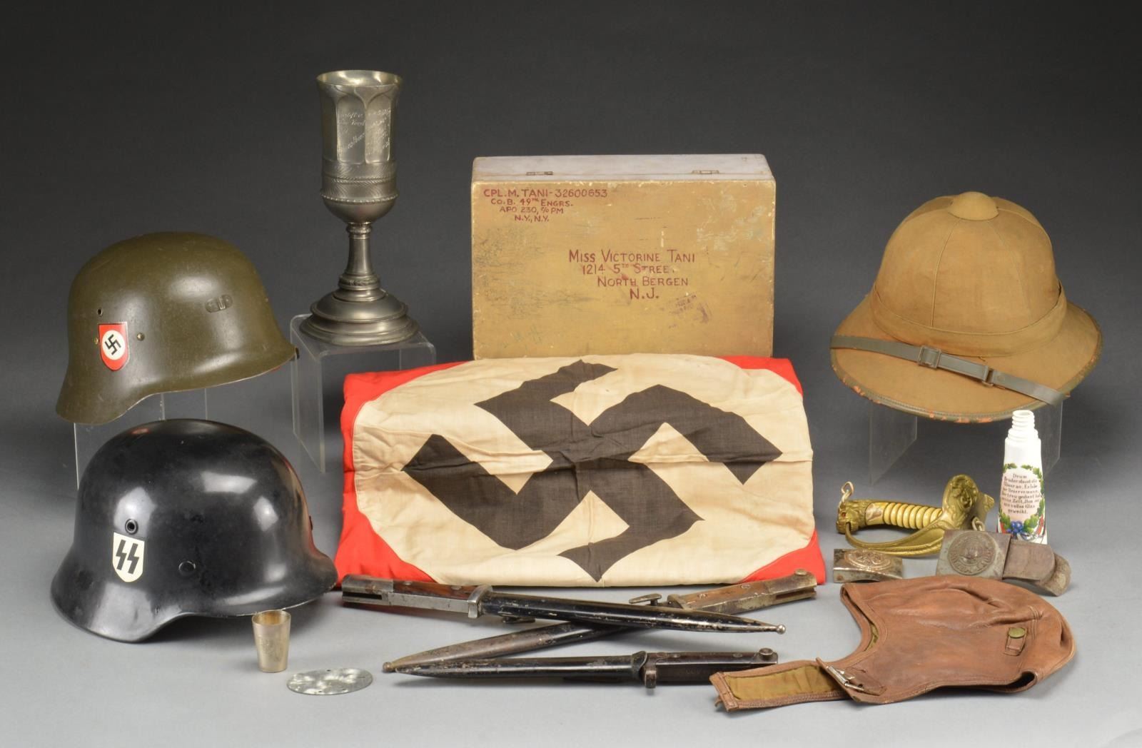 1) GERMAN MILITARIA. This varied lot includes 1 wooden box mailed from Germany by Corporal Tani containing 2 pictures presumably of him, a central rnd. black & white device from the center of a lg. DAF flag, a round black & white device from the center of a Party flag, a square black & white device likely from the center of a Hitler Youth flag, a black & a red & white Party flag measuring approx. 54" x 30", a black, red & white Party flag measuring approx. 47" x 29". / 1 Pre 1933 German flag measuring 15" x 10 1/2" missing the extreme lower corner. / 1 Hitler Youth sports shirt w/ RZM tag in the back. / 1 Hitler Youth armband. / 1 Sm. box of 8 reproduction WWII German helmet decals. / 2 Mauser K98 bayonets & scabbards. / 1 Italian M1938 folding bayonet. / 1 Post war helmet liner. / 1 Flight helmet of unknown nationality. / 1 Hilt & grip for a WWII German naval sword. / 1 Pewter chalice having German writing on the front. / 1 Army belt buckle. / 1 Hitler Youth belt buckle. / 1 Commemorative military porcelain bottle dated 1906-09, missing stopper. / 1 German dog tag showing oxidation. CONDITION: all items show light to moderate wear except as noted. (02-14455/BF). 2) WWII GERMAN FLAGS, PITH HELMET & 2 REPRODUCTION HELMETS. This group includes 1 Afrika Corps pith helmet in canvas, both side shields are missing. / 1 German Kreigsmarine battle flag measuring approx. 94 1/2" x 53 1/2". Hoist is marked “(eagle) / M Reichskriegsflg 1.5x2.5". / 1 Red, white & black Party flag measuring approx. 52" x 28 1/2". / 1 Red, white & black Party flag measuring approx. 99 1/2" x 46". / 1 Red, white & black Party flag measuring approx. 37 1/2" x 27". / 1 Reproduction SS helmet, no liner. / 1 Post war German style helmet having reproduction WWII decals on the outside. CONDITION: flags show fading & minor losses. Helmets show very light wear. Pith helmet shows moderate wear. (02-14497/BF). $700-1,100.