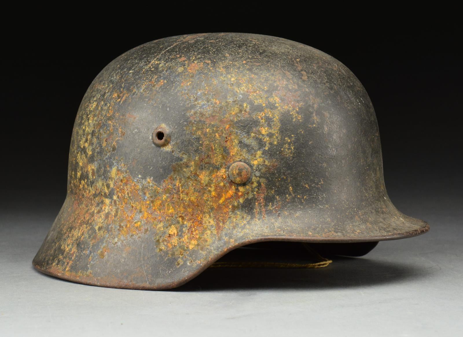 This helmet is a single decal type w/ original dark blue/gray finish. Embossed vent w/ rolled rim. Inside rear of helmet is stamped, “12 167”. Inside left is stamped, “hko64”. Tan leather 8 finger liner w/ the initial “K” penned in the back & size stamped “56”. No chinstrap. CONDITION: decal is about 85%. Helmet finish is about 70%. Liner shows wear but is complete. (02-15180/BF). $500-700.