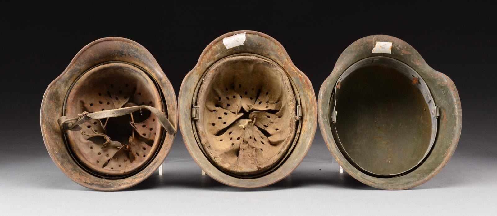 1) M1935. This helmet is a single decal Army & is finished in dark green. There is a single Army eagle decal on the left side. There is a stamp on the inside rear that is light & illegible. No stamp can be seen on the inside left because of oxidation. Full liner but no chinstrap. CONDITION: approx. 65% original finish. Decal is approx. 70% complete. Liner is very dry & shows some separations at the base. 2) M1940. This helmet is a single decal Army & is finished in dark green. There is a single Army eagle decal on the left side. There is a stamp on the inside rear that reads “D178”. A stamp on the inside left reads, “NS62”. Full liner & chinstrap. CONDITION: approx. 65% original finish. Decal is approx. 70% complete. Liner & chinstrap are quite dry & show minor insect damage. 3) M1942. This helmet is a single decal Army & is finished in dark green. There is a single Army eagle decal on the left side. There is a stamp on the inside rear that reads “415”. A stamp on the inside left reads, “ET64”. No liner or chinstrap but the band is present. CONDITION: approx. 60% original finish. Decal is approx. 60% complete. (02-15052-5(3)/BF). $900-1,300.