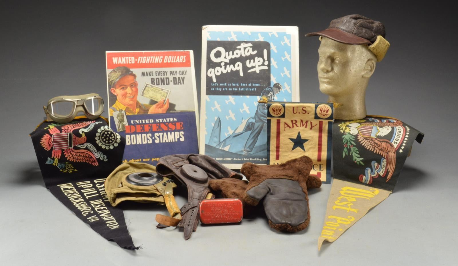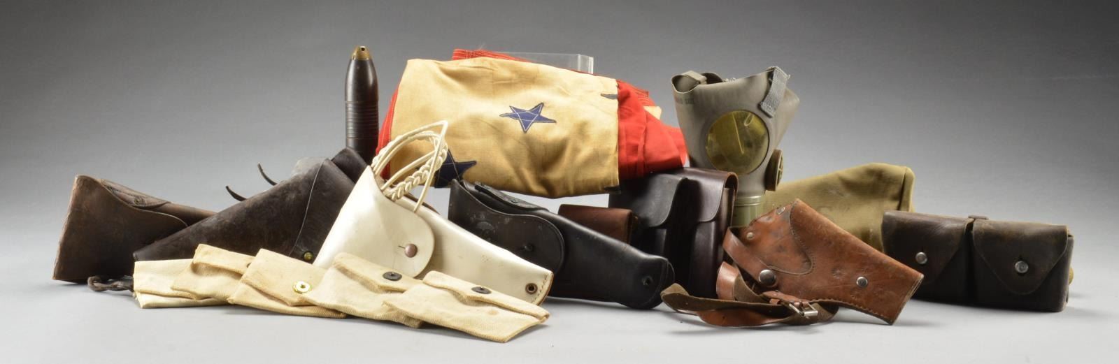 1) CBI PILLOW, HOLSTERS & OTHER MILITARIA. This group includes a wonderful, theater made, silver bullion CBI pillow face dated 1944. / 2 Noncombatant M1A2 gas masks in pouch. / 1 White equipment/pistol belt. / 1 Yellow equipment/pistol belt. / 1 Pair of winter mittens. / 1 Son in Service flag for a sm. town. / 1 48 Star American flag. / 1 White denim jacket w/ a hatching chick on the back. / 1 Sam Brown belt & shoulder strap. / 1 Pair of puttees. / 1 Overseas cap. / 4 Holsters for 45 Automatics. / 1 Colt revolver holster. / 2 Shoulder holsters. / 5 White canvas clip pouches. / 1 6 1/2" Artillery shell. / 1 6" Artillery projectile. / 1 White 45 Auto holster & white aiguillette. / 3 Leather clip pouches. / 4 European cartridge pouches. / 1 Bag of misc. straps, buttons & ribbon bars. CONDITION: most items show light to moderate wear. (02-14307/BF). 2) FLIGHT HELMETS & RELATED ITEMS. This lot includes 1 fleece lined leather flight helmet. / 1 Cotton Army Air Force flight helmet. / 1 Leather B2 flight hat. / 1 Pair of cold weather flight mittens. / 1 Leather flight helmet. / 1 Pair of earphones for a flight helmet. / 1 Pair of goggles in original case. / 1 Ear phone & microphone set for a flight helmet. / 1 Sweatband for an M1 helmet. / 1 Camo cover for an M1 helmet. / 1 Souvenir pennant from West Point. / 1 Souvenir pennant from Fort A.P. Hill, Fredericksburg, VA. / 1 WWI Son in Service banner. / 2 WWII posters w/ damage. / 1 Group of photo postcards. / 1 Pair of early aviation flight boots & their associated belt & flight helmet. / 1 Shoulder holster. / 1 Set of earphones. CONDITION: most items show light to moderate wear except as noted. (02-14381/BF). 3) WWII US MILITARIA, PHOTO ALBUMS, INSIGNIA, PATCHES & MORE. This group includes 1 fully stocked First Aid kit in canvas bag. / 1 Fully stocked First Aid kit in metal box. / Camouflage netting. / 1 Ax w/ 2 hunting knives. / 1 Rocket propelled grenade. / 1 Set of backstraps for a pack. / Armbands for an acting corporal. / 1 Son in Service flag. / 1 Army Air Corps engine cover. / 1 Green canvas bag. / 1 Panoramic photo. / Rank chevrons. / 2 Blue denim Civil Defense overseas caps. / 1 Silk souvenir pillow from WWI. / 1 WWI sewing kit. / 2 Lg. bags containing numerous military rank, divisional insignia, cap badges, collar insignia, ribbon bars & much, much more. / 1 Set of Iraqi "most wanted" playing cards. / 2 WWII Pacific Theater photo albums. / 1 Book on the 21st United States Infantry. / 1 Booked titled, “Seamen”. / 1 Leather belt. / 1 Lg. group of post cards & photographs. / 1 Silver star medal box. / Several WWII newspapers. CONDITION: most items show light to moderate wear. (02-14427/BF). 4) MILITARIA & RELATED ITEMS MOSTLY OF WWII. This varied group includes 1 WWII mess tin. / 2 Overseas caps. / 1 Shrapnel chunk. / 1 Gavel. / 1 Artillery shell base w/ volcanic rock. / 1 Lg. bag containing various divisional & rank insignias well as collar insignia, dog tags, hat insignia, qualification badges, Civil Defense patches & more. / 1 Bag containing WWII photos from an individual including his formal Army portrait. / 1 Lg. bag containing military medals, rank insignia, divisional & rank patches, occupation money, collar insignia, ribbon bars, qualification badges & more. CONDITION: most items show light to moderate wear. (02-14506/BF). $900-1,400.