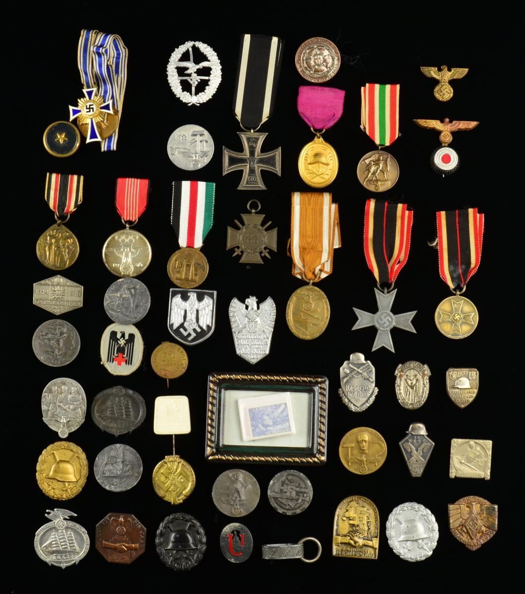This varied lot includes 1 Westwall medal. / 1 War Merit medal. / 1 War Merit Cross, no swords & having an improper ribbon. / One 1914-1918 War Service Cross with swords. / 1 Italian/German Afrika Korps medal. / One 1936 Olympic medal. / 1 Gold Mother’s Cross. / 1 WWI Iron Cross Second Class. / 1 Memel medal. / 1 Fire Brigade 40 Year Service medal. / 1 WWI Service medal. / 1 Police cap eagle. / 1 Navy cap eagle & cockade. / 1 Suspension ring & loop for an Army dagger scabbard. / Approx. 10 stamps. / 1 Red Cross patch. / 1 WWI Gold Wound badge. / 1 WWI Silver Wound badge. / 1 WWI Black Wound badge. / 24 Tinnies of various types & composition. 1 Has a missing eagle, a couple have missing pins. / 1 Eagle for a pith helmet. / 1 Badge for a Luftwaffe shooting lanyard. CONDITION: all items show light to moderate wear except as noted. (02-15134/BF). $700-1,000.